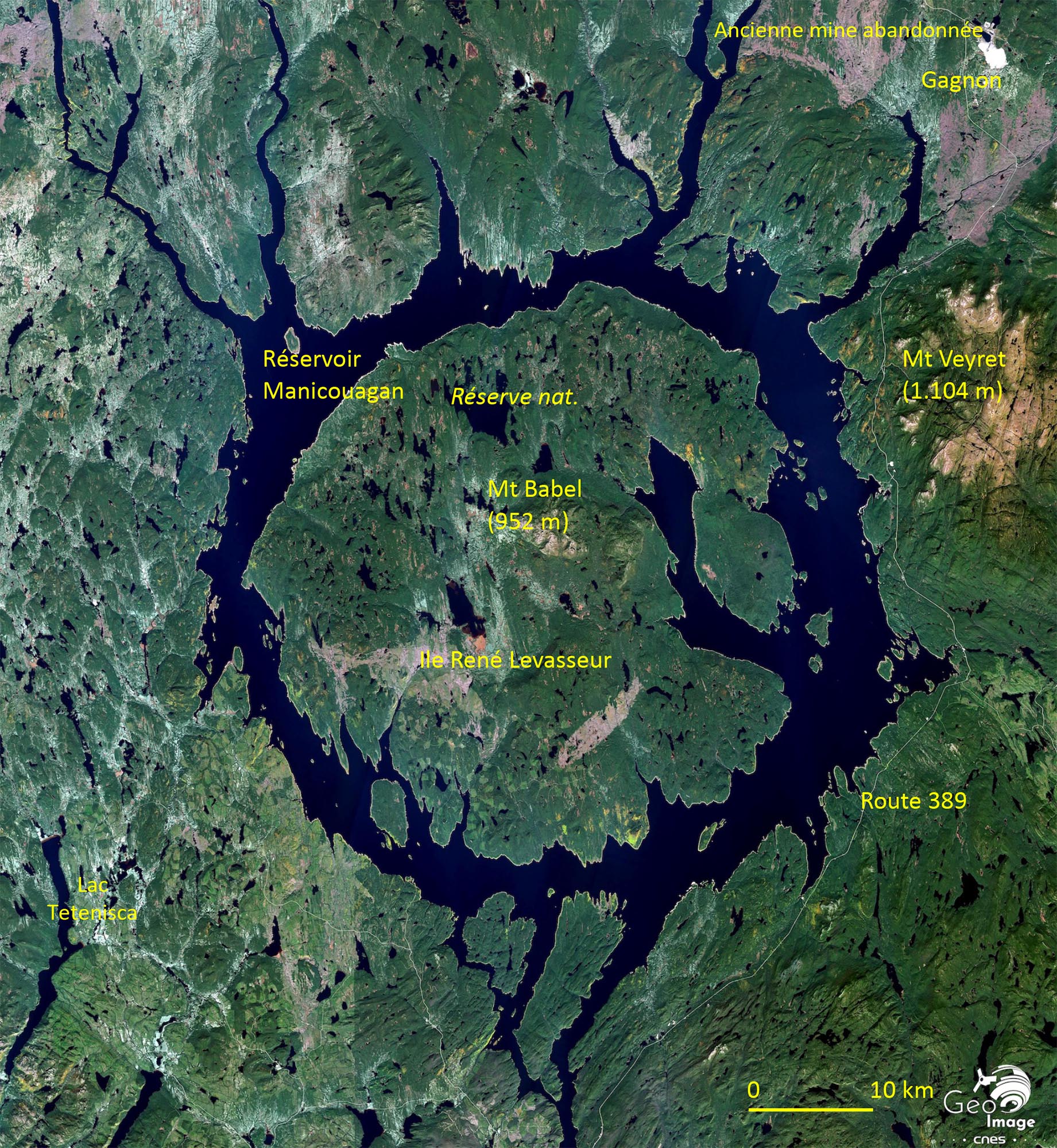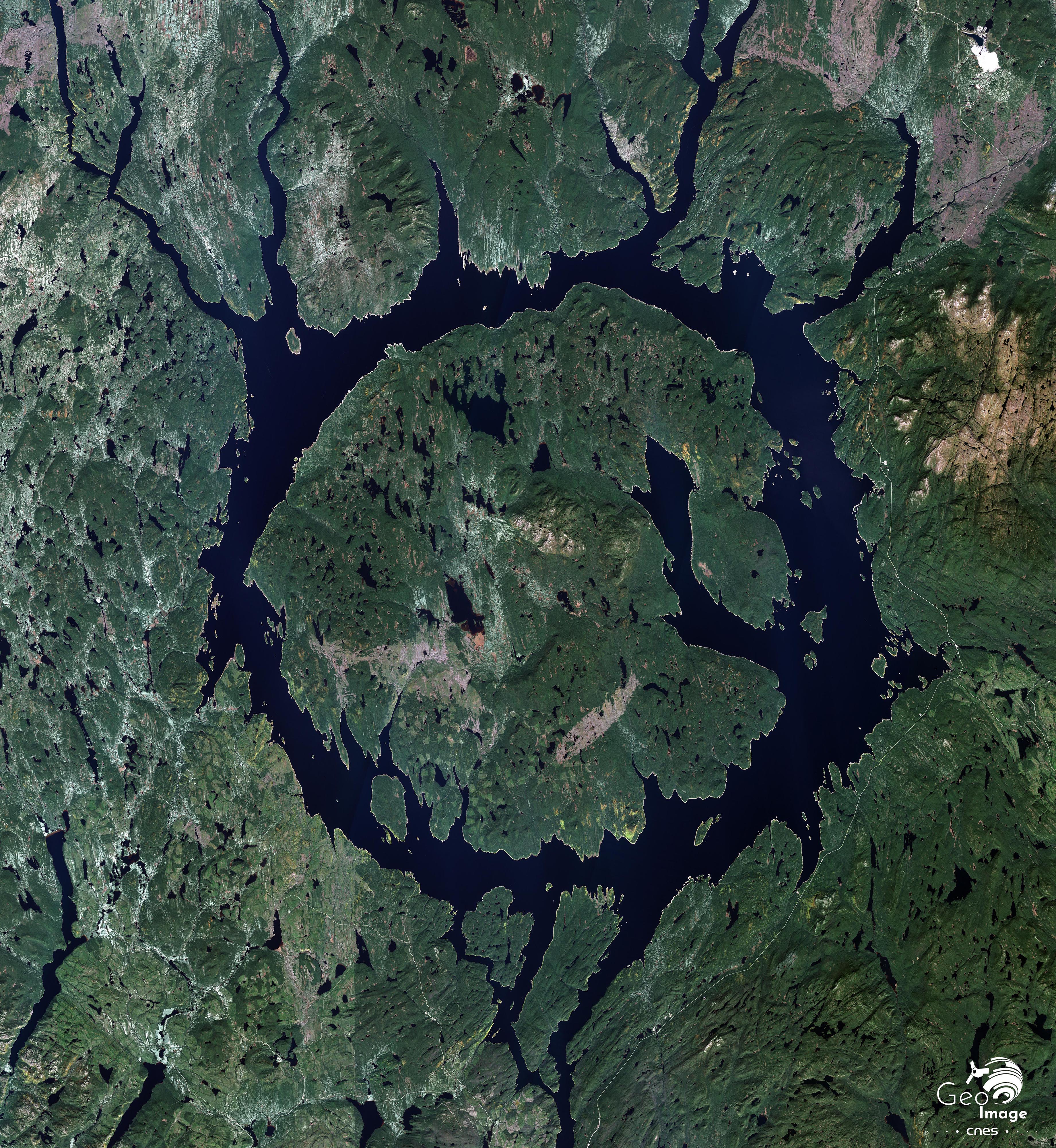 Celui-ci se trouve à une altitude moyenne de 360 m. Ce lac-réservoir est totalement artificiel et a été créé par la construction du barrage Daniel-Johnson, qui se trouve plus au sud (hors image, zooms suivants) en 1970. La création du réservoir s’est traduite par l’ennoiement d’une une vaste dépression topographique de forme circulaire bien visible sur l’image. La forme circulaire du réservoir qui lui vaut le surnom d’« Œil du Québec » est en effet bien visible, que ça soit de l’espace ou d’avion. Elle correspond à un cratère de 100 km de diamètres créé il y a 214 millions d’années par l’impact d’un gigantesque météoritique dont la taille est évaluée à 5 km de diamètre.