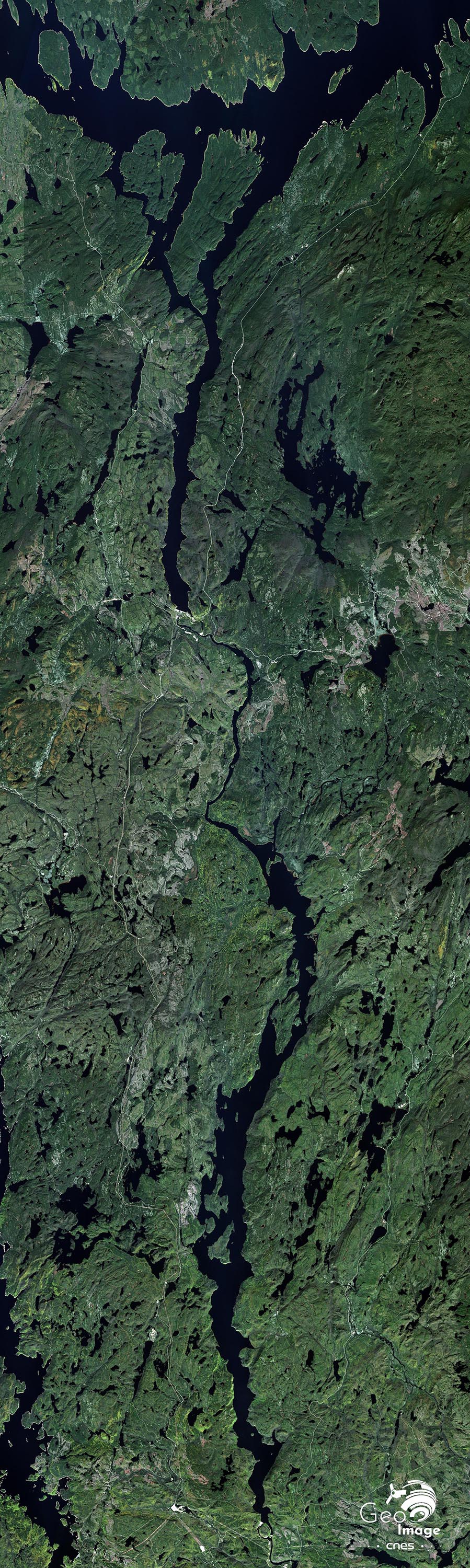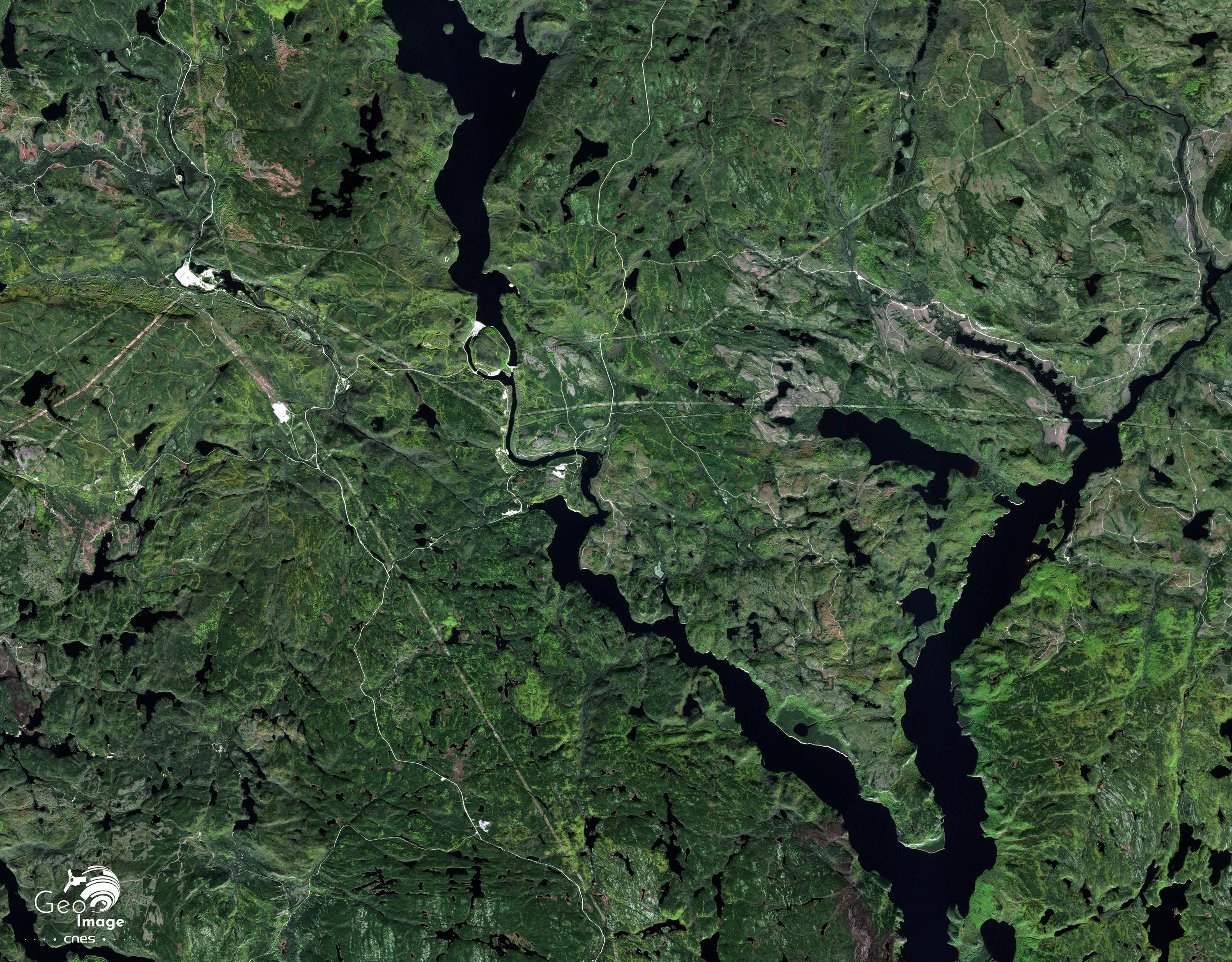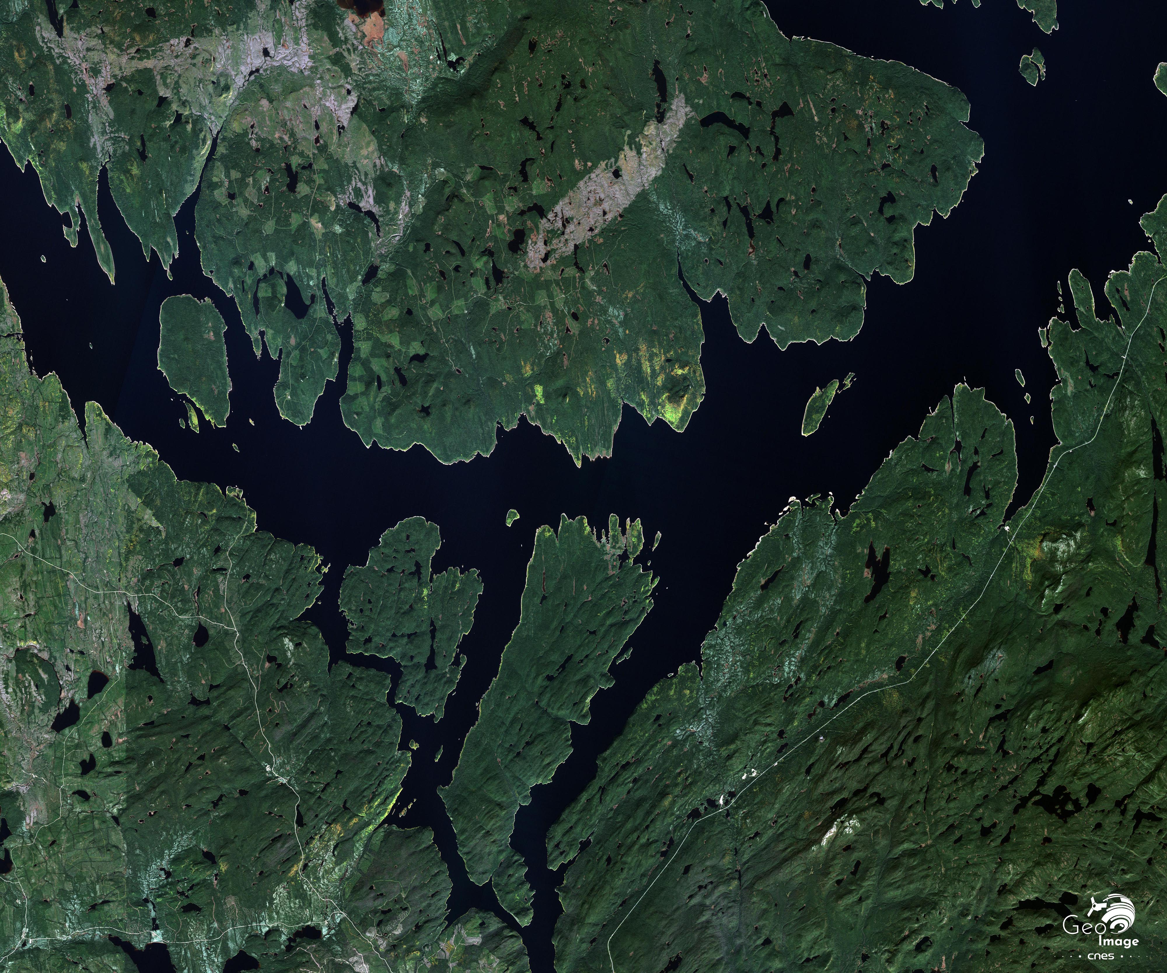 On est frappé par la mosaïque de couleurs de cet espace forestier. Globalement, le réservoir de Manicouagan est traversé par une limite bioclimatique bien repérable sur l’image. Au nord, la forêt est fortement dégradée et couvre mal le socle. Dans la partie sud au contraire, le couvert forestier est sensiblement plus dense. Les différents stades des coupes de bois et les différents stades des opérations de reboisement s’y traduisent par des intensités de verts bien différentes. Comme dans une large partie des marges québéquoises, l’exploitation forestière est en effet la principale activité traditionnelle, complétée par la chasse, la pêche et un peu de tourisme.