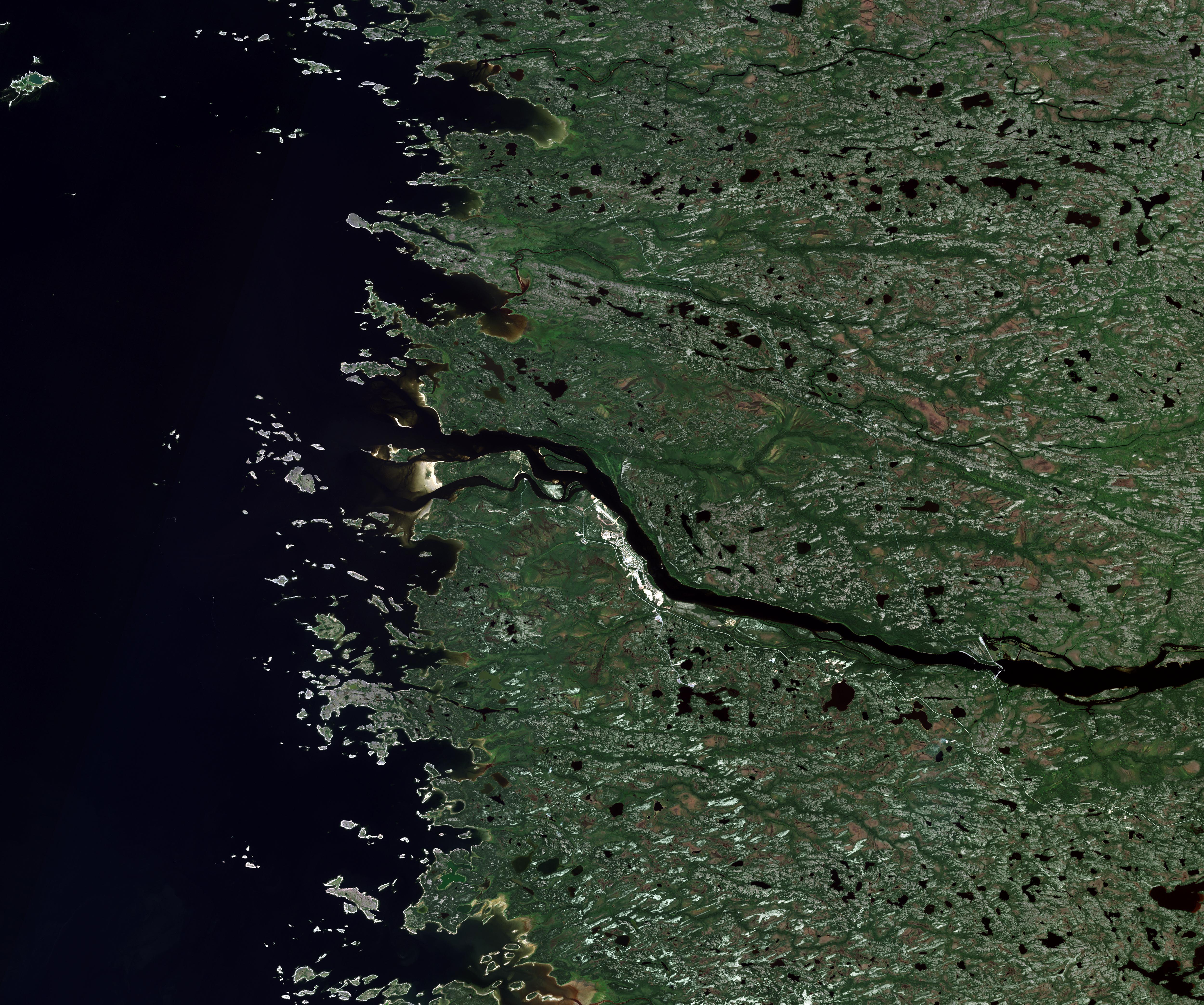 Comme on peut le constater, toute la partie ouest de l’image est occupée par une côte très déchiquetée, ourlée de nombreuses baies, petits caps, promontoires et îles. Nous sommes là sur le littoral oriental de la Baie James, une très grande baie qui continue vers le sud l’immense Baie d’Hudson, qui se trouve dans le nord-est du Canada.