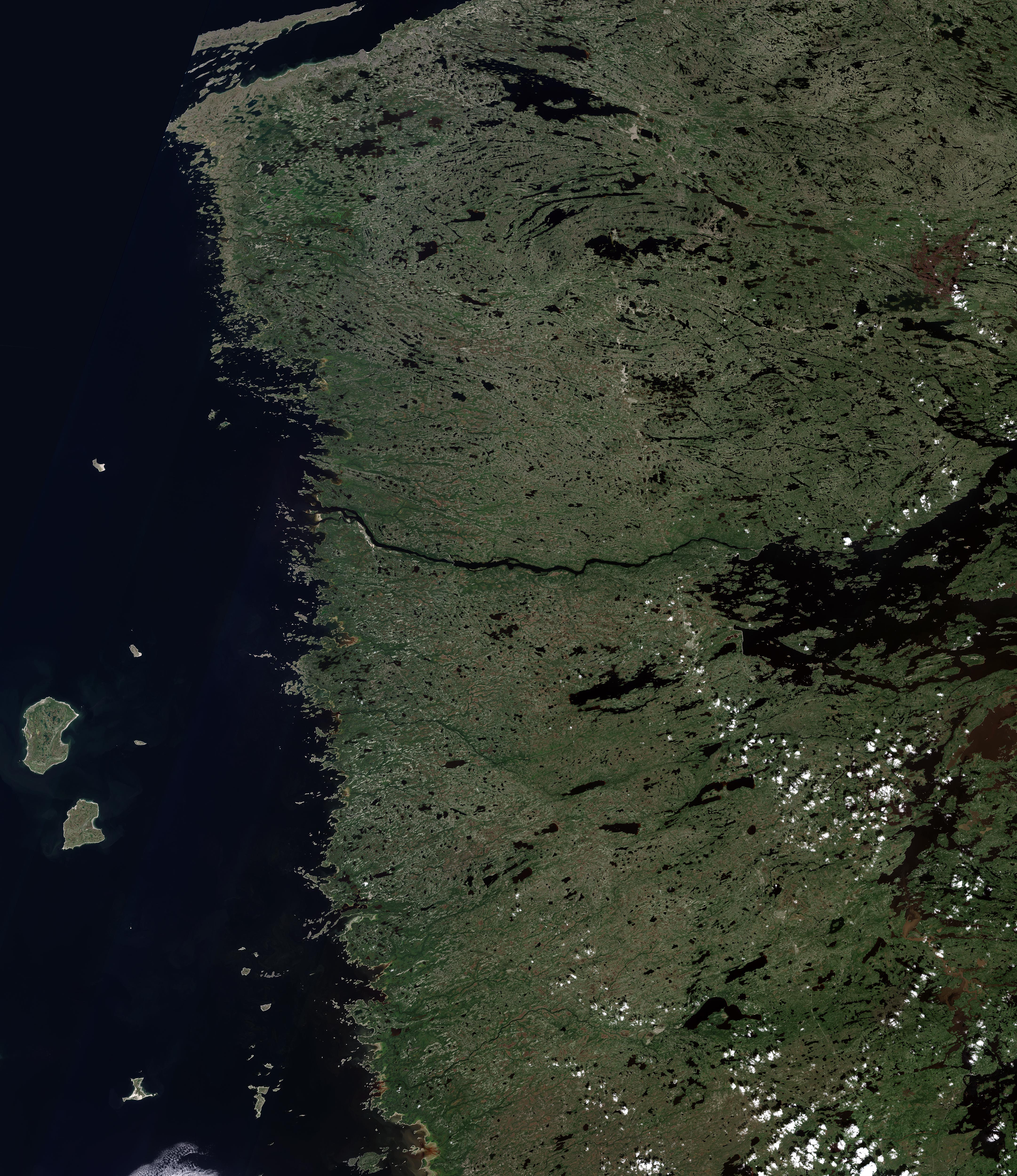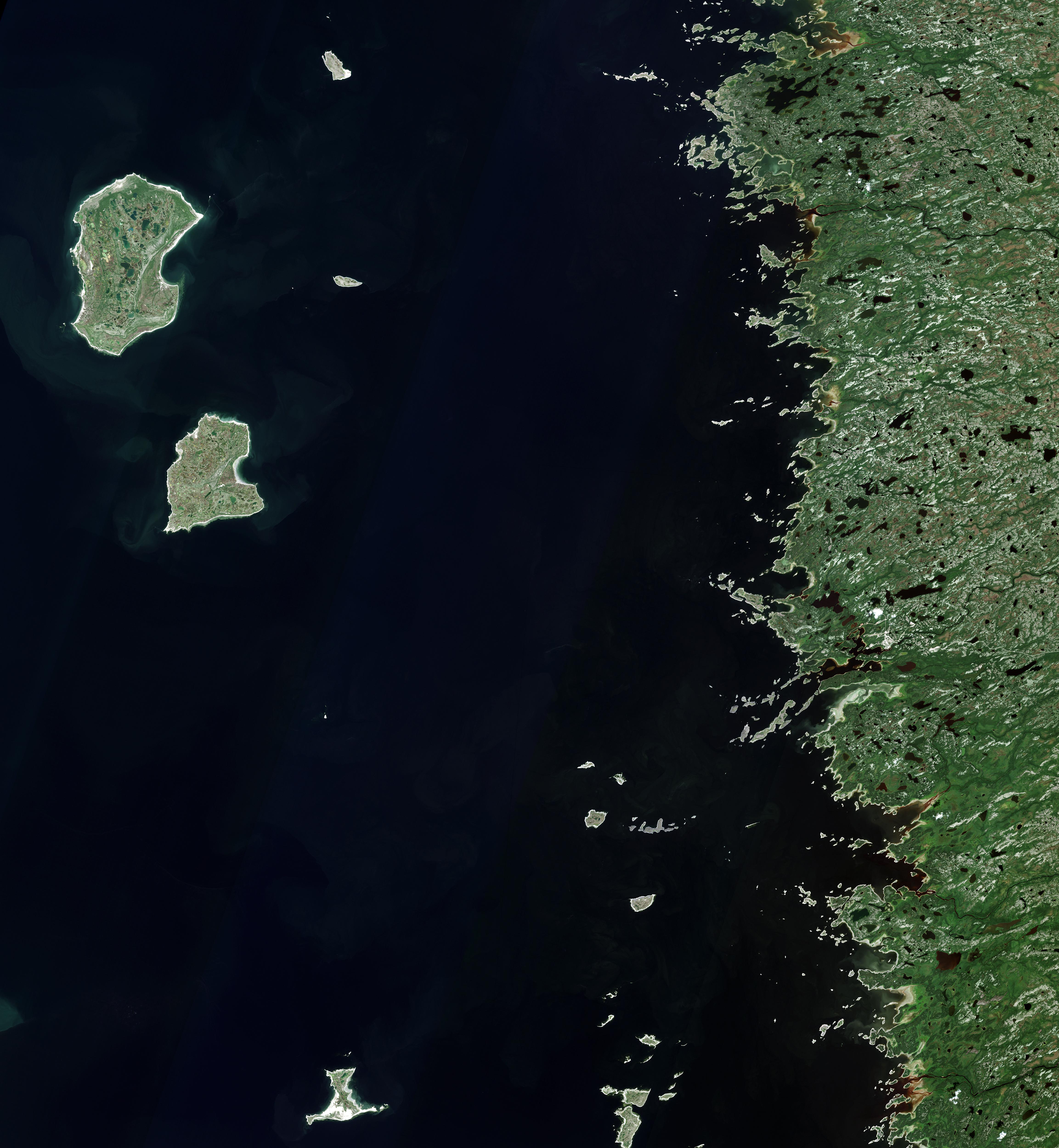 Cette image qui couvre 120 km Nord/Sud couvre la partie orientale du littoral de la Baie James, avec la présence en particulier des North et South Twin Islands. Du fait des basses altitudes, de la topographie, d’une structure de socle, des héritages du modelé glaciaire, de la faiblesse des marées et de la prise en glace des eaux une partie de l’année, la côte présente une structure particulièrement découpée (baies, criques, caps et îles). Trois rivières majeures, drainant le plateau intérieur lacustre, viennent se jeter dans la Baie James comme la Rivière au Castor ou la Rère du Vieux-Comptoir. Le seul îlot d’habitat repérable sur l’image par deux points blancs correspond à Wemindji, une municipalité de village Cri qui appartient au territoire d’Eeyou Istchee.