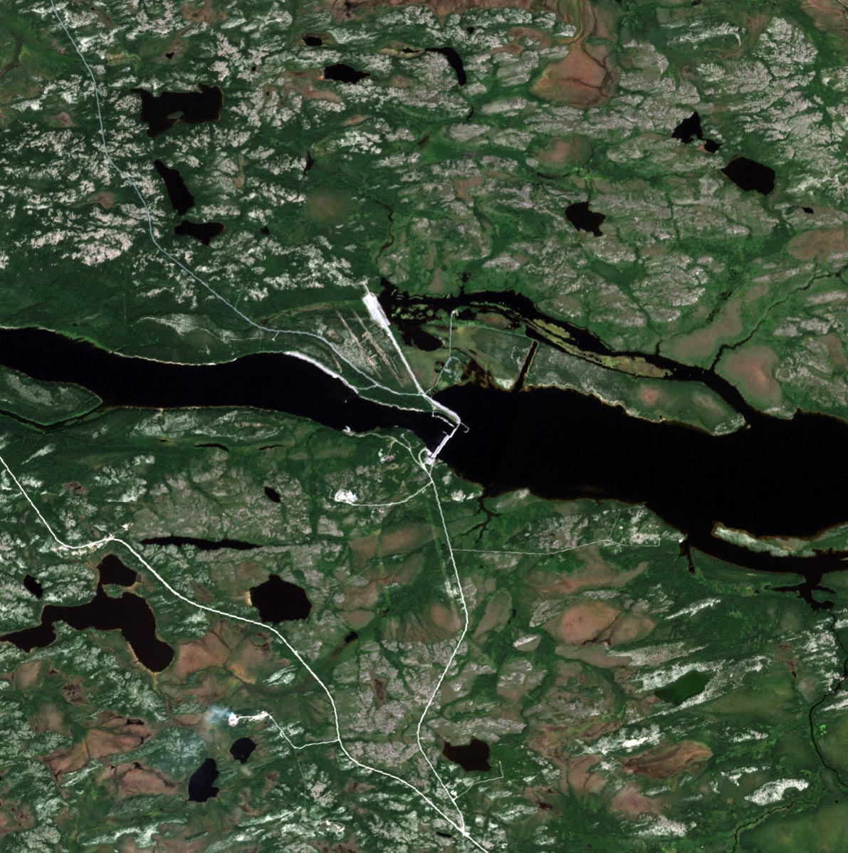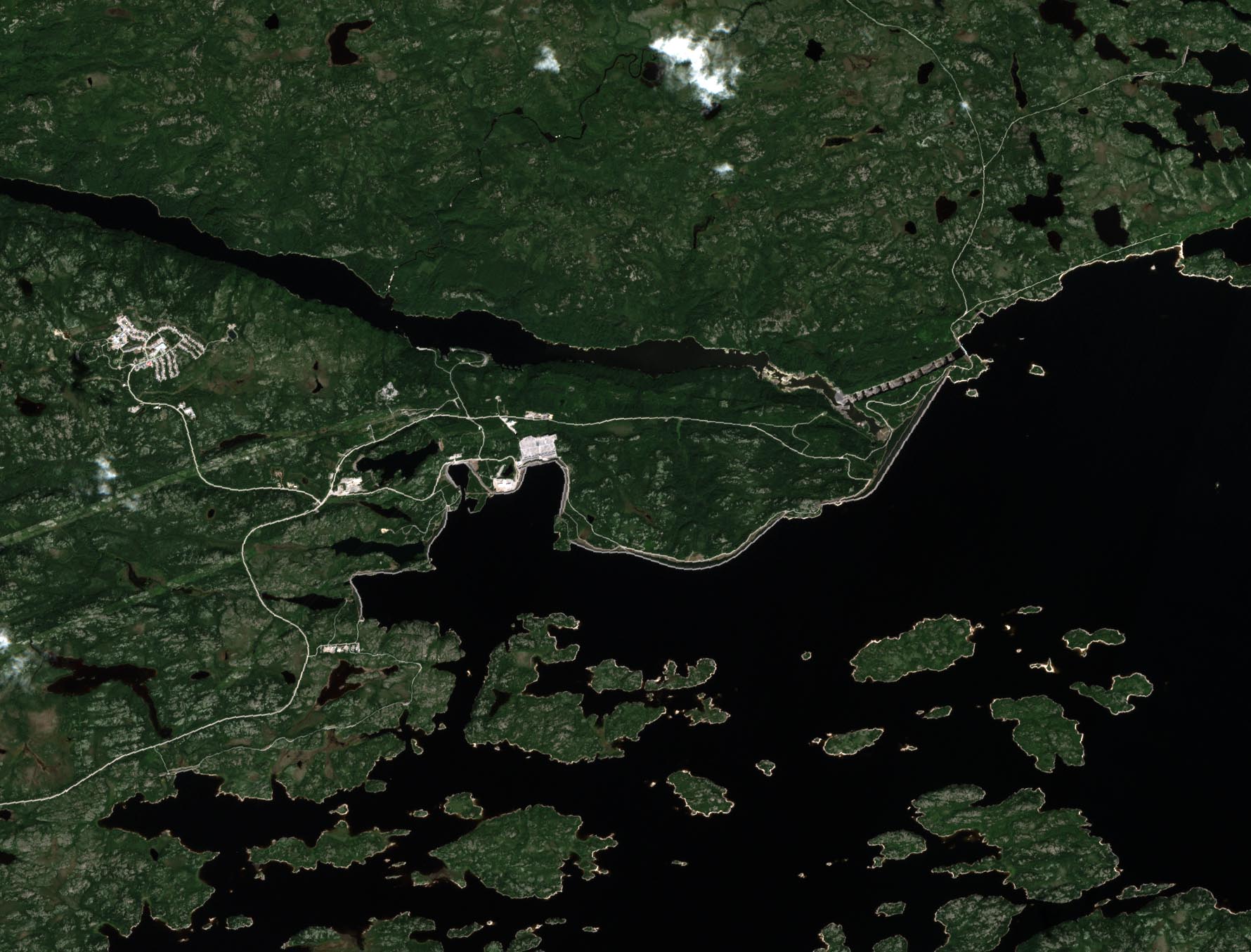 Nous sommes ici au sud-ouest du dispositif principal, bien visible avec Radisson dans l’angle de l’image. On aperçoit particulièrement bien la grande digue de plus de 9 km de long qui ferme ici un seuil topographique afin d’élever le niveau des eaux stockées. Dans cette marge, l’occupation humaine demeure ponctuelle, malgré les grandes opérations d’aménagement portées par ce gigantesque projet.
