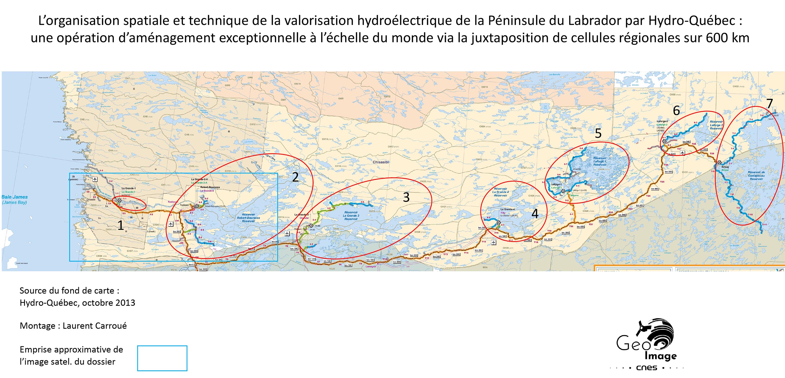 Le système régional est localement organisé par des îlots techniques spécialisés éloignés les uns des autres : base-vie de Radisson, postes électriques, aérodrome qui joue un rôle essentiel dans la connexion au Sud... On doit aussi relever les logiques réticulaires, bien visibles à travers d’un côté les vastes couloirs électriques des lignes à très haute tension qui emmènent l’électricité vers les grandes zones de consommation méridionales (Québec, Ontario, Etats-Unis...) sur des milliers de km ; de l’autre le réseau routier qui organise la liaison Nord/Sud et la circulation entre les différents sites d’exploitation.