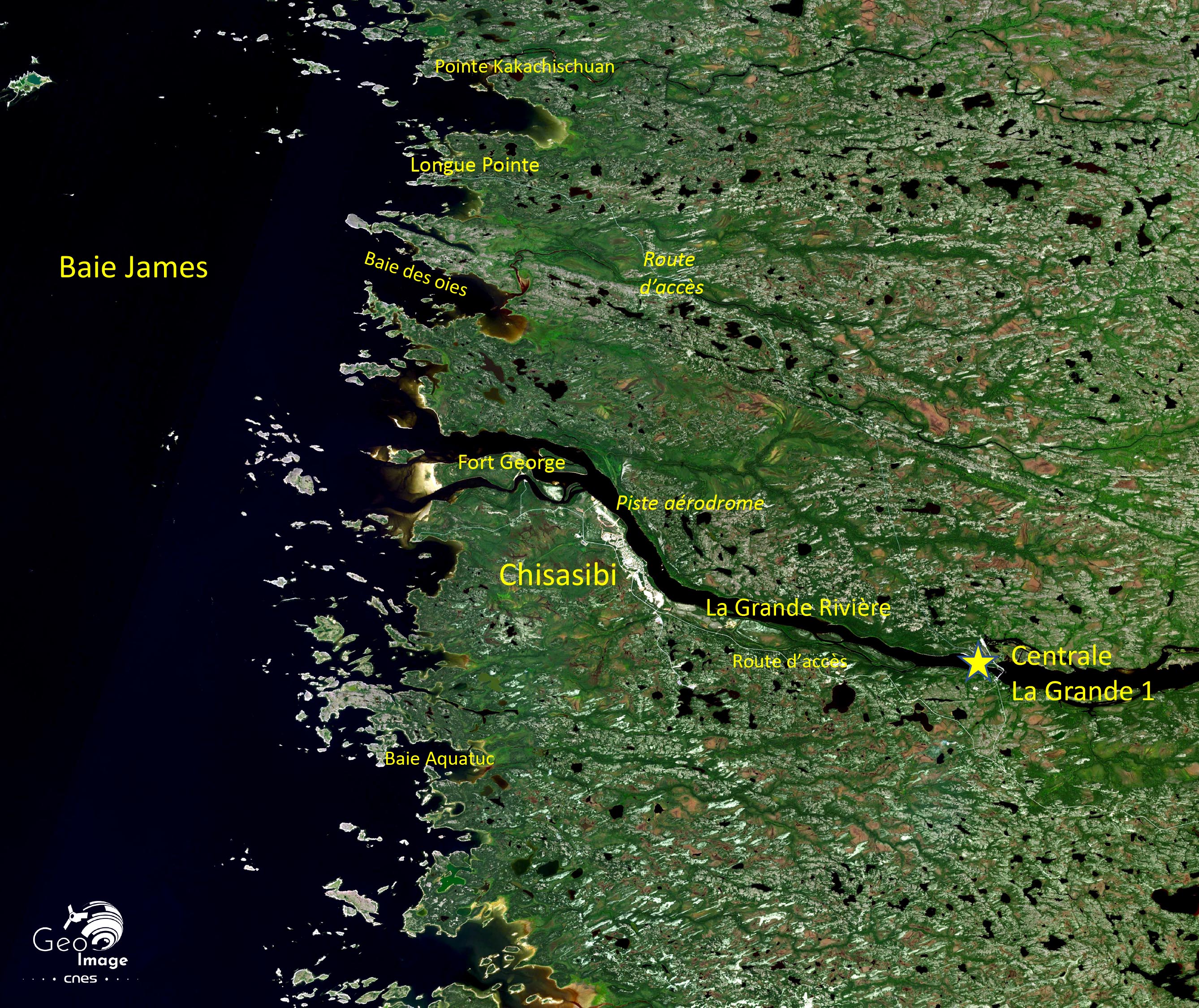A 80 km en descendant la rivière La Grande se trouvent successivement les installations de la centrale d’Hydro-Québec La Grande 1 puis 37 km à l’aval le village de Chisasibi. Posé à l’abri en bordure du littoral de la Baie James, il est peuplé d’Indiens autochtones Cris dont les territoires traditionnels de pêche, de chasse et de trappe couvrent une large partie de l’image. La construction de l’usine hydroélectrique de La Grande 1 nécessita le déplacement d’un millier de Cris de l’île de Fort George, fragilisée par les lâchers d’eau de la centrale, à Chisasibi, le nouveau village construit ex nihilo sur la rive gauche du fleuve à 8 km de l’ancien site littoral pour les accueillir en toute sécurité.