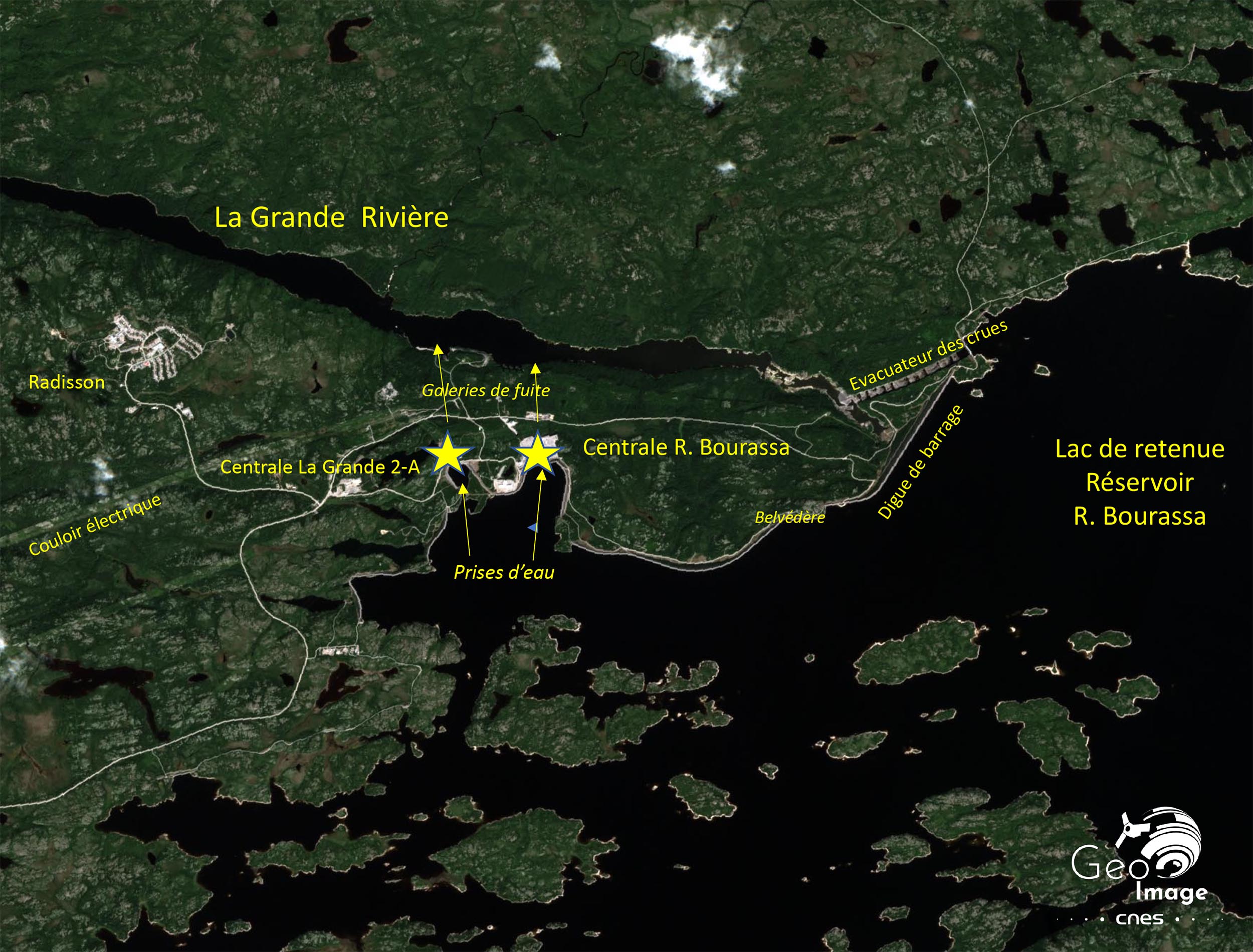Comme le montre l’image, trois centrales hydroélectriques sont visibles sur l’image. A l’amont, La Grande 1 est une centrale au fil de l’eau. A l’aval, les centrales de la Grande 2-A et Robert-Bourassa sont deux centrales souterraines cumulant 22 turbines et exploitant deux chutes d’eau de 136 m de hauteur. Elles sont alimentées par un immense réservoir qui porte le nom de l’ancien Première ministre du Québec et « Père de la Baie James » Robert-Bourassa. Entrée en service en 1981, ce complexe est aujourd’hui par sa puissance installée au 6em rang mondial des grands barrages, derrière le Barrage des Trois Gorges (Chine), d’Itaipu (Brésil/Paraguay), de Xiluodu (Chine), de Guri (Venezuela) et de Tucurui (Brésil).