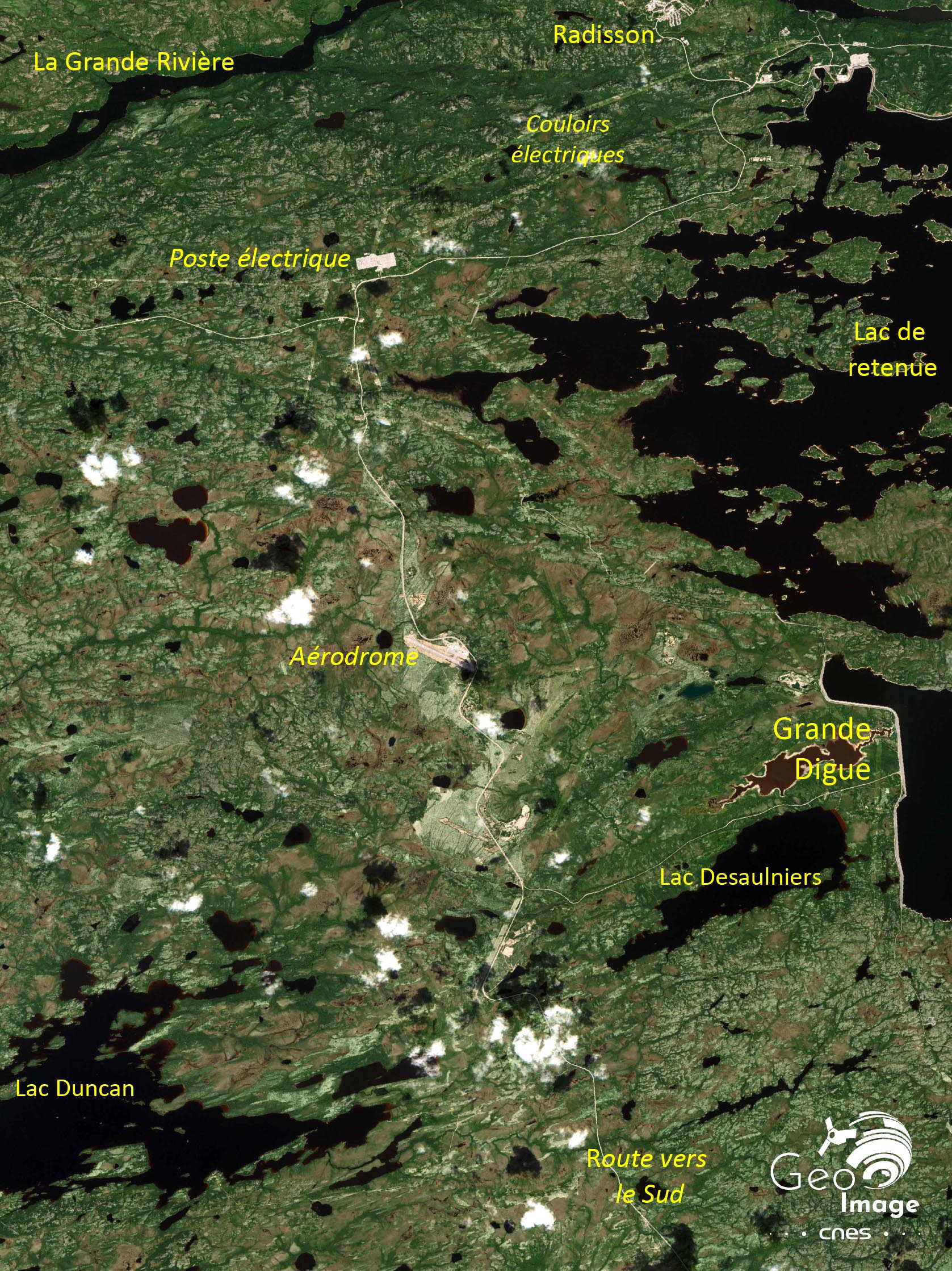 A l’ouest de l’image se distingue la localité de Radisson. Construite ex-nihilo lors de la première phase des travaux afin de loger les milliers d’ouvriers et cadres nécessaires, c’est aujourd’hui un petit pôle de seulement 350 personnes qui sert de base-vie à toute la région du fait de la très large automatisation des tâches, de l’absence d’une présence permanente et de la rotation régulière des équipes par avion dans un milieu contraignant et isolé.