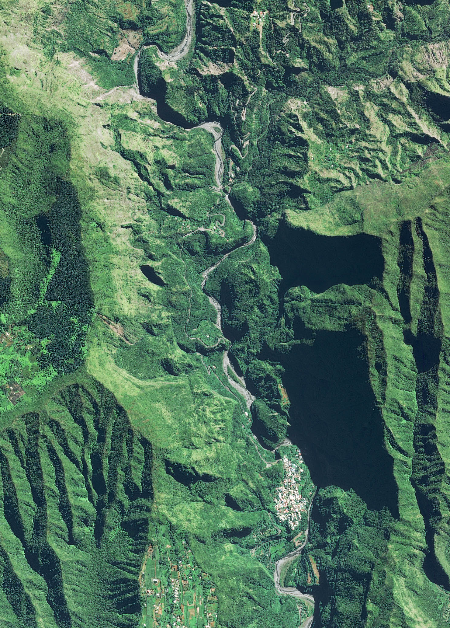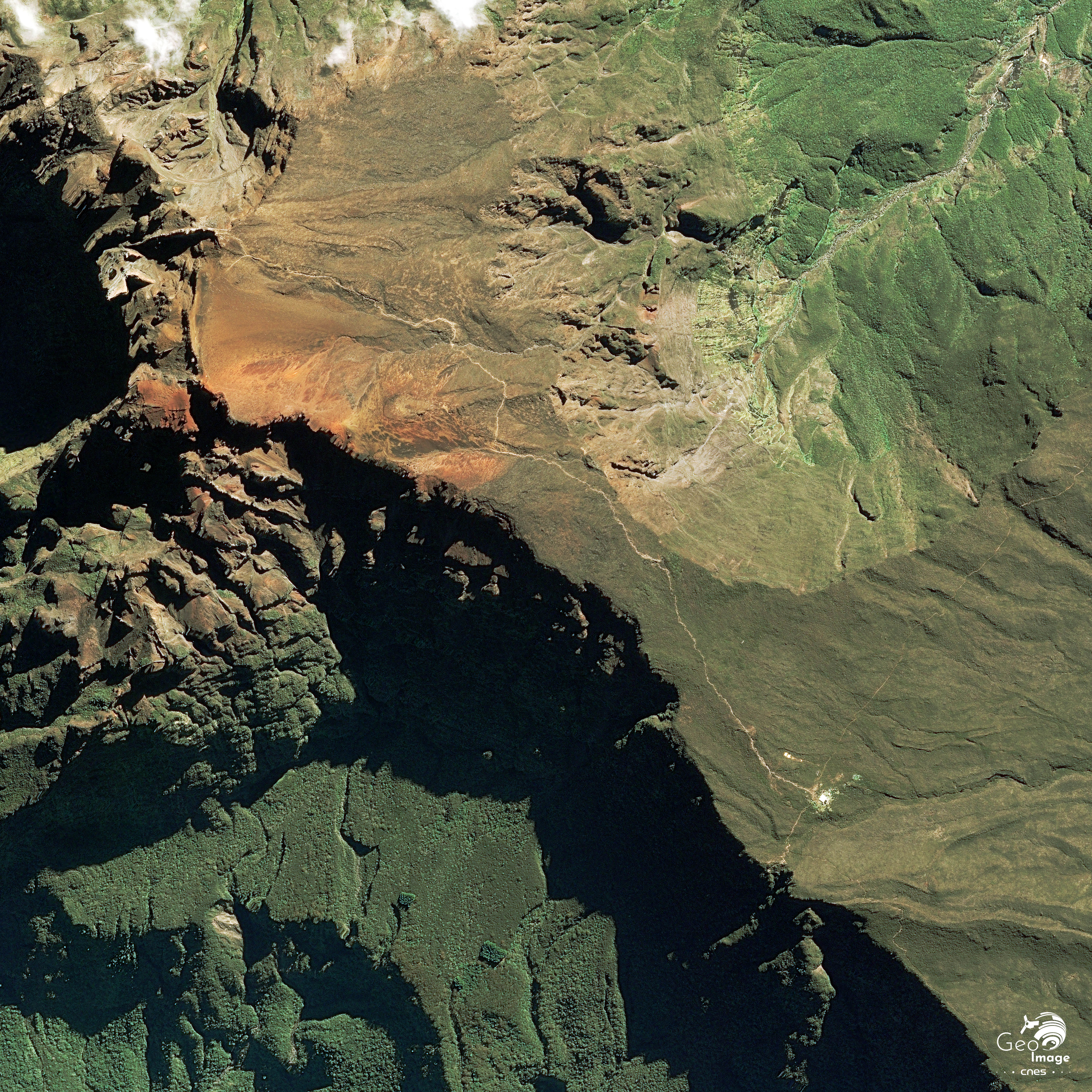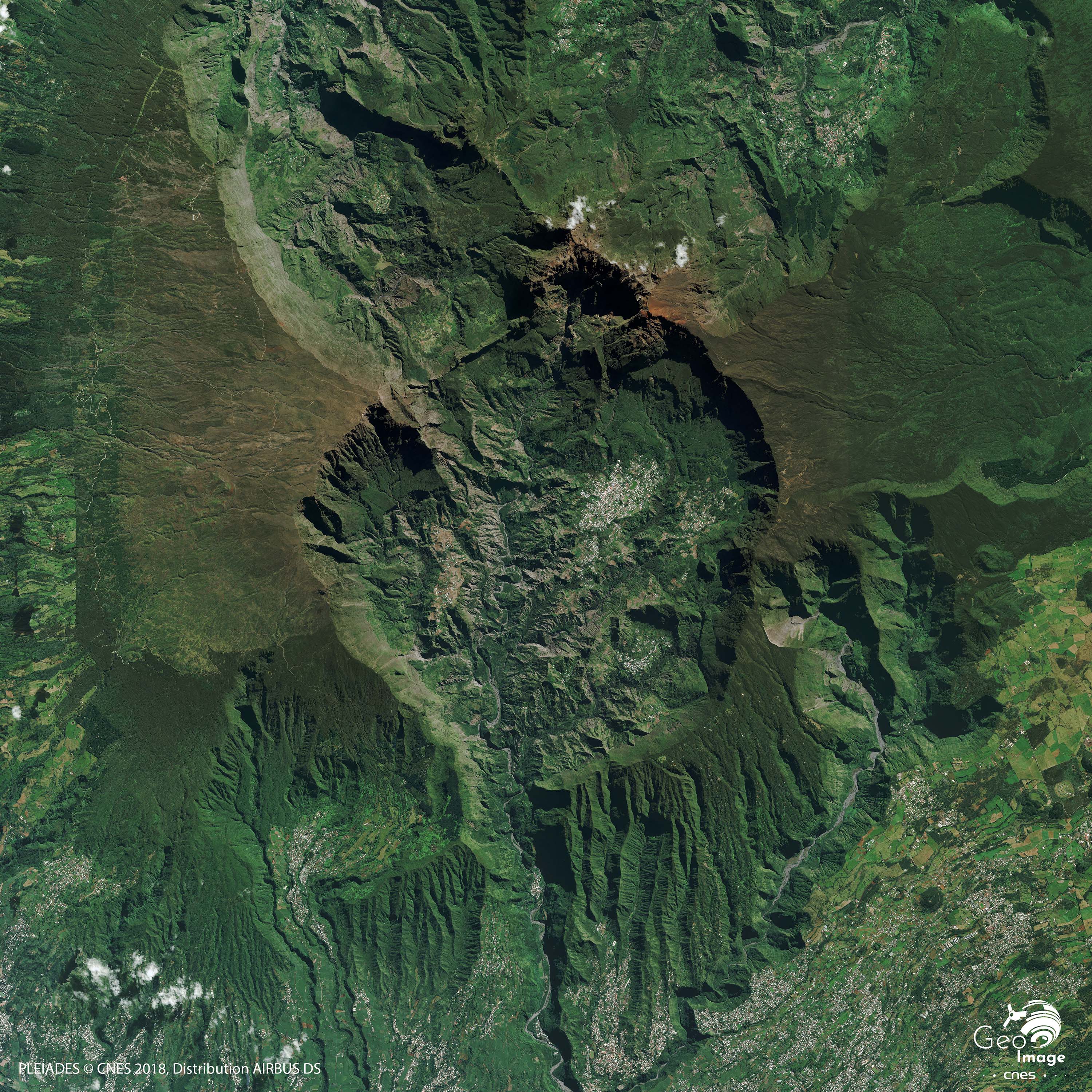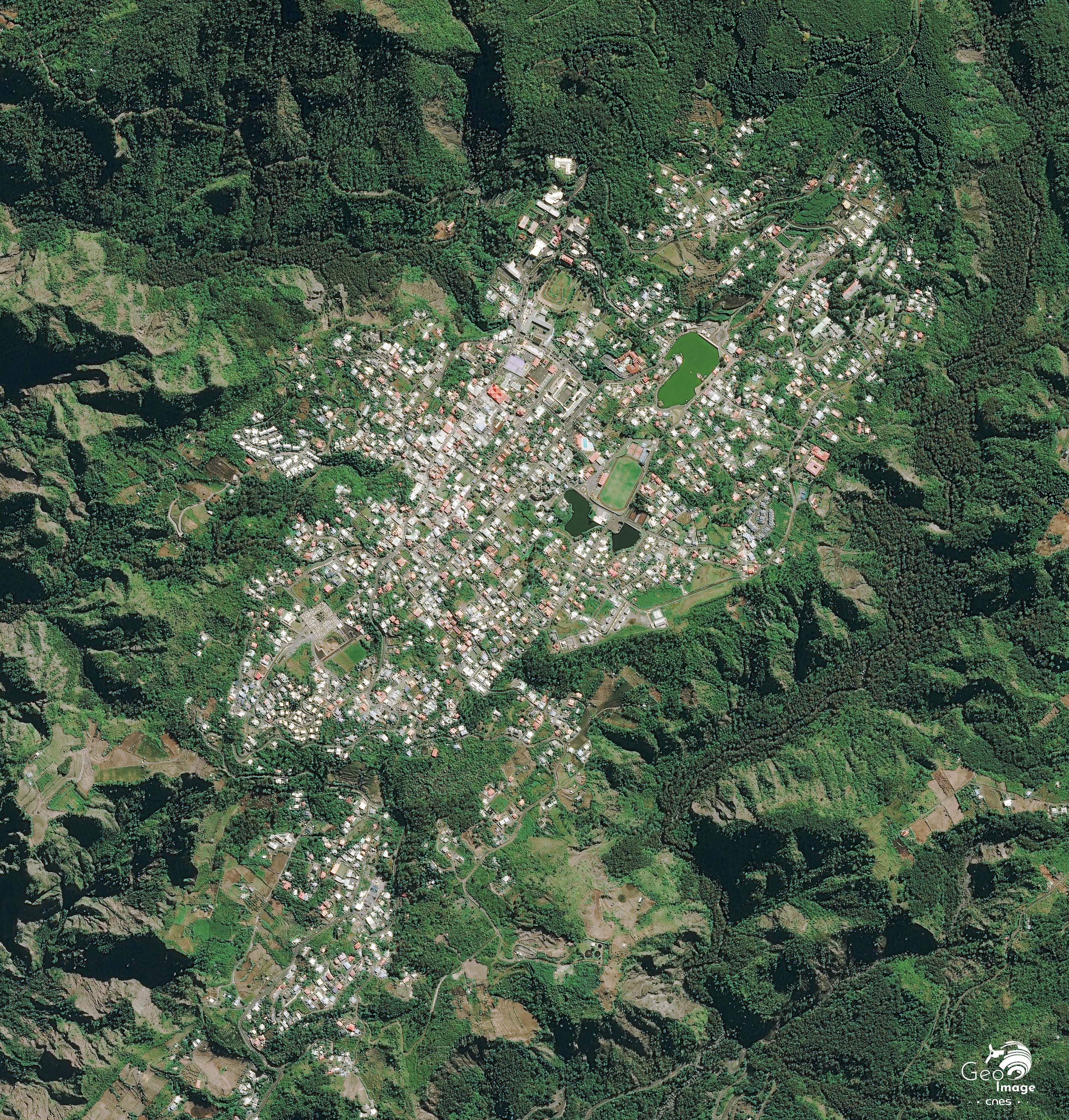 Cette image du cirque de Cilaos, caldeira située au centre de l'île de la Réunion, a été prise par un satellite Pléiades le 30 janvier 2018. Il s’agit d’une image en couleur naturelle, de résolution native à 0,70m, ré-échantillonnée à 0,5m.