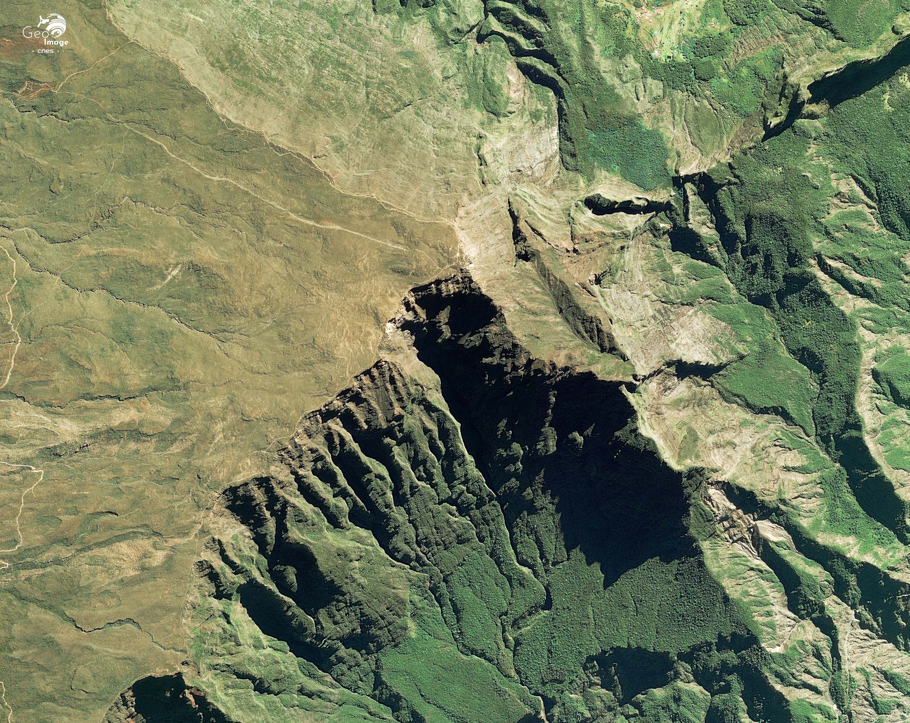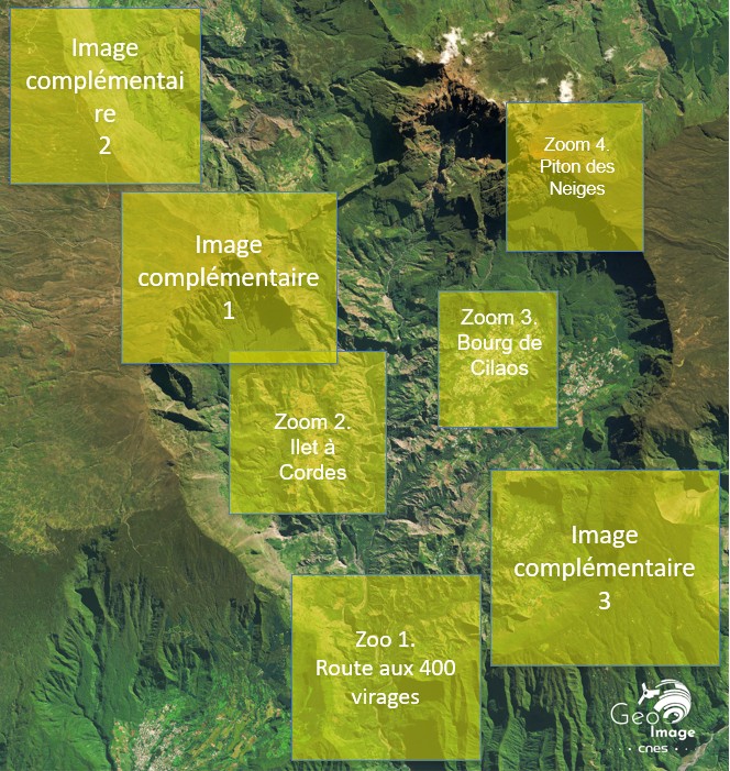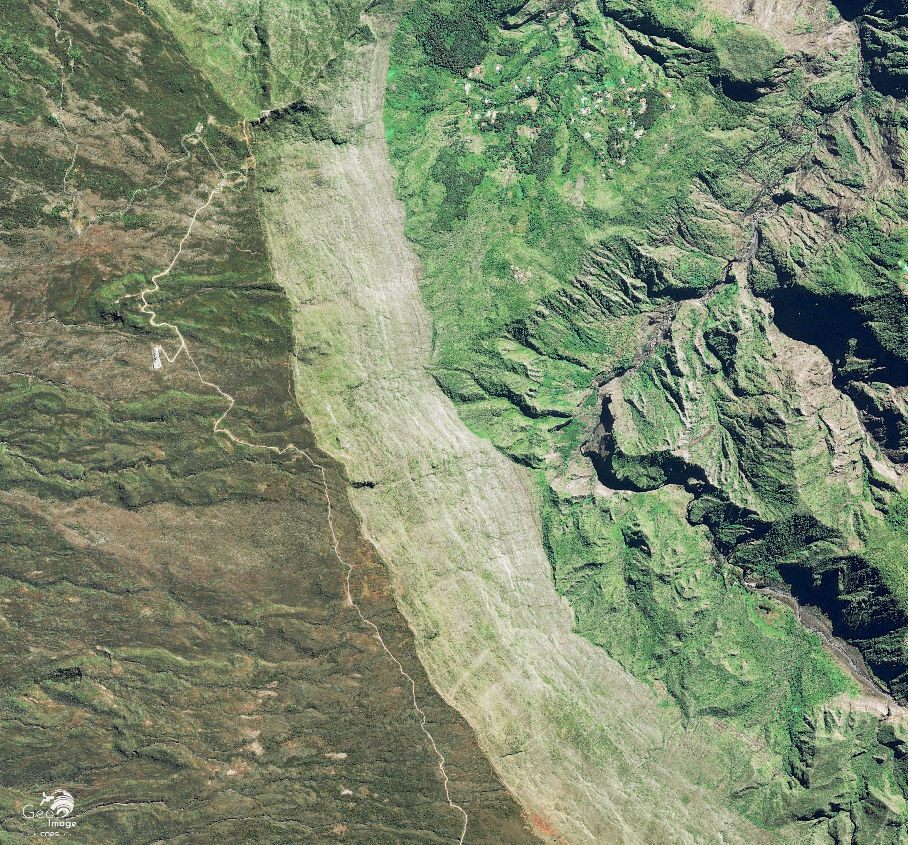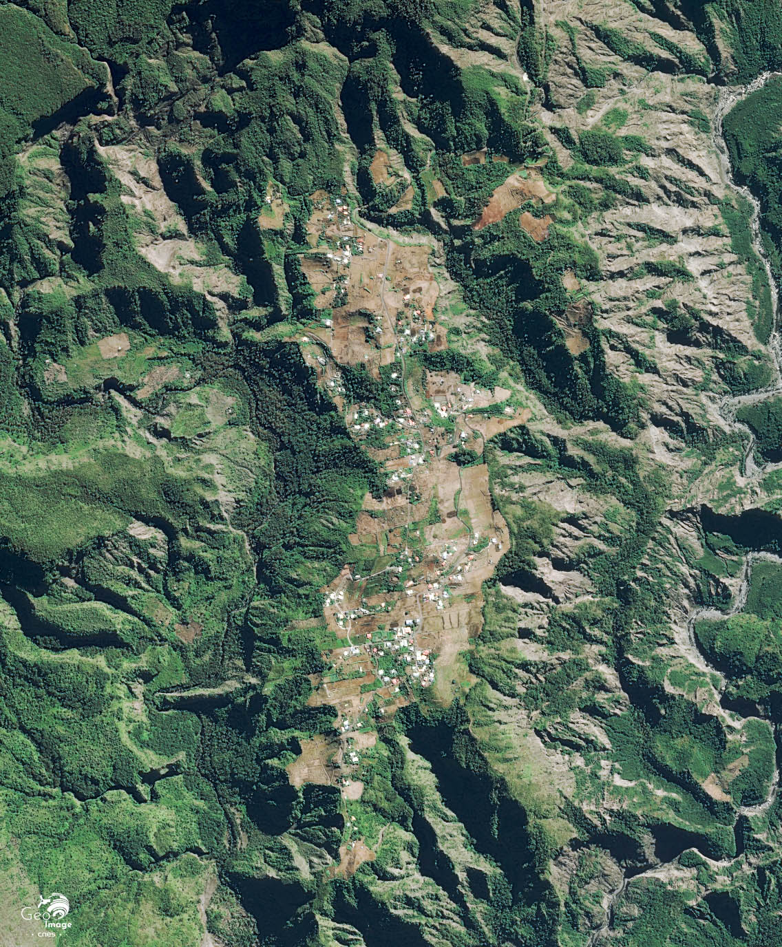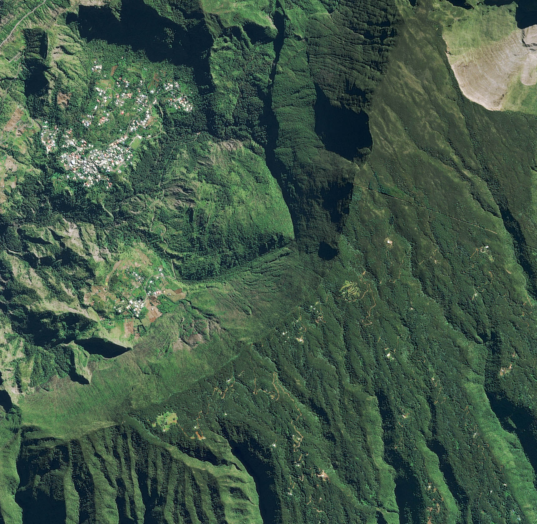 Cette image du cirque de Cilaos, caldeira située au centre de l'île de la Réunion, a été prise par un satellite Pléiades le 30 janvier 2018. Il s’agit d’une image en couleur naturelle, de résolution native à 0,70m, ré-échantillonnée à 0,5m.
