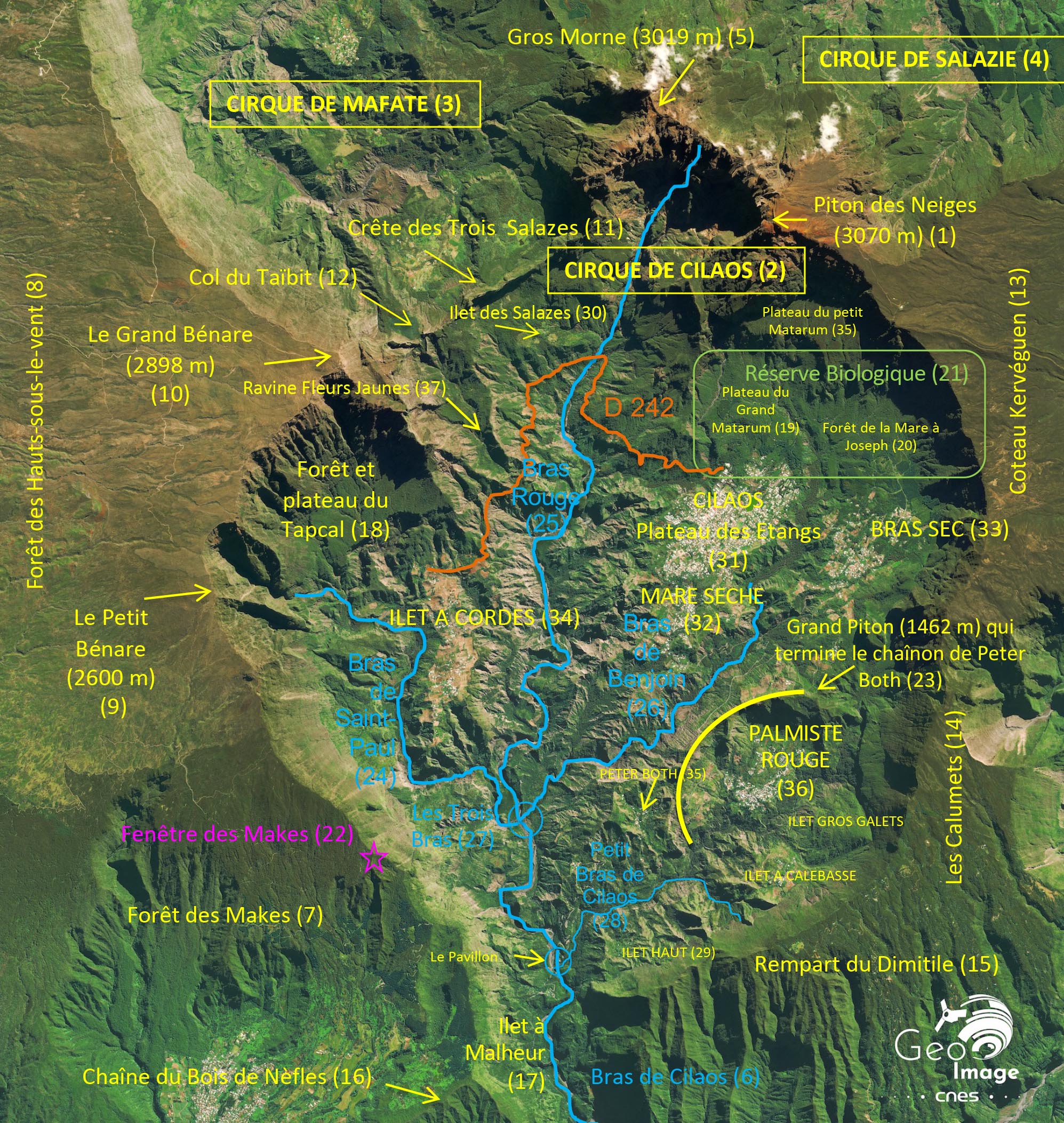 Les remparts. On ne peut qu’être frappé par les vertigineuses parois qui entourent le cirque de Cilaos, soulignées en haut et à droite de l’image par une ombre épaisse. Avec des dénivelés allant de 1.200 à 1.500 m, elles portent bien leur nom de « remparts » : leur pente n’est jamais inférieure à 60 %, et atteint par endroit la verticale. On distingue tout d’abord à l’Ouest, le rempart bordé par la forêt des Makes au Sud (7) puis celles des Hauts-sous-le-Vent (8) – qui doit sa couleur et son aspect plus clairsemé aux importantes dégradations qu’elle subit : incendies, pâturage bovin, espèces exotiques envahissantes) –, le tout étant dominé par les sommets du Petit Bénare (2600 m (9)) et du Grand Bénare (2898 m (10).
