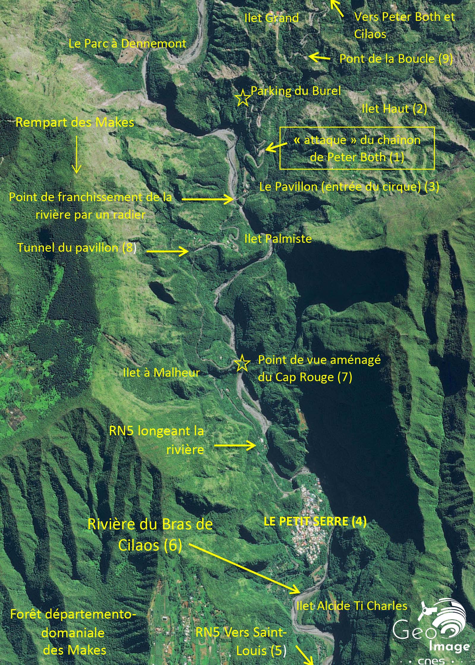 On peine aujourd’hui à imaginer que des milliers d’individus aient pu atteindre et franchir ces obstacles. Peut-être ont-ils remonté le Bras de Cilaos, ainsi que le laissent penser les petits hameaux encore installés de part et d’autre de la rivière (Le Petit Serré visible sur le zoom n°1).