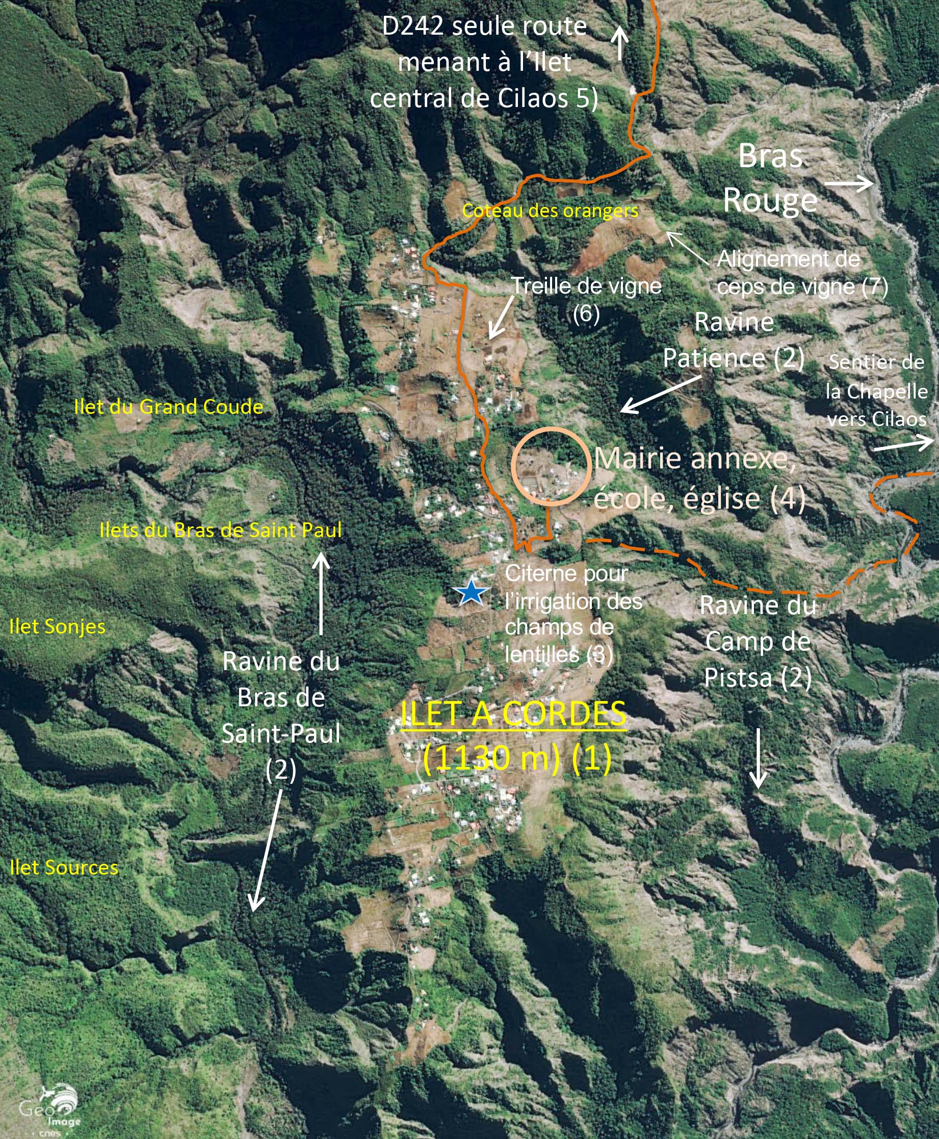 C’est autour de cette activité principale que se concentrent la population et l’habitat composé de cases « tomi » en dur, chapeautées d’un toit en tôles. La présence de l’école, de la mairie annexe (4) et d’un équipement hydraulique sur ces terres dépourvues de cours d’eau explique sans doute ici une concentration de l’habitat - 470 habitants - qui contraste avec le vide des ilets situés à l’Ouest, en rive droite du Bras de Saint-Paul (Ilet du Grand Coude, Ilets du Bras de Saint-Paul, Ilet Sonjes, llet Sources). Les friches qui les envahissent produisent un effet de camaïeu de vert à l’image, témoignent de leur abandon progressif au profit de l’Ilet à Cordes, raccordé au village de Cilaos par la route (5) depuis 1973. En ce qui concerne Ilet à Cordes, le tourisme (tables d’hôtes, gîtes) s’impose désormais comme une nouvelle source de revenus pour les habitants.
