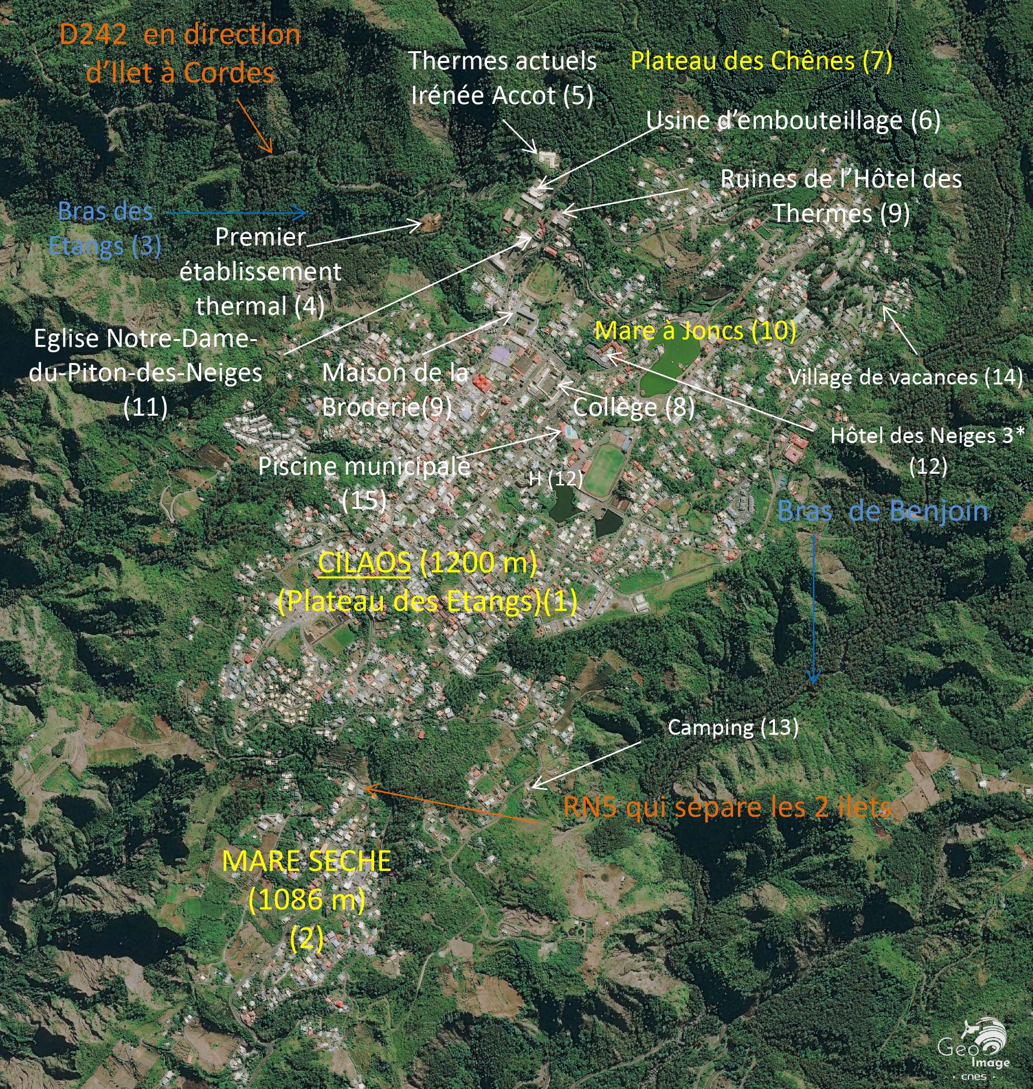 La plupart des ilets du cirque se réduisant à des parcelles agricoles entourant des hameaux, une école et une mairie annexe, seul le « village » de Cilaos affiche l’allure d’un petit centre urbain. Dénommé « Centre-bourg » ou Ilet du Centre dans les statistiques, il s’étend sur deux mini-plateaux étagés ou ilets reliés entre eux par la RN5 : au Nord le plateau des Etangs (1) dont les 3 plans d’eau qui lui donnent son nom se détachent nettement ; au Sud, situé plus d’une centaine de mètres en contrebas : Mare Sèche (2).