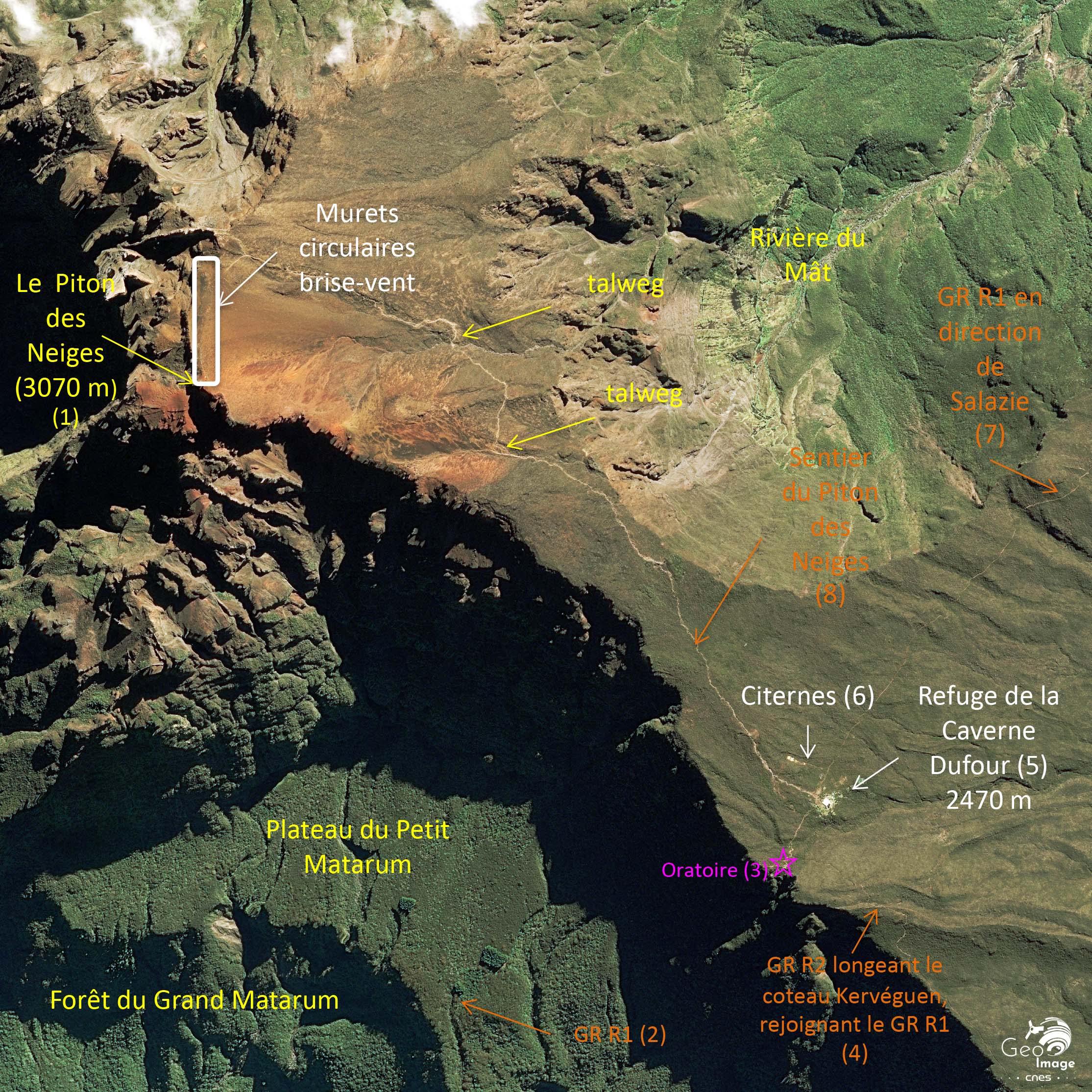 Là s’amorce alors un changement de décor avec la disparition de la végétation à partir de 2.500 m d’altitude, l’apparition des lapillis - des gravillons volcaniques - sur le chemin et de l’oxyde de fer présent dans les laves anciennes qui donne au sol ses teintes de rouille caractéristiques. Le sentier finit par s’incurver vers le Sud, signalant l’arrivée sur la crête. On peut distinguer en zoomant sur l’image, de curieuses formes circulaires en pierre, témoins de l’anthropisation de ces hautes marges. Ces minuscules enclos à taille humaine sont destinés à couper du vent froid les téméraires qui ont passé ici la nuit en attendant le lever du soleil. A cette altitude, la température peut en effet descendre en dessous de 0°C. La vue panoramique, lorsqu’elle est dégagée, est réputée spectaculaire : à ses pieds, Cilaos et la quasi-totalité de l’île de la Réunion.