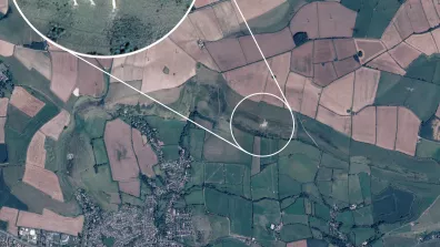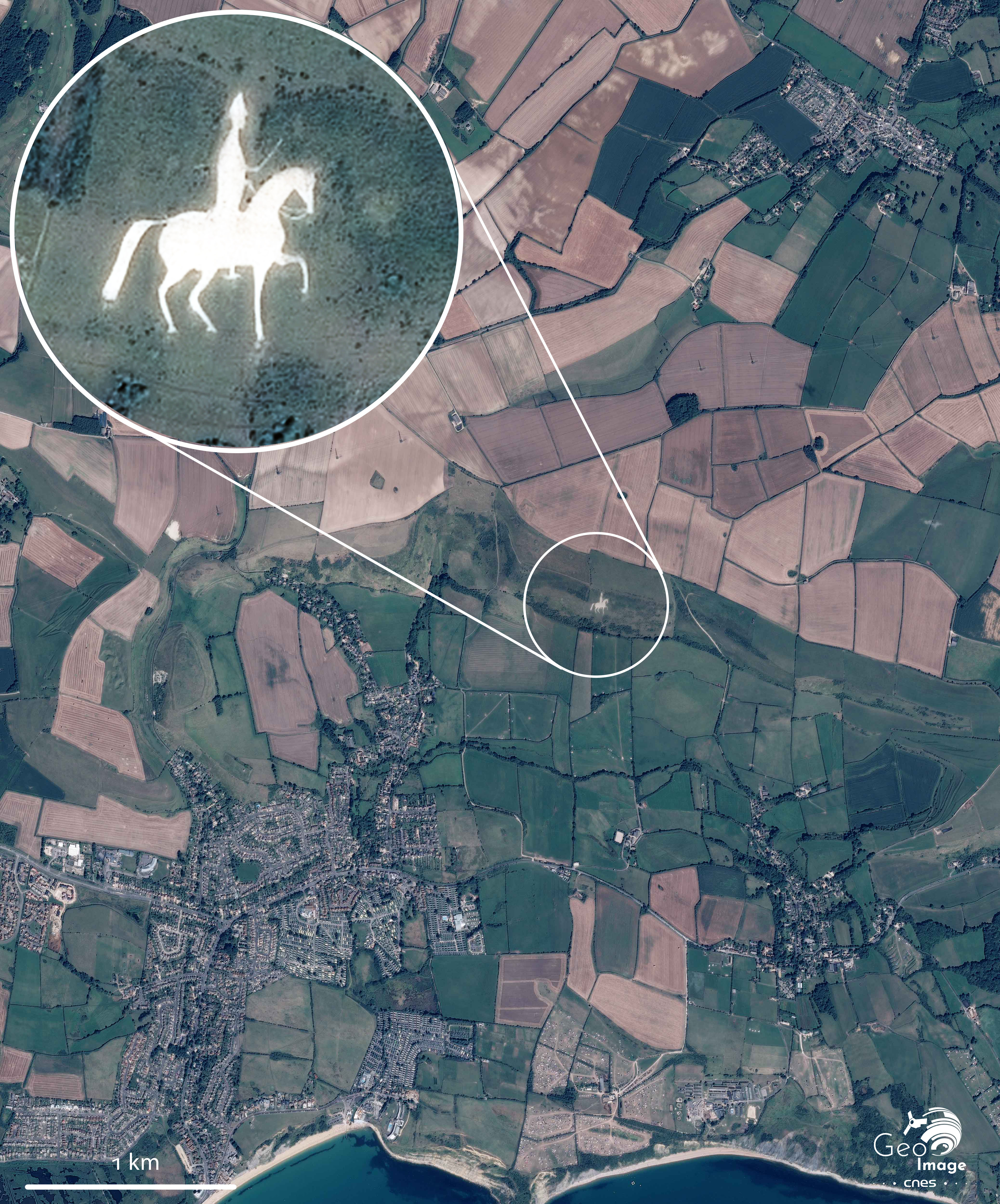 Au centre de cette image, on distingue le cheval blanc d’Osmington — l’Osmington White Horse — dans la campagne du sud de l’Angleterre, où l’on retrouve les paysages cultivés et vallonnés typiques de cette partie du pays. Nous sommes dans le Dorset (376 000 hab., 2 653 km², 142 hab./km²).