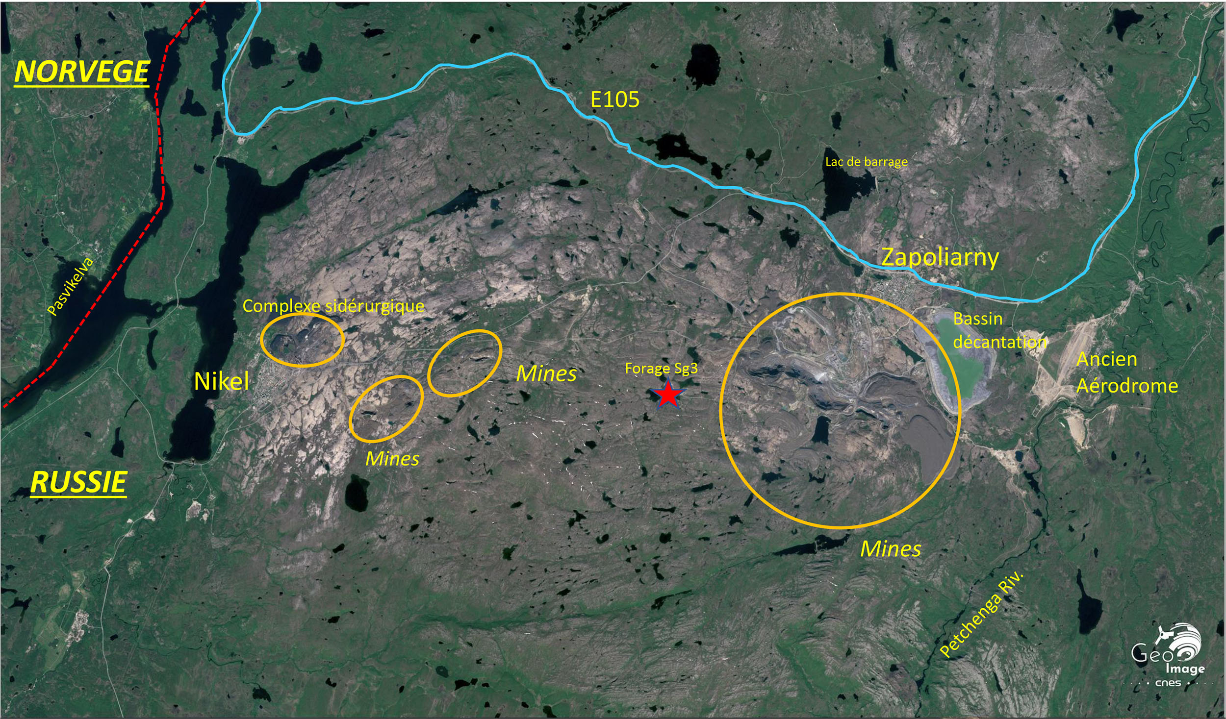 A l’est de la rivière qui sert de frontière entre la Norvège et la Russie, l’axe E105 dessert deux grands complexes miniers russes, celui de Nikel à l’ouest et, surtout, celui de Zapoliarny à l’est. Nous sommes ici entre 100 et 130 km à l’ouest de Mourmansk. Les deux mines et les deux complexes sont la propriété du géant russe Norilsk Nickel, un ancien gigantesque combinat soviétique privatisé en 1994 et regroupant les grands sites de Norilsk, de Petchenganickel, qui regroupe Zapoliarny et Nickel, et Severonickel/ Montchegorsk. Entre Zapoliarny et Nikel se trouve le site du forage Sg3, aujourd’hui à l’abandon.