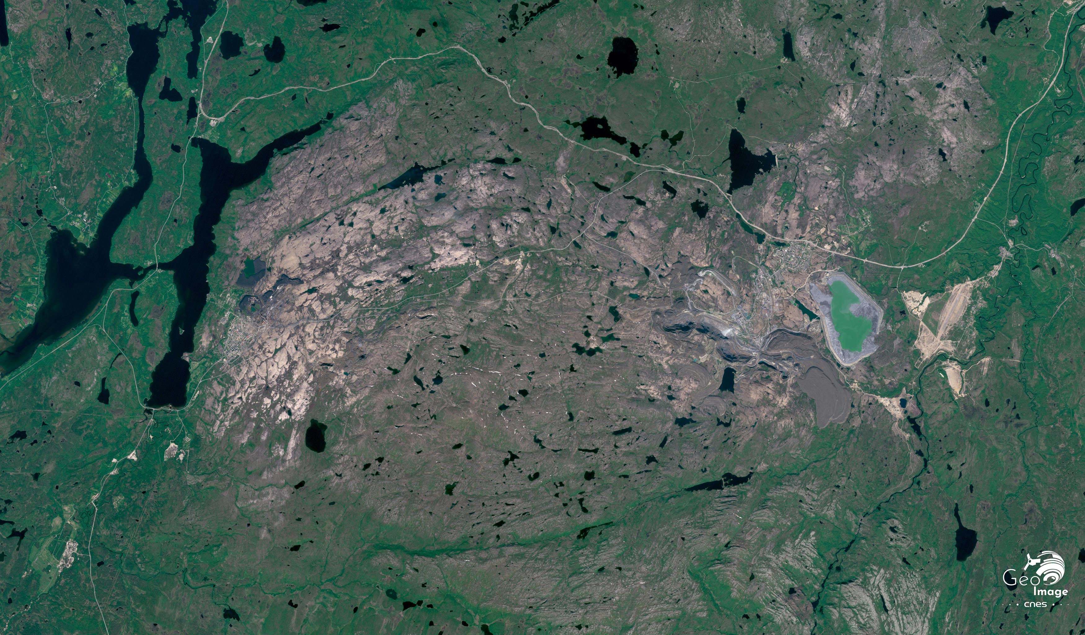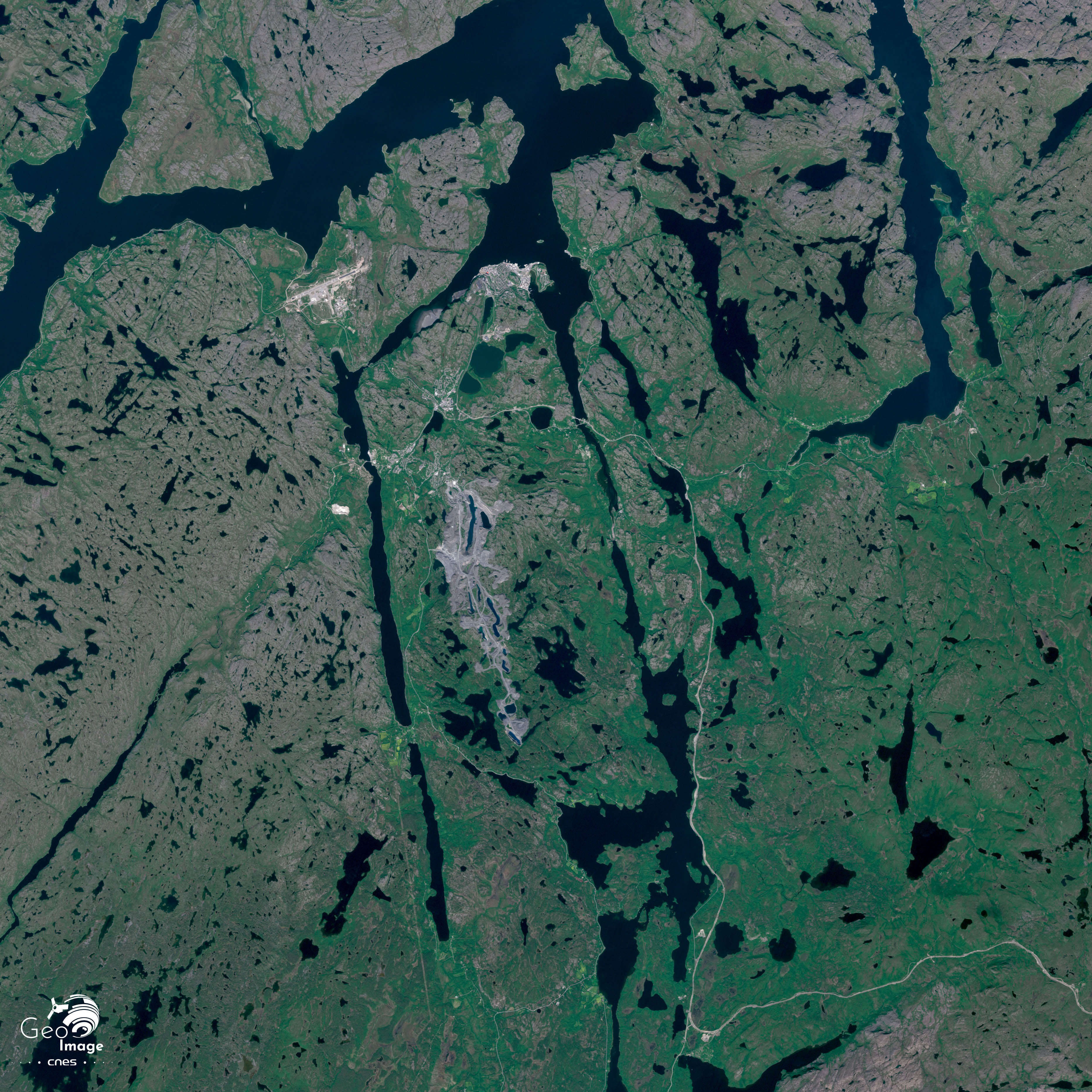 Posée à 150 m. d’altitude à seulement 11 km de la frontière norvégienne, la ville minière de Zapoliarny est composée de deux ensembles bien repérables sur l’image. Au nord, le long de la route E105 se trouve la ville peuplée de 15 000 habitants. Au sud-est apparait un immense bassin de décantation de couleur verte. Au sud et au sud-est enfin se trouvent les mines à ciel ouvert dont on distingue bien les gradins et les immenses crassiers, ou terrils, sur lesquels sont stockés les terrains-morts.