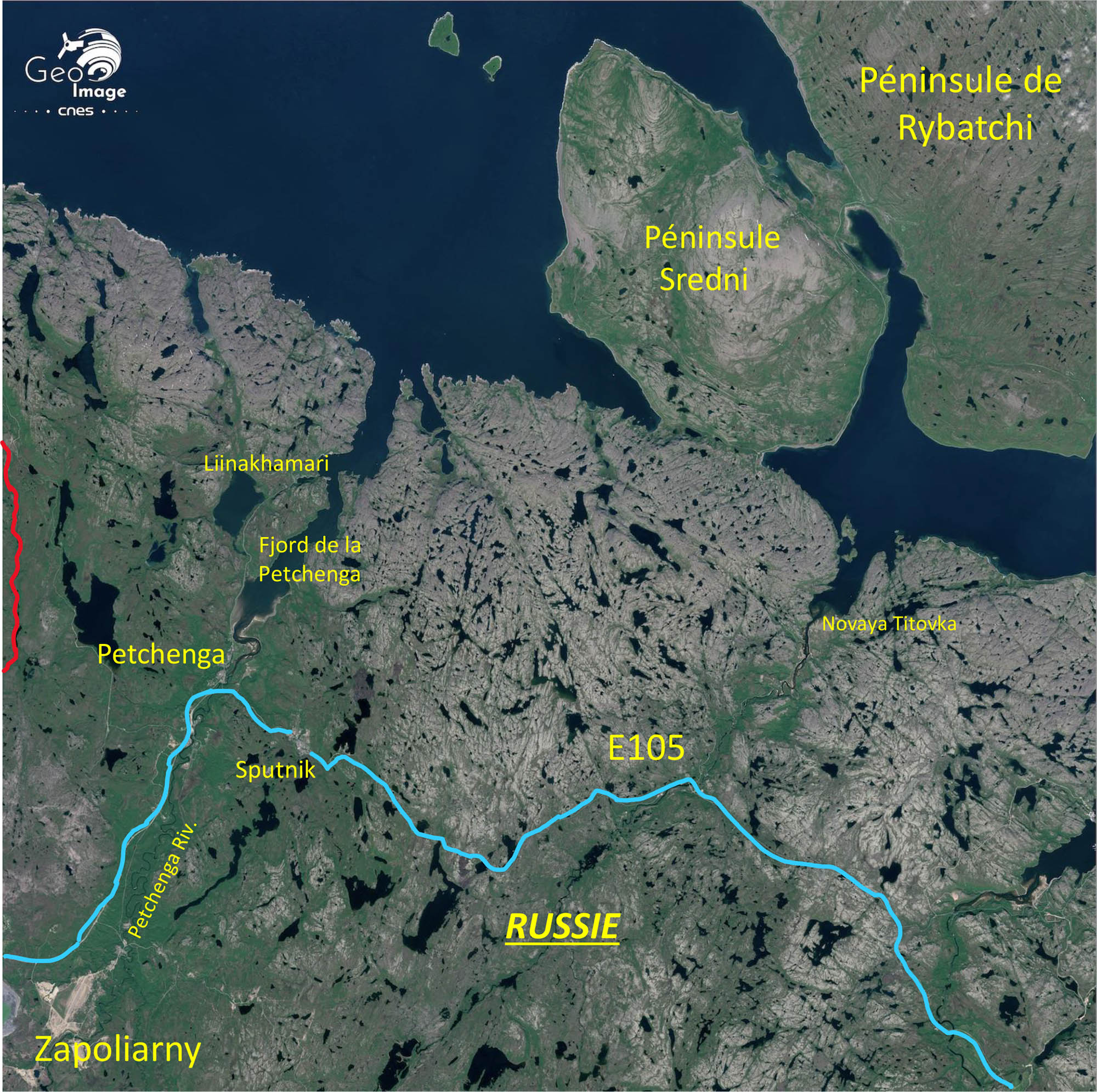 Alors que la frontière russo-norvégienne actuelle est fixée et tracée dès le début du XIXe siècle, la péninsule de Rybatchi au nord-est de l’image étant rattachée à la Russie, les principales transformations portent en définitive sur la question russo-finlandaise, avec en toile de fond la question de Mourmansk. Fondé en 1915 à l’est de la presqu’île de Kola (hors image), ce port de fond de fjord libre de glace toute l’année permet durant la 1er Guerre mondiale d’approvisionner en matériels militaires la Russie impériale face aux blocus navals allemand et turc des mers Baltique et Noire. Puis entre mars 1918 et février 1920 de faire débarquer des troupes occidentales venant en appui des armées blanches tsaristes afin d’écraser la révolution bolchevique de 1917.