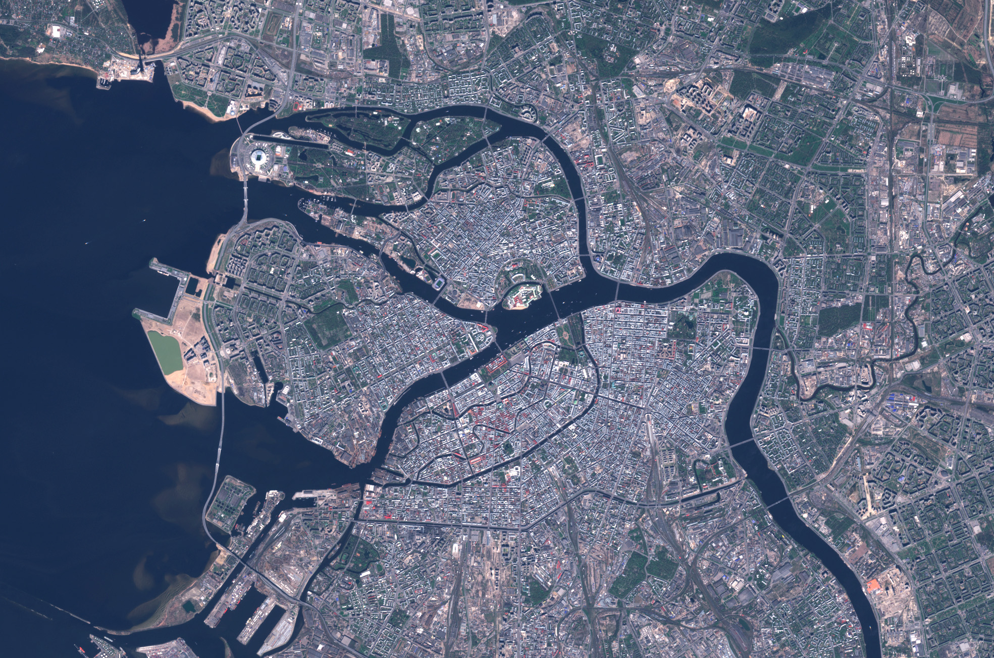 Image de la ville de Saint-Pétersbourg, réalisée par un satellite Sentinel-2, le 9 mai 2018. La résolution de cette image est de 10m.