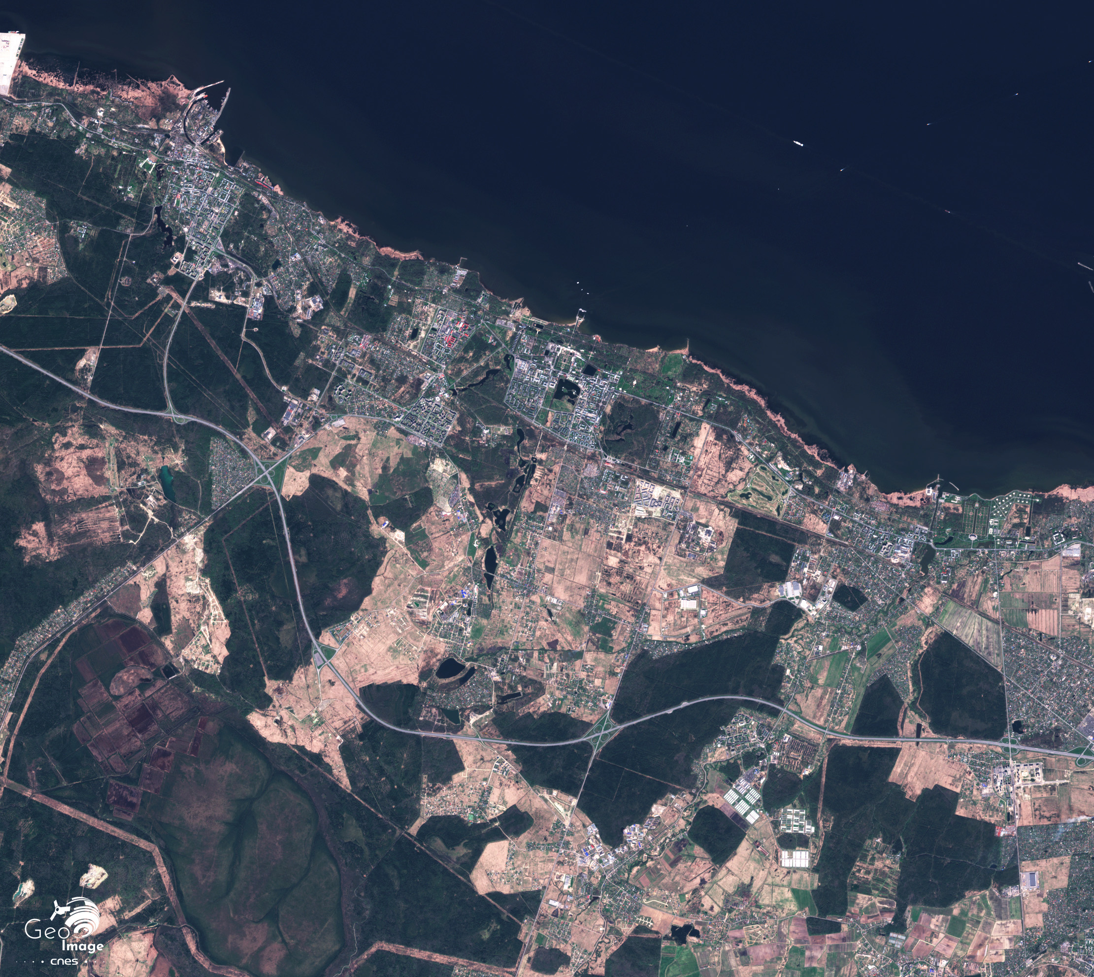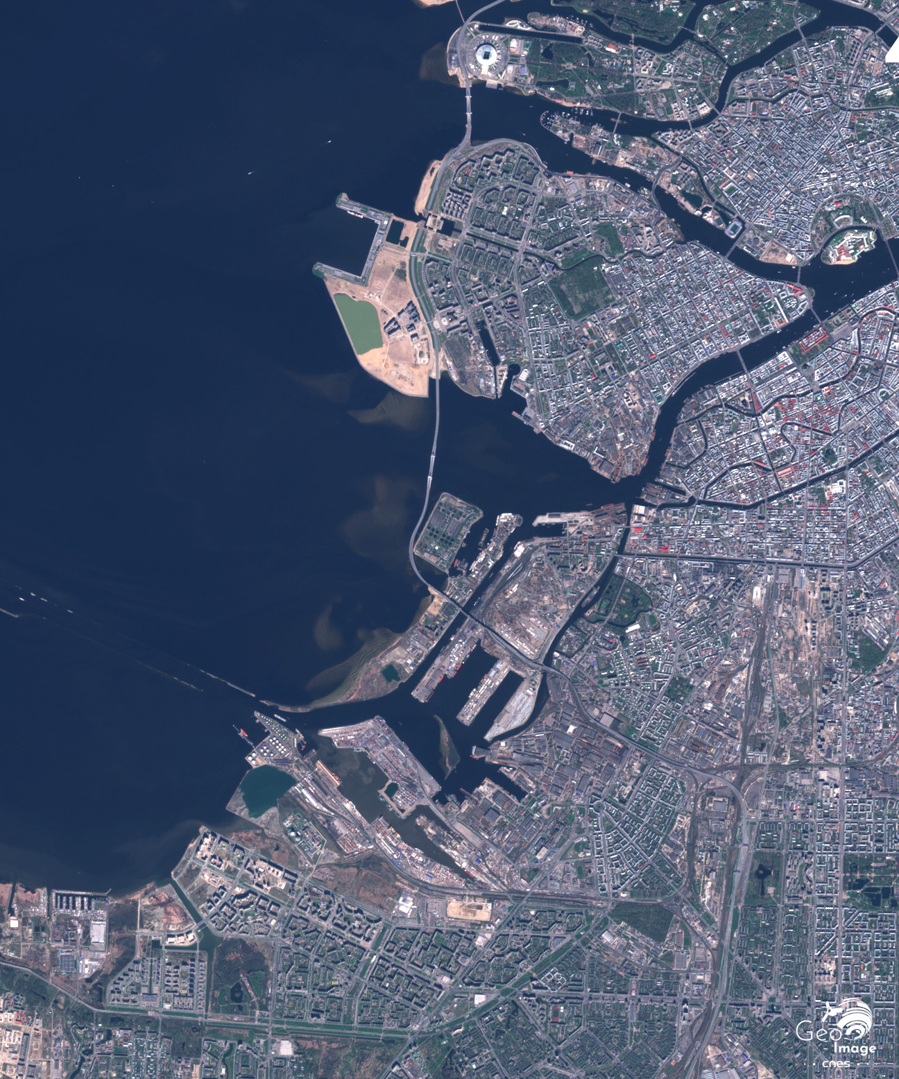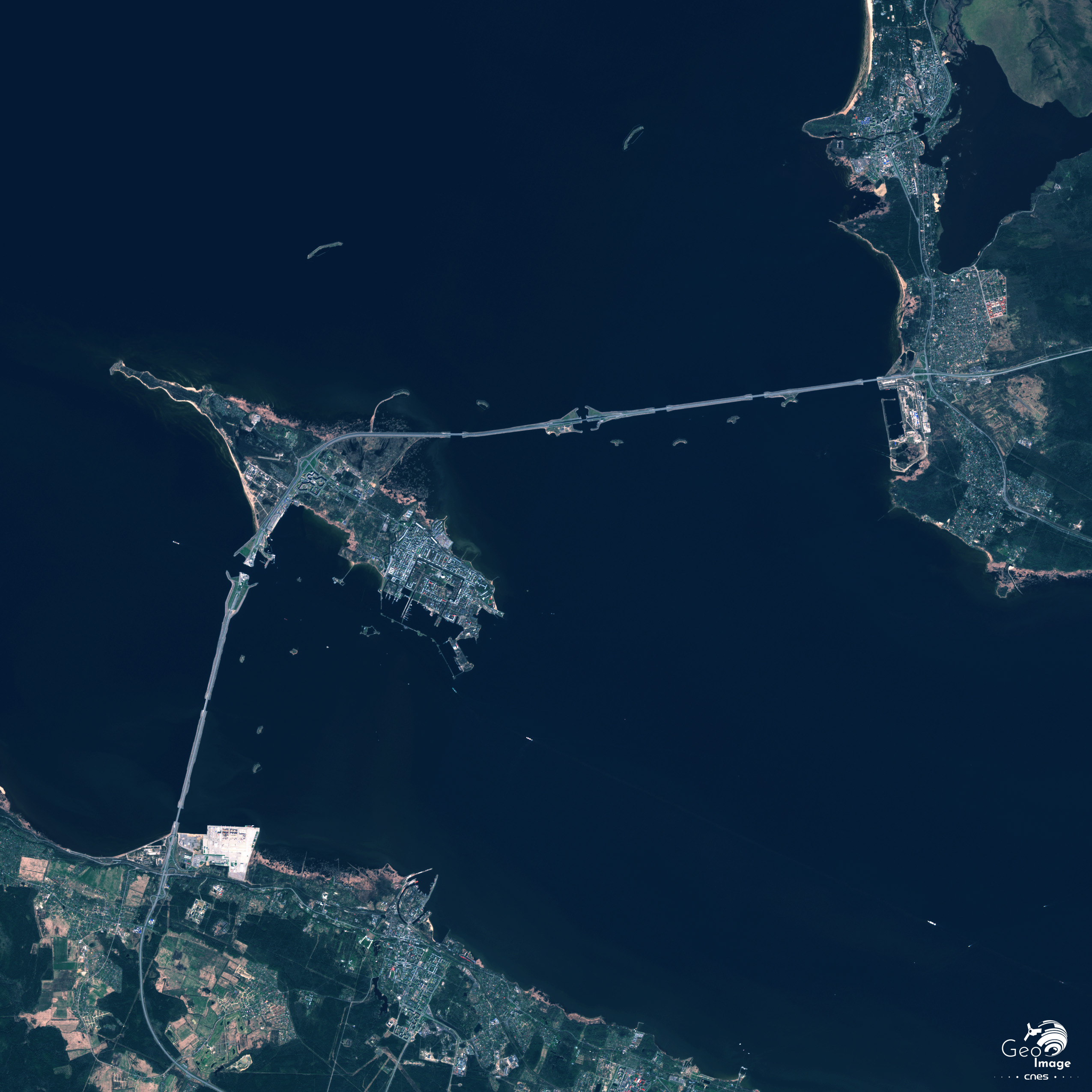 On voit bien sur l’image le barrage de Saint-Pétersbourg. Cette construction commencée en 1979 et relancée dans les années 2020 est achevée en 2011. Elle vise à protéger Saint-Pétersbourg des inondations en permettant aux eaux de la Neva de s’écouler sans encombre dans le golfe. La digue de 25 km de long et 8 mètres de hauteur comporte deux passes navigables visible sur l’image. Cette construction a été très fortement contestée à cause des risques environnementaux sur la stagnation de l’eau et son appauvrissement.