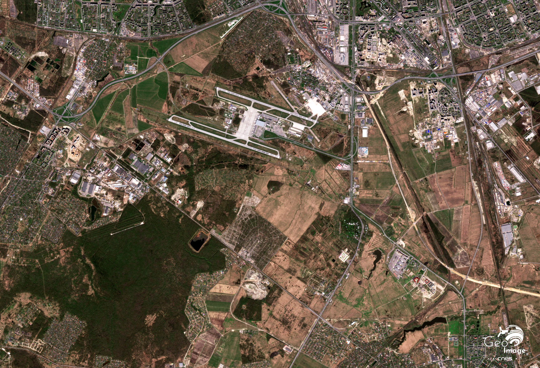 On voit très bien sur cette photo des limites sud de la ville les différentes fonctions des espaces périphériques. A droite de l’image se trouve l’aéroport Pulkovo (LED) situé à 17 km au sud du centre-ville. Ouvert en 1932, il est le 4e aéroport de Russie avec un peu plus de 18 millions de passagers par an. Reconstruit jusqu’en 2014, il rassemble avec ses deux terminaux l’ensemble des vols internationaux et nationaux de la ville et de la Région de Leningrad.