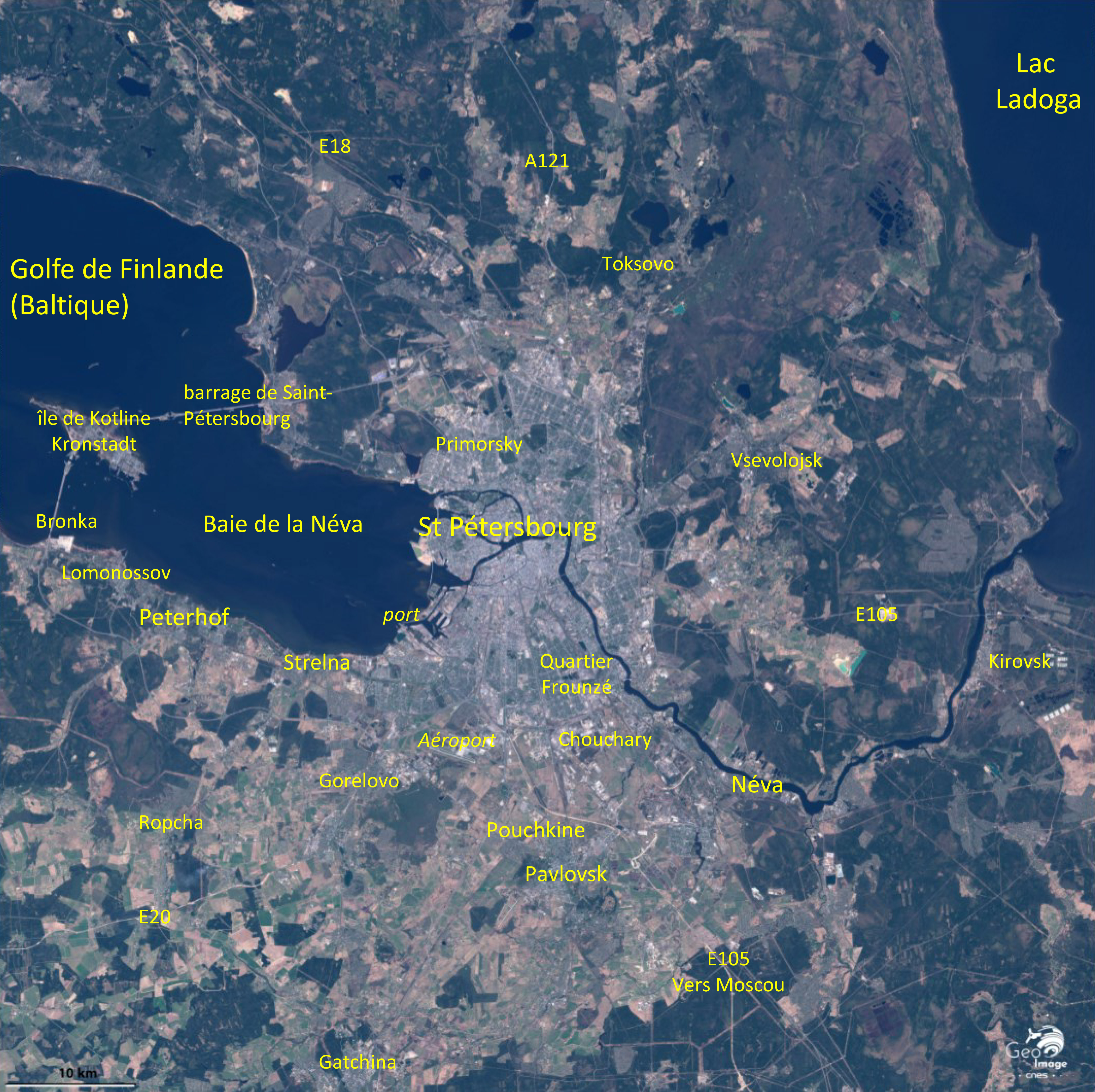Sur l’image on voit l’île de Kotline, reliée depuis 2011 par deux digues au nord et au sud de la baie de l’embouchure de la Neva dans le golfe de Finlande. Pierre le Grand fonde en 1710 la ville fortifiée de Kronstadt, après avoir pris l’île aux Suédois en 1703. Forteresse avancée de la ville, c’est une base militaire importante pour la flotte de la Baltique. Les marins de la flotte participent aux mouvements révolutionnaires de 1905, de 1917 et se soulève en 1921 contre le pouvoir bolchevik. Longtemps ville-fermée, à cause de son statut de base militaire, elle fait maintenant partie des lieux touristiques fréquentés d’autant plus que ses 45 000 habitants sont reliés dorénavant par la route au reste de la ville.