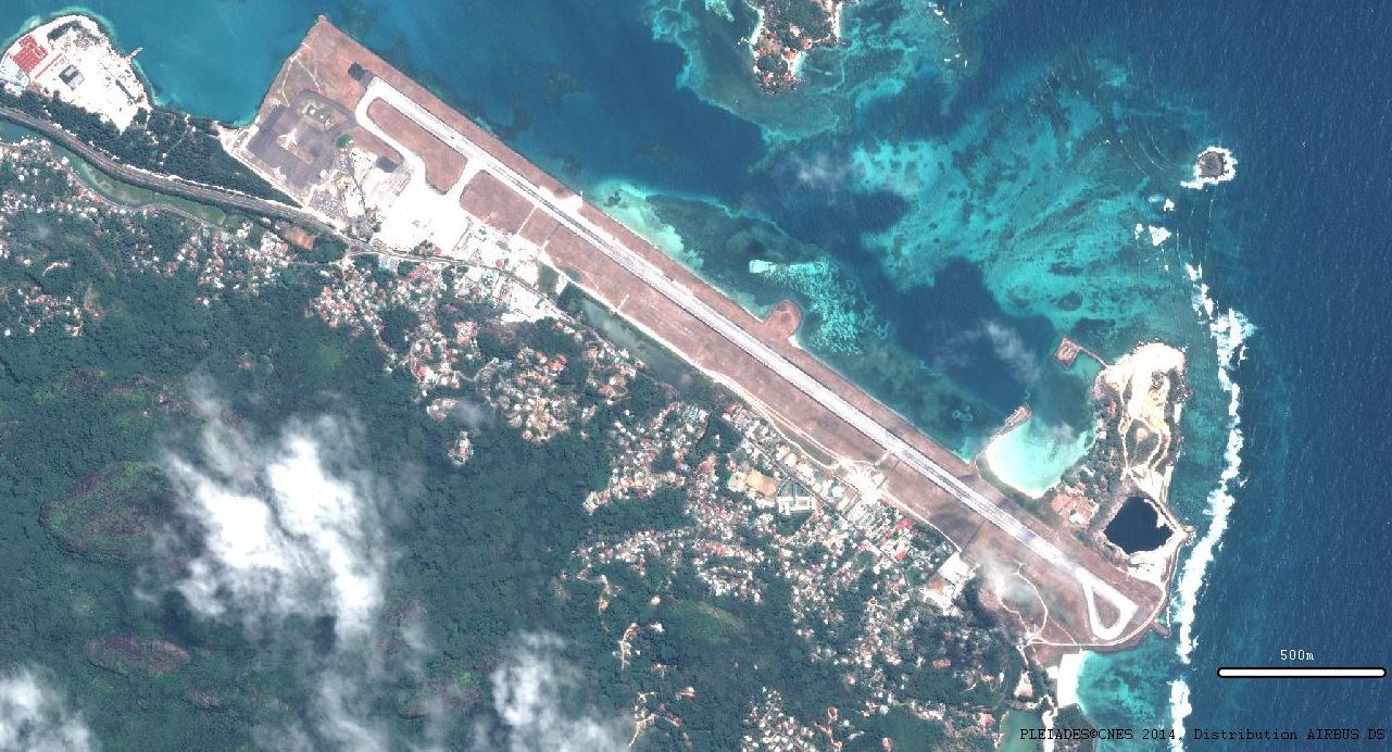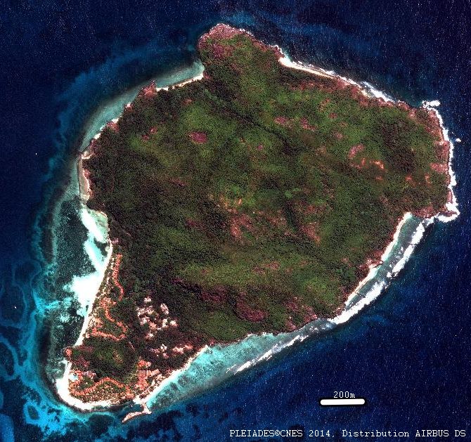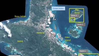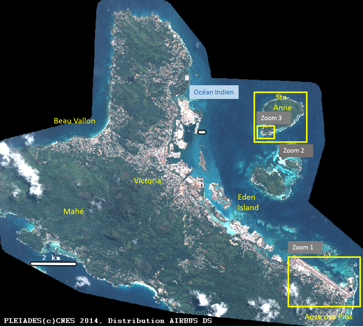 Une précision : l'île de Sainte-Anne présente sur cette image, même si elle valorise touristiquement sa surinsularité vis-à-vis de Mahé de la même manière, n'est pas une ile-hôtel. L'image Pléiades étudiée dans ces fiches ne couvre pas la zone des îles-hôtels.