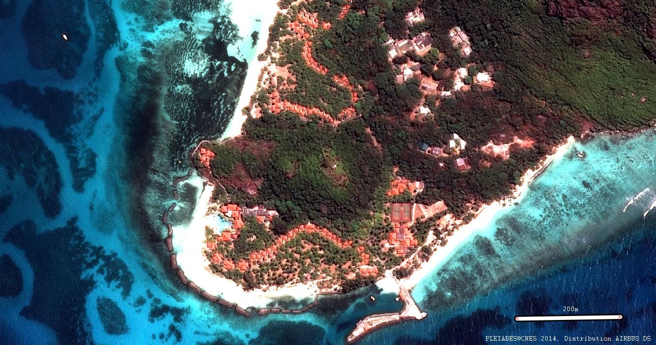 Sur l'image, on peut voir que même si Sainte-Anne appartient à un Parc National Marin, cette protection n'a pas empêché le développement d'un hôtel de luxe dans sa partie Sud, le Sainte-Anne Resort Hotel end Spa.