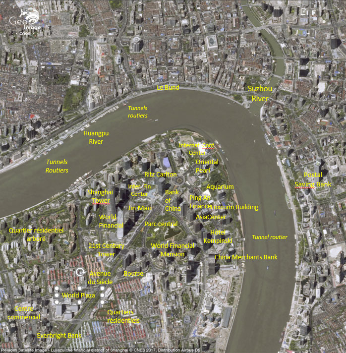 Sur la pointe du méandre se concentre un très important quartier de hautes ou très hautes tours. Il s’organise autour d’un certain nombre d’espaces verts, en particulier le grand parc central de Lujiazu et son bassin bien visible. Le quartier de Lujiazui est le symbole des quartiers centraux d’affaires (QCA), ou Central Business district (CBD), qui dominent les grandes économies métropolitaines mondiales. Plus en retrait, se trouvent des quartiers plus résidentiels, constitués soit de hautes tours sur la gauche, soit d’immeubles plus bas, longs et rectilignes au centre bas de l’image.