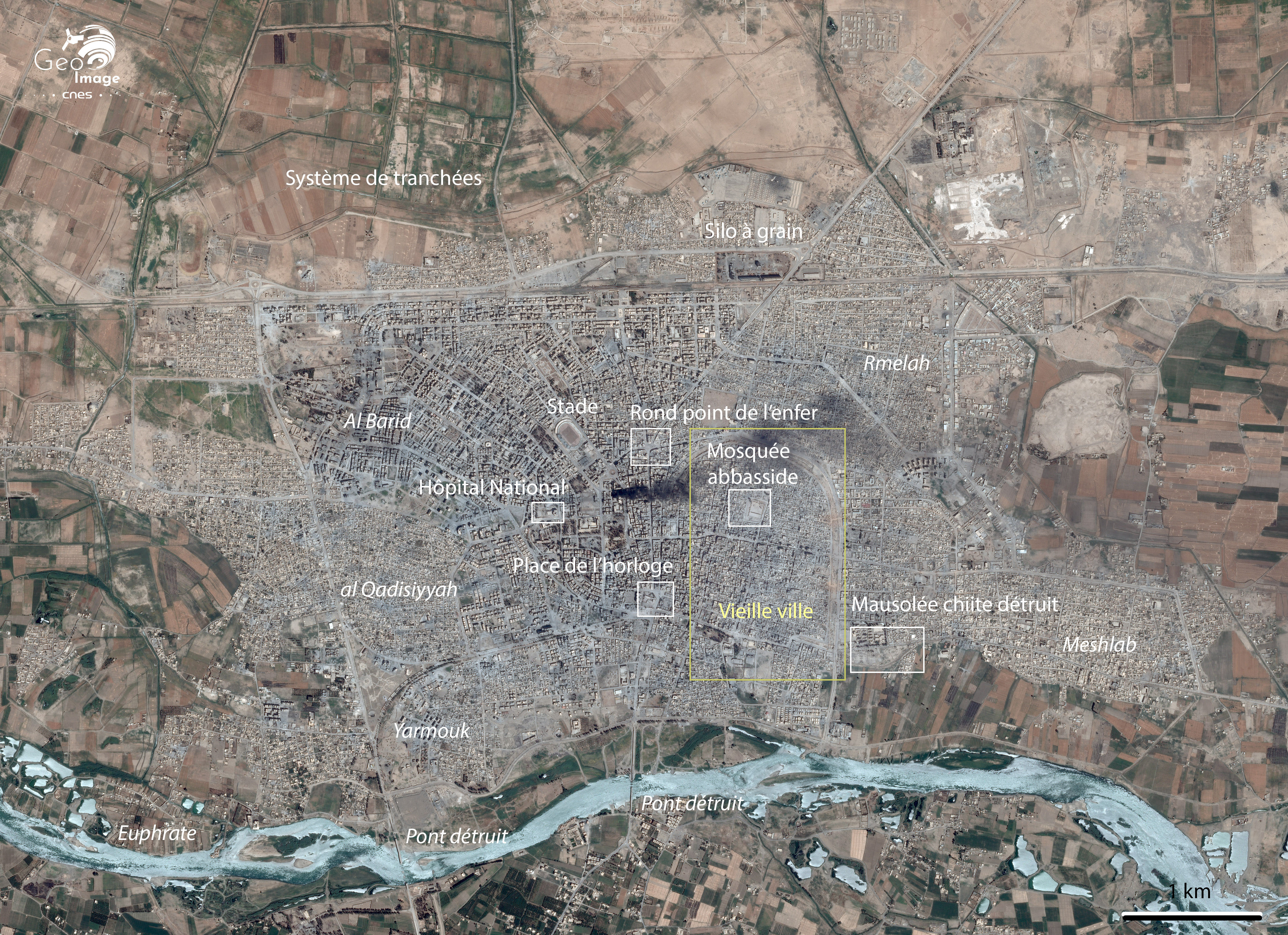 Cette image de Raqqa, ville au centre de la Syrie, a été prise par le satellite Pléiades-1A le a août 2017. Il s’agit d’une image en couleur naturelle, de résolution native à 0,70m, ré-échantillonnée à 0,5m.