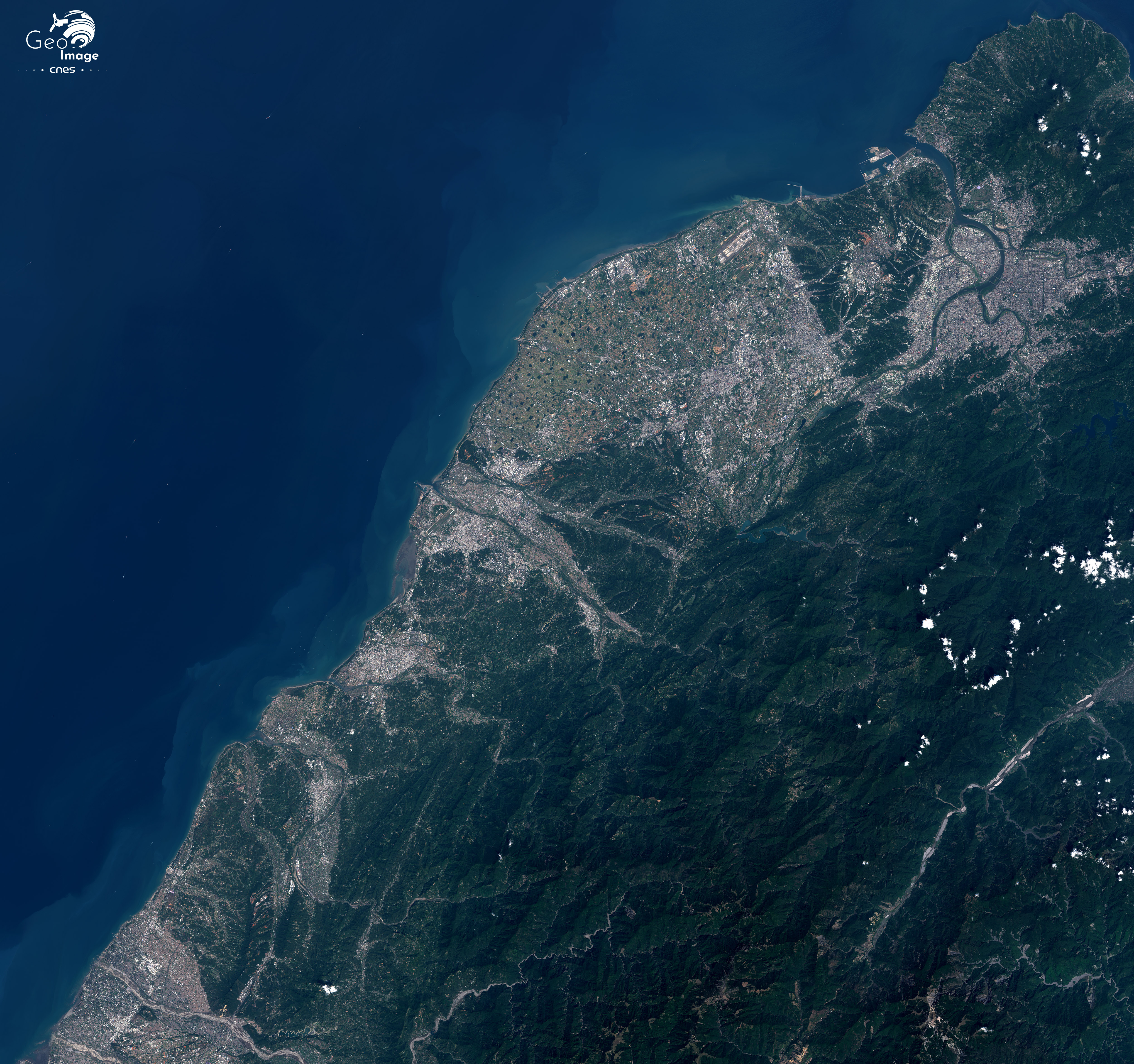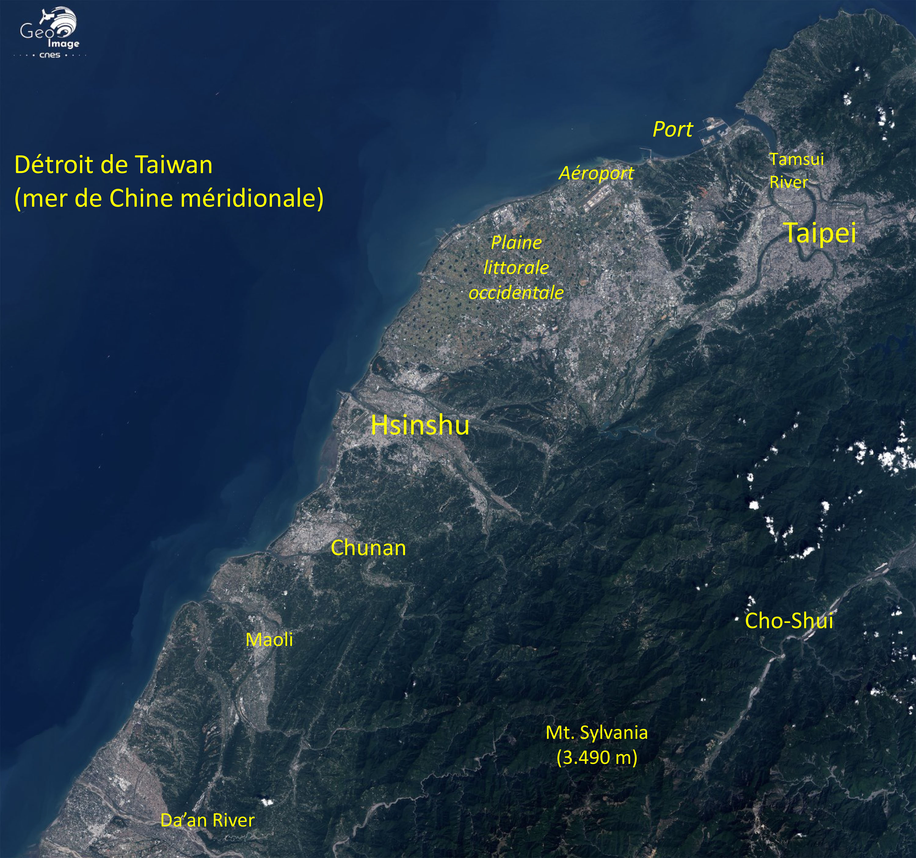 Appartenant à la « ceinture de feu du Pacifique » dans le prolongement de l’archipel du Japon, comme y témoignent volcanisme et séismes, l’île est à cheval sur le Tropique du Cancer. Son climat - tropical maritime ou subtropical - se caractérise globalement par des températures élevées (été : 30°), d’importantes précipitations moyennes (2600 mm) - liées en particulier aux moussons de mai-juin et une forte humidité ; alors que les typhons sont souvent nombreux entre mai/septembre. Pour autant, comme en témoigne l’absence de typhons en 2021, les irrégularités interannuelles de précipitations peuvent entrainer de lourdes conséquences (cf. pénurie d’eau pour les usines de composants à Hsinchu en 2021 ravitaillées par camions-citernes). Sur l’image, les rivières ou petits fleuves côtiers qui dévalent des hauteurs voient leurs cours endigués afin de limiter les inondations alors que certaines portions du littoral portent parfois encore de rares mangroves.