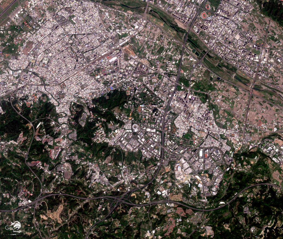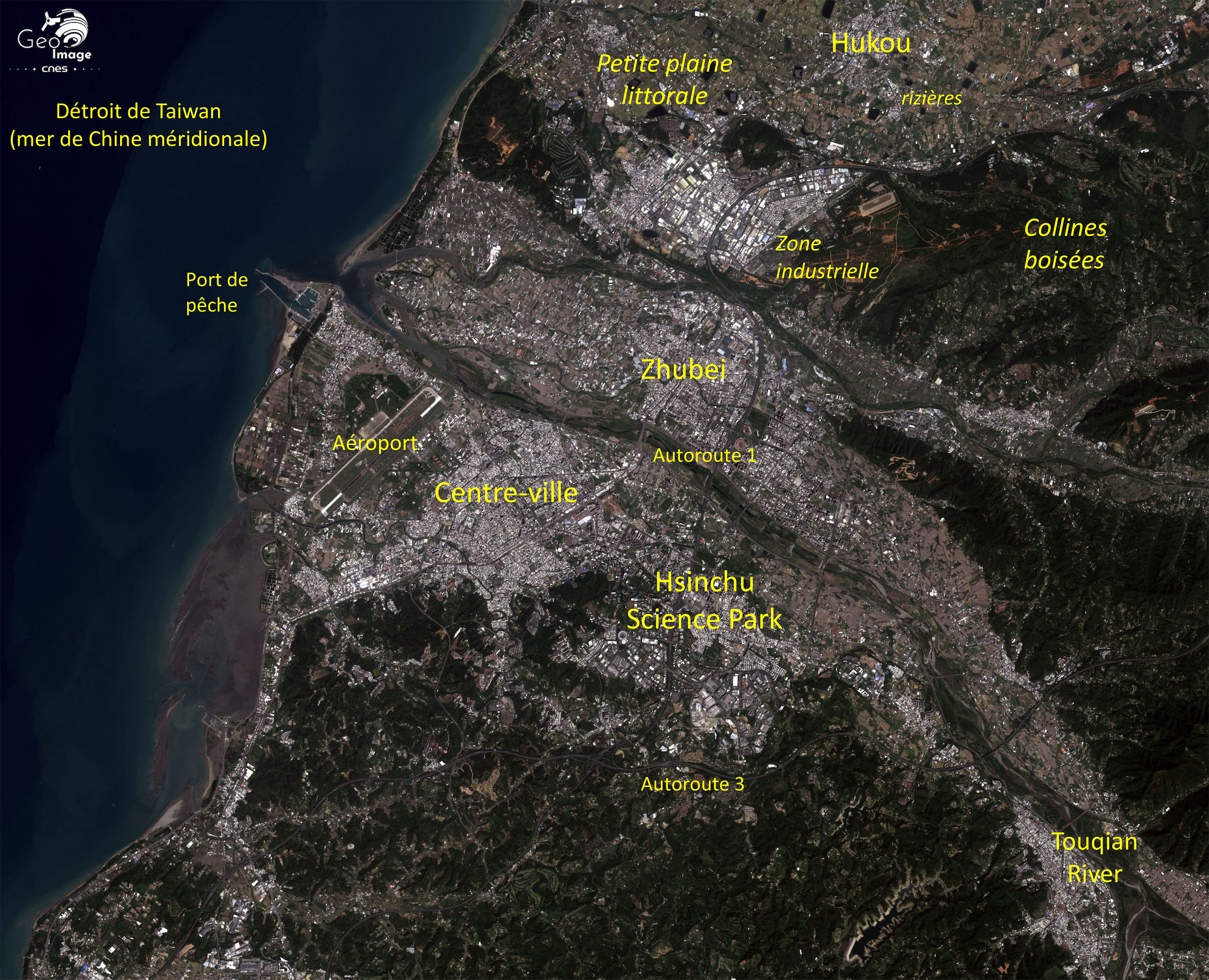 Au milieu enfin, l’image est centrée sur le petit delta de la rivière Touqian et de ses affluents qui est constitué de plusieurs bras. Sur celui-ci, au sud en rive gauche du bras principal, se trouve le vieux centre historique de la ville d’Hsinchu, posé à l’abri des crues sur un site insubmersible. Comme en témoigne l’image, la région est densément occupée, bien mise en valeur et très urbanisée. Se développant vers la mer (aéroport), le nord et le sud-ouest, Hsinchu constitue une agglomération de 450 000 habitants, avec des densités de 4300 hab./km². Elle est entourée par le comté d’Hsinchu qui regroupe 560 000 habitants avec des densités de 390 hab./km². Comme on peut le voir très clairement, la plaine agricole et les collines boisées sont des espaces soumis à une forte pression urbaine et démographique. Au total, cet espace est particulièrement dynamique puisque la population y augmente de + 43 % en trente ans.
