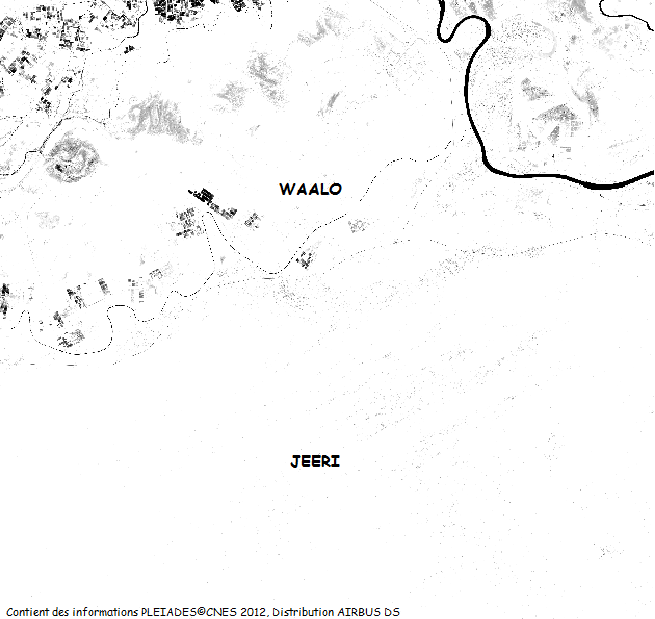 La partie Sud de l’image, le Jeeri, est composée par le substratum du Continental Terminal (formation cénozoïque de sables, agiles et grès argileux présentant des cuirassements ferrugineux) (TRICART, 1979). Elle est peuplée par des pasteurs semi-nomades Peuls dont l’activité principale réside dans l’élevage. Ces populations se déplacent en fonction des saisons. La saison humide permet d’accéder à des réserves sylvo-pastorales (non visibles sur cette image). La saison sèche occasionne plutôt des échanges avec la région Nord puisque les troupeaux sont amenés à proximité de la rivière pour s’abreuver.