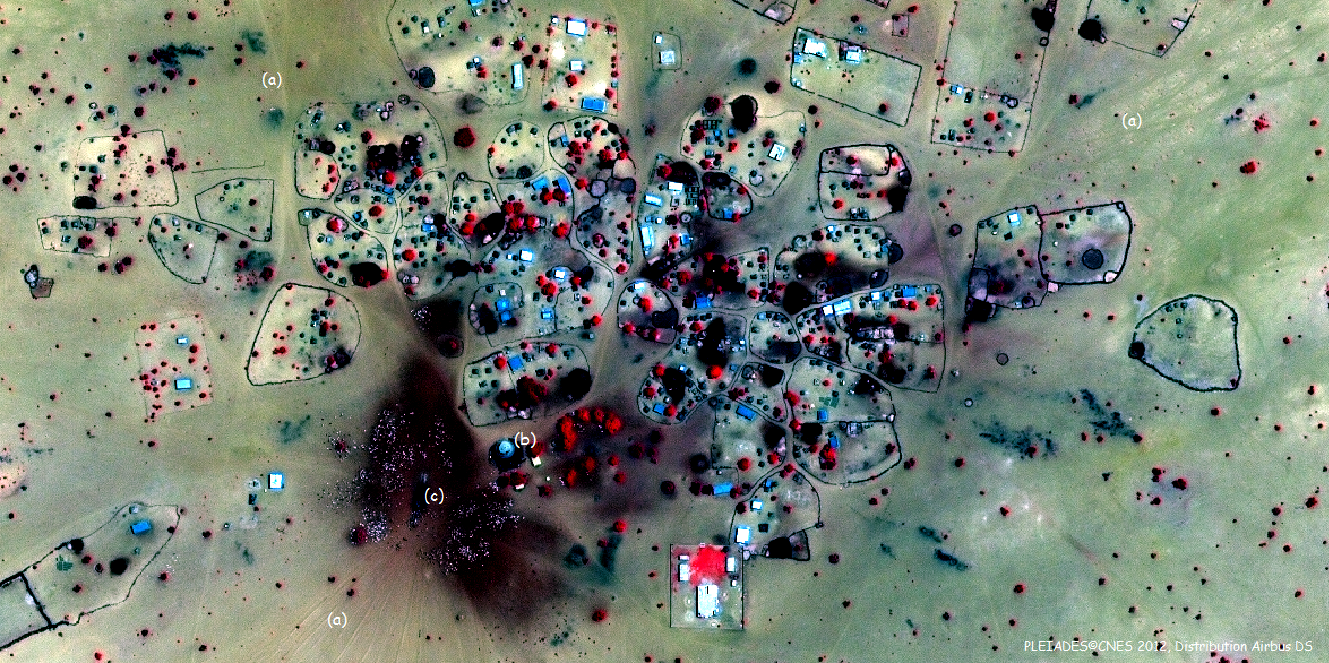 Il s’agit d’une image en composition colorée « fausse couleur » de résolution native à 0,70m, ré-échantillonnée à 0,5m. Cette image permet de mettre en évidence l’information enregistrée par le satellite dans le Proche infra-rouge. Elle donne une information supplémentaire à celle de l’œil humain. Les espaces sombres correspondent à des espaces en eau ou humides. On note donc sur cette image la présence de zones humides à proximité du puits (b) ou des abreuvoirs (c). La couleur rouge assez vive correspond à des éléments végétaux actifs, comme les acacias ou quelques (rares) stcutures herbacées. Pour en savoir plus sur les compositions colorées « fausses couleurs», rendez-vous sur le site Enseignants et Médiateurs du CNES, à la rubrique Terr’Image.