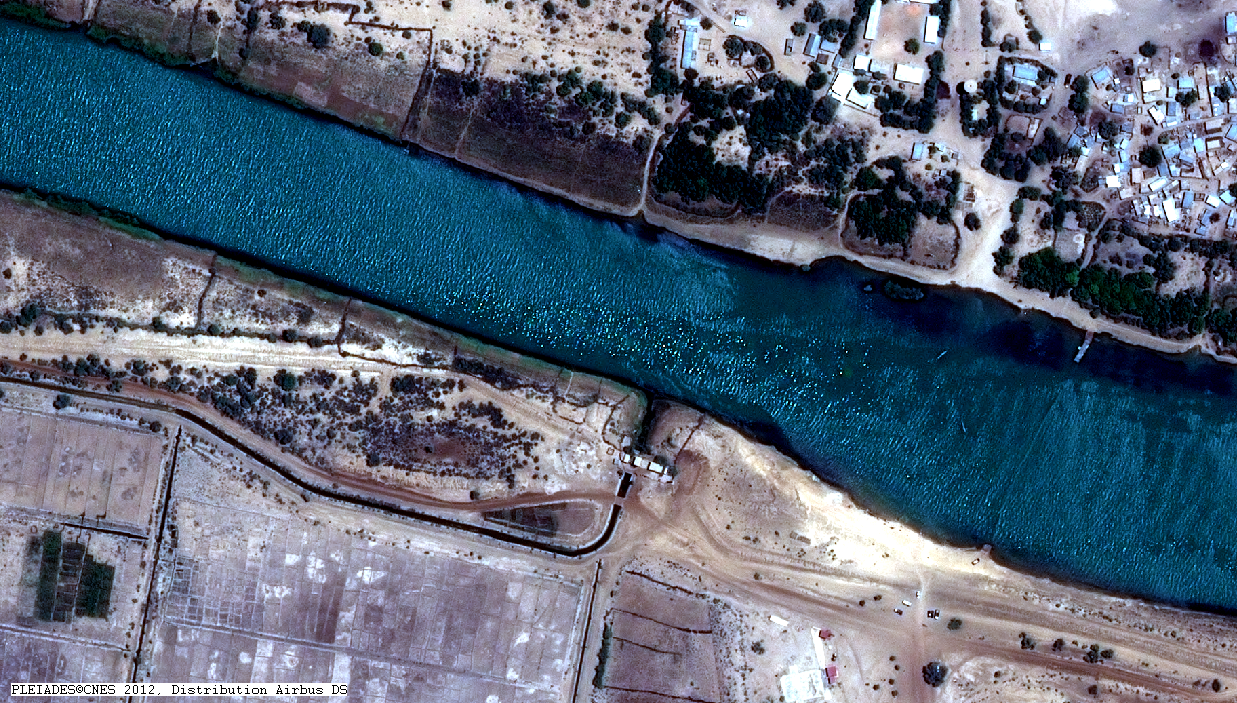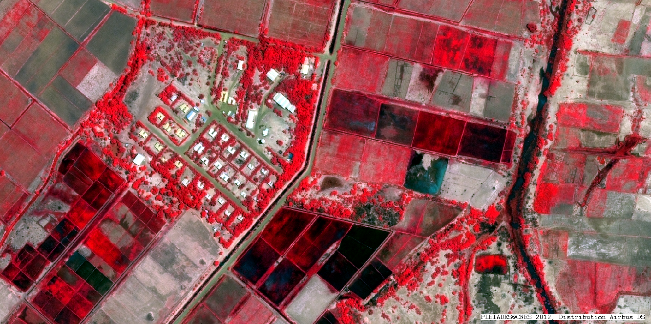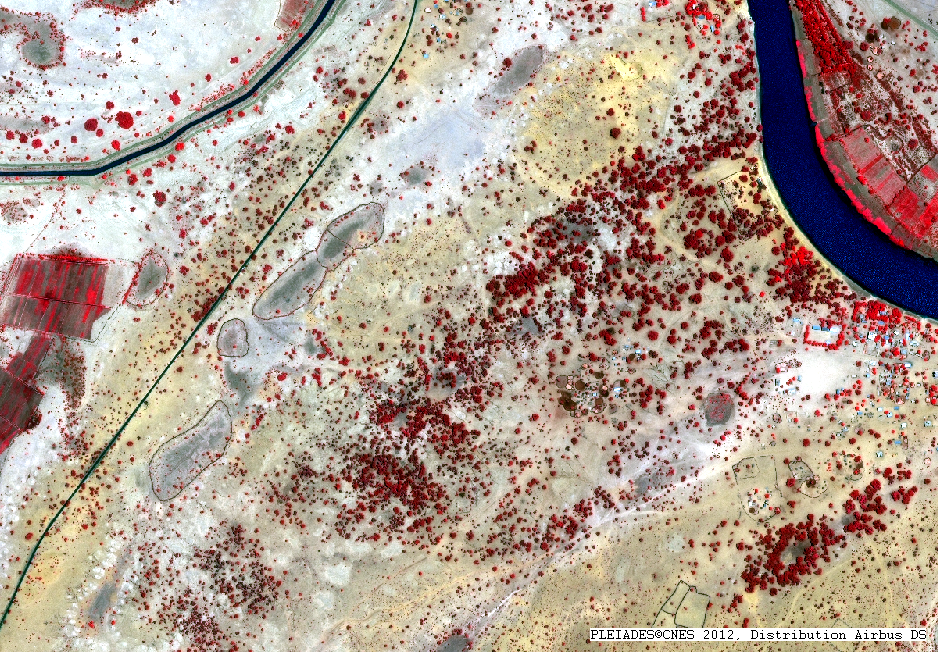 Il s’agit d’une image en composition colorée « fausse couleur » de résolution native à 0,70m, ré-échantillonnée à 0,5m. Cette image permet de mettre en évidence l’information enregistrée par le satellite dans le Proche infra-rouge. Elle donne une information supplémentaire à celle de l’œil humain. La couleur rouge correspond à des espaces végétaux ayant une activité chlorophyllienne, les espaces sombres correspondent à des espaces en eau ou humides. On note donc sur cette image la présence de cultures en pleine pousse (couleur rouge) alors que la saison sèche n’est pas encore terminée : ces cultures sont donc irriguées. Pour en savoir plus sur les compositions colorées « fausse couleurs», rendez-vous sur le site Enseignants et Médiateurs du CNES, à la rubrique Terr’Image.