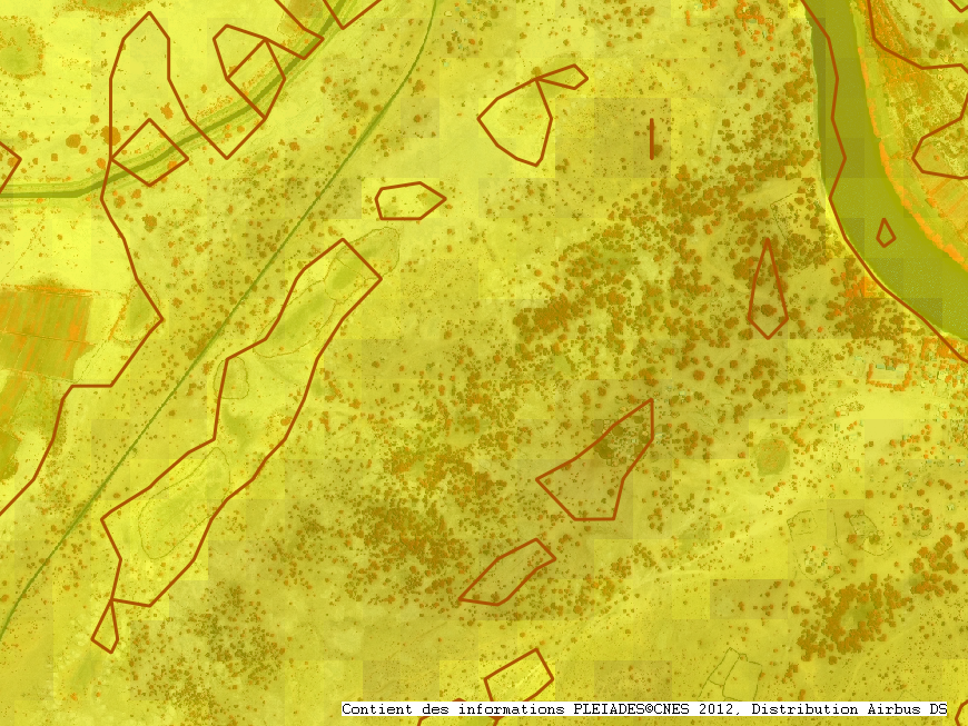Cette image a été réalisée en superposant l’image satellitaire et un Modèle Numérique de Terrain (MNT). Il s’agit d’une représentation numérique des valeurs d’altitude du relief. Ainsi les couleurs déterminent les différences d’altitude sur ce territoire sahélien. Le positionnement des cultures de décrue dans les zones basses en relation avec la rivière montre bien l’existence d’un chenal privilégié de crue. Cette submersion permet le développement des cultures dans cette zone, de sorgho par exemple. Les dunes sableuses plus élevés qui la jouxtent n’offrent pas les mêmes possibilités.