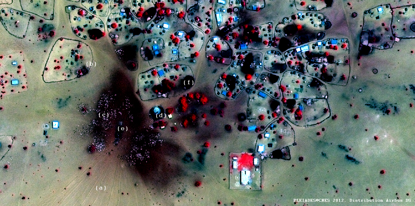 On note également sur cette image la présence à proximité des maisons de tâches de couleur noire (f) : il semble donc qu’à l’abri de barrières, des sols plus riches et/ou humides, soient présents dans les enclos familiaux. On peut y voir le développement possible dans ces villages de pasteurs de cultures vivrières basées sur le maraichage et rendues possibles par la présence d’un point d’eau.