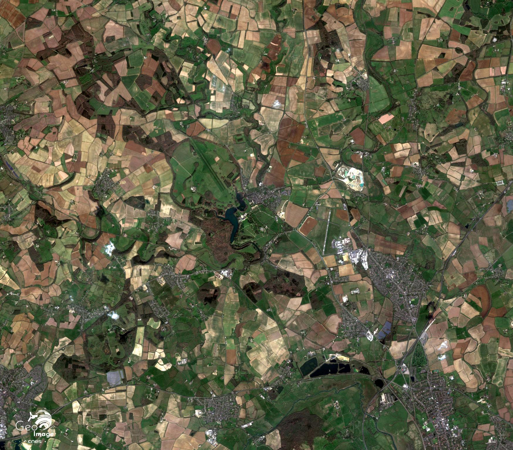 The river Thames is the central feature of the image. It flows from the north and meanders across a large flood plain nourished by the winter and spring high waters. The river has been harnessed. The main stream was modified in some places (Culham) and the many locks allow riverboats to navigate the river, a very popular activity in summer. As in the Bassin parisien (France), the flow of the Thames drainage basin is regulated by a series of dams. This prevents any disastrous flooding of the London area.