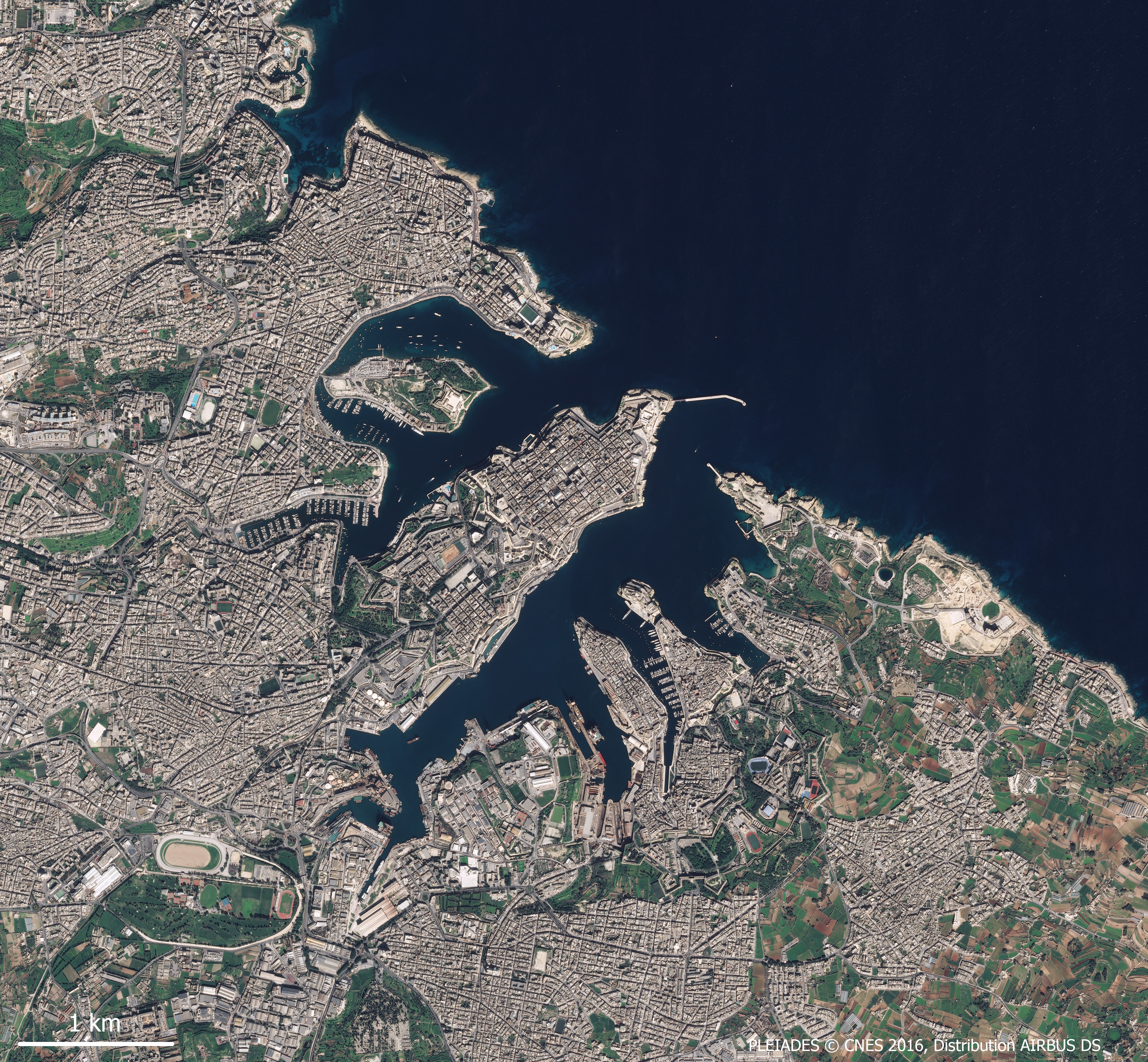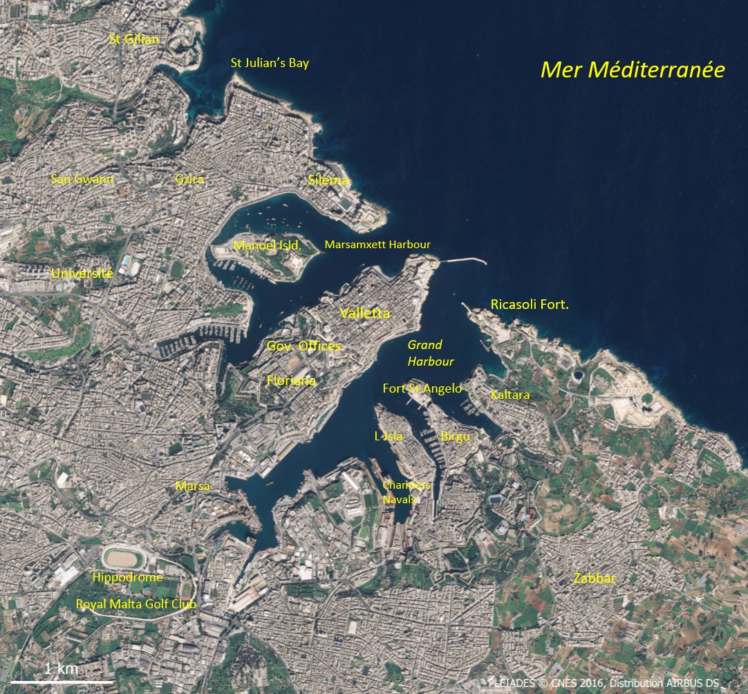 Ce promontoire domine de part et d’autre deux rades, aux formes très échancrées, profondes et refermées. Au nord, celle de Marsamxett Habour est plus ronde et centrée sur Manoel Island, bien reconnaissable par son puissant fort entouré de verdure. Celle de Grand Harbour au sud offre une série d’abris exceptionnels grâce aux pointes de Ricasoli, bien fortifiée car fermant la rade, Kalkara, Vittoriosa, dont la pointe est dominée par le Fort Saint-Ange, et Senglea.