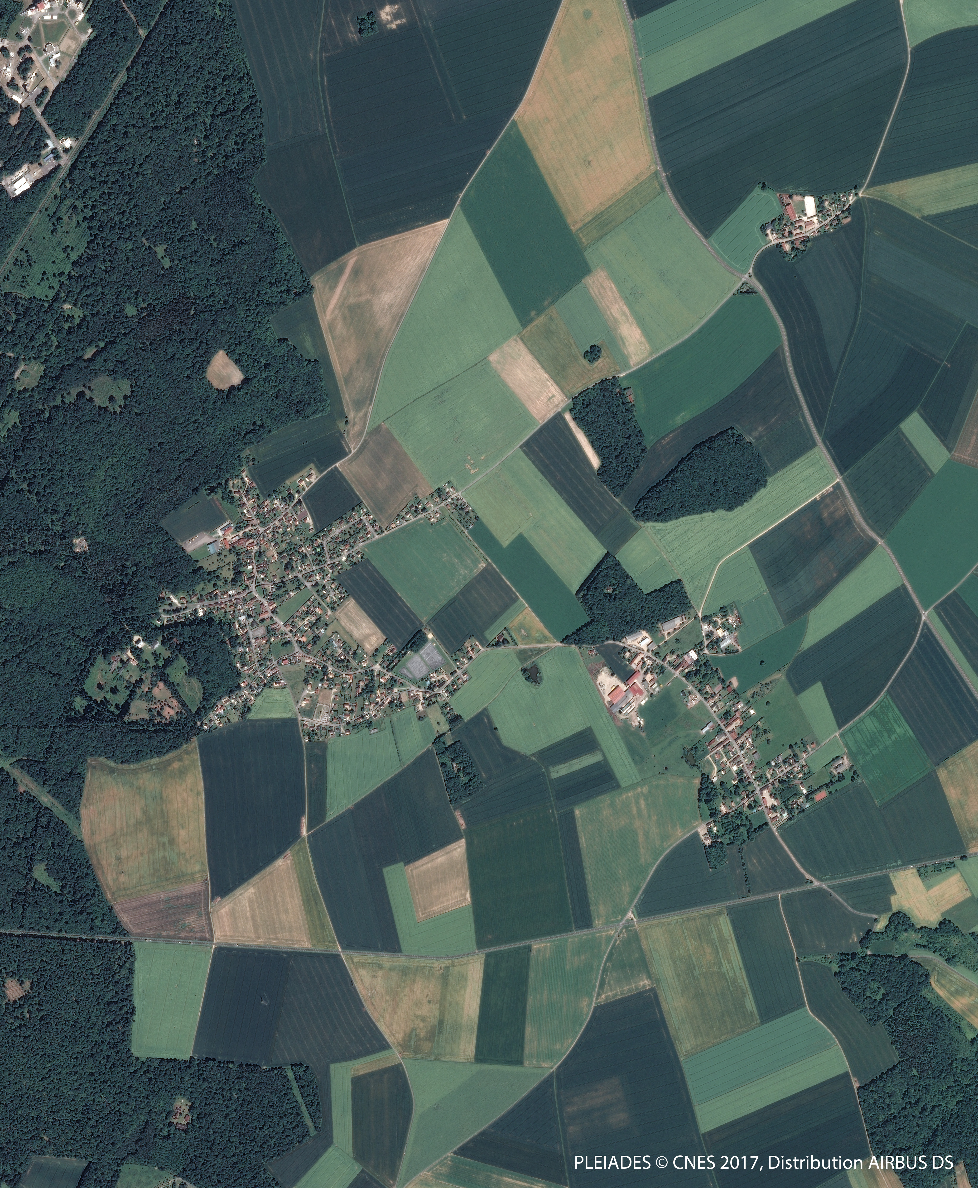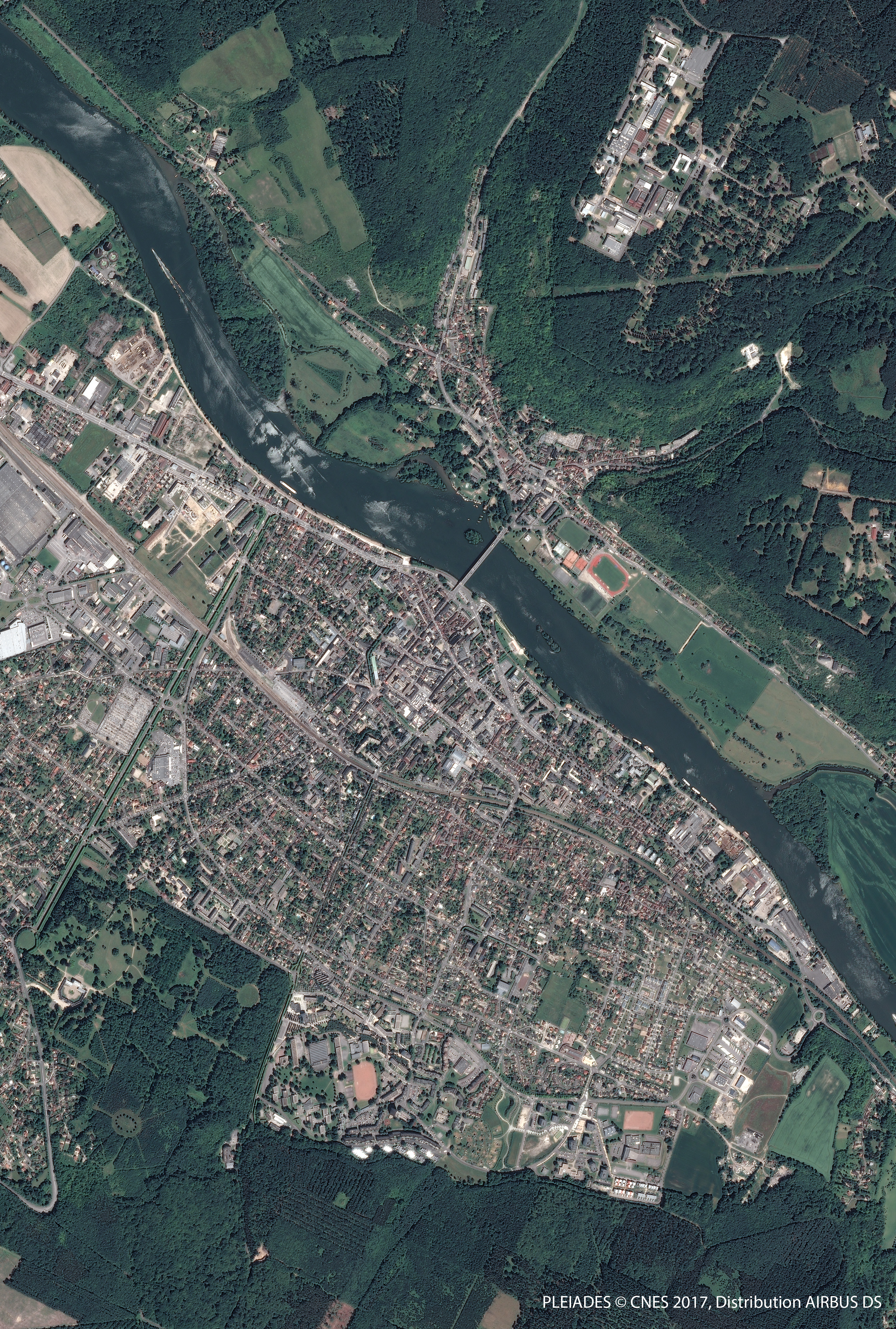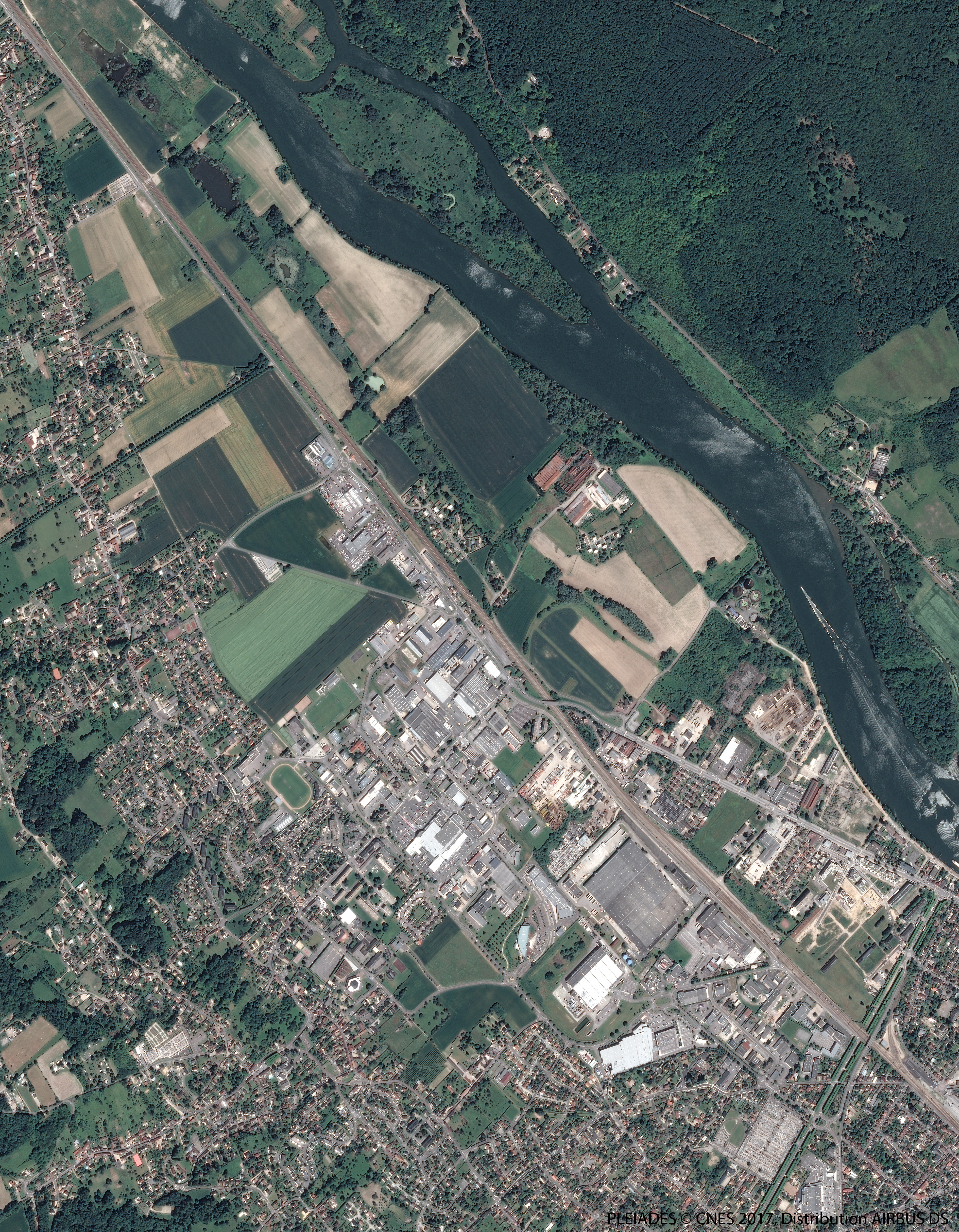 Cette image de Vernon, ville du département de l'Eure en région Normandie, a été prise le 10 juin 2017 par un satellite Pleiades. Il s’agit d’une image en couleurs naturelles, de résolution native à 0,70m, ré-échantillonnée à 0,5m.