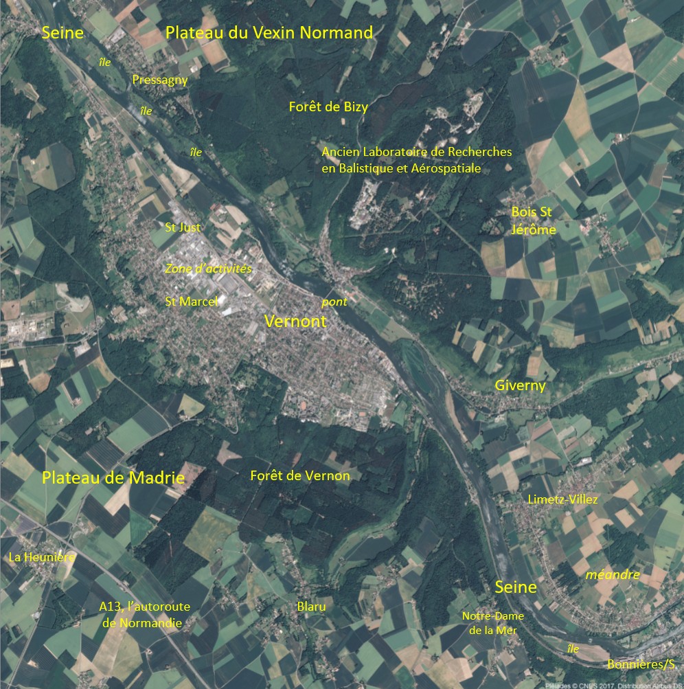L’image est traversée d’est en ouest par la large vallée de la Seine qui entaille les puissants plateaux du Vexin normand, repérables par l’important couvert forestier et la mise en valeur agricole intensive. Le couloir de la vallée de la Seine se caractérise par une forte urbanisation, centrée sur Vernon, et une importante activité industrielle, liée en particulier à l’aérospatiale.