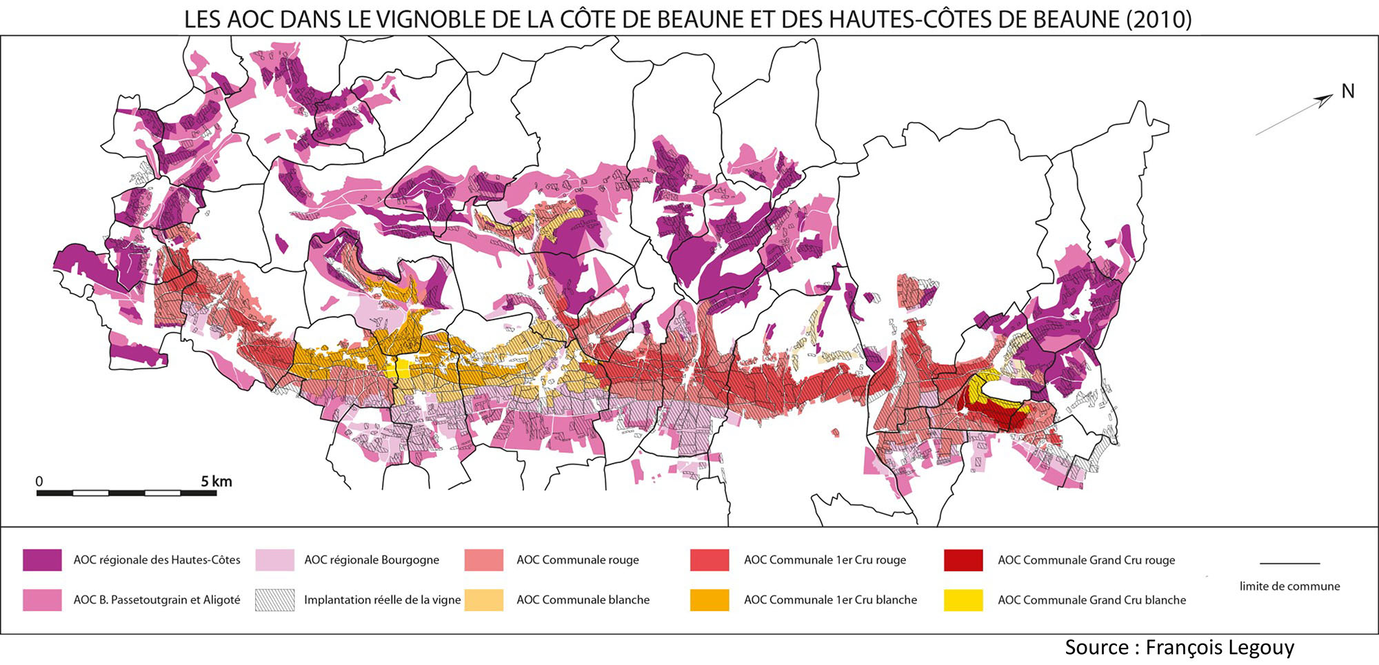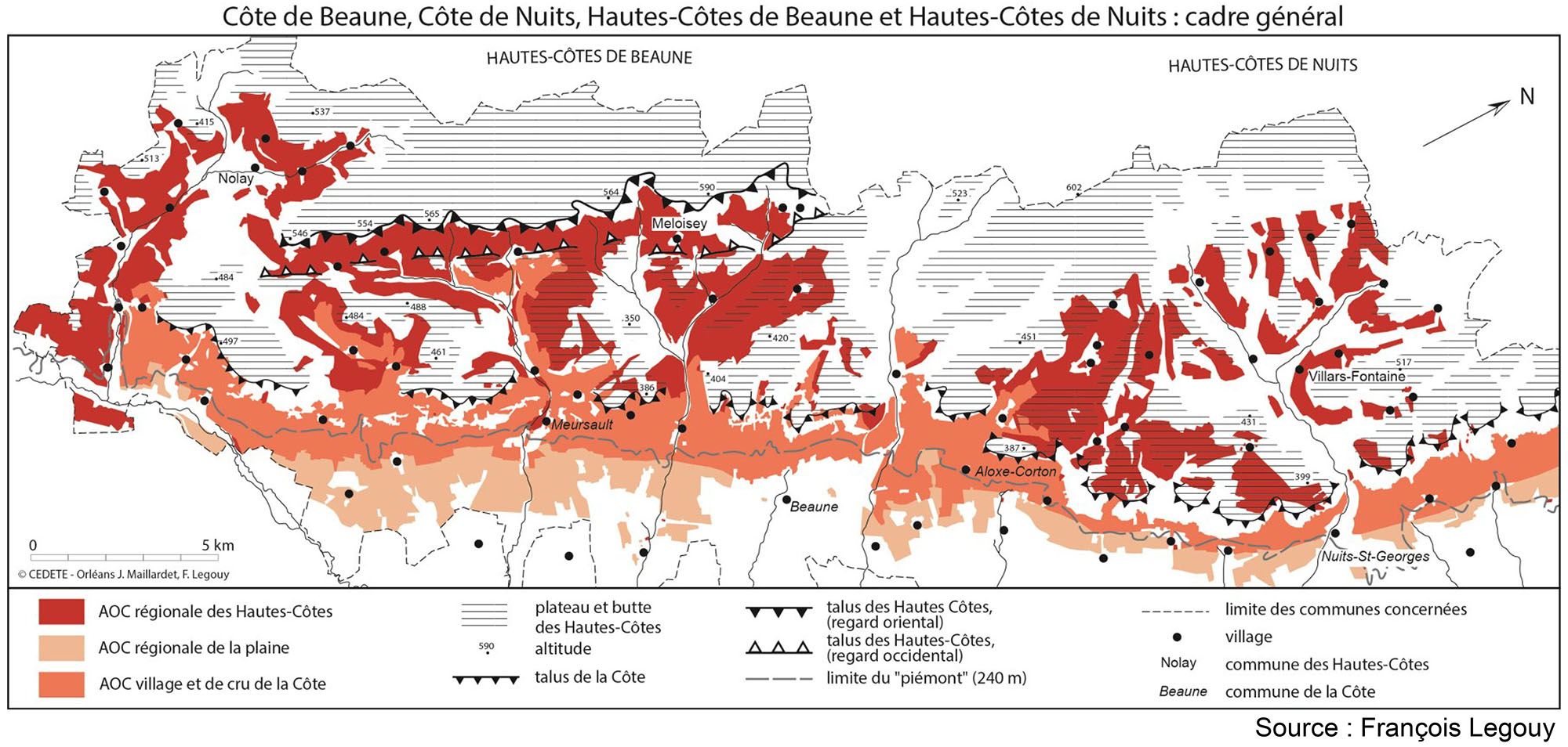 Chaque finage de village s’étend perpendiculairement aux reliefs afin de valoriser la complémentarité des terroirs. Si le village d’Aloxe-Corton est sur un site de rupture de pente comme de très nombreux villages viticoles réputés des Côtes de Nuits ou de Beaune (Vougeot, Vosne-Romanée, Pommard, Volnay, Santenay, Meursault…), ceux de Pernand-Vergelesses et de Savigny-les-Beaune sont situés en fond de combe. Les crus les plus prestigieux, les grands crus, sont situés plutôt en haut de versant du talus, auxquels succèdent les appellations villages avec ou sans 1ers crus. Les appellations régionales dominent dans les Hautes-Côtes et dans la plaine (cf. cartes).