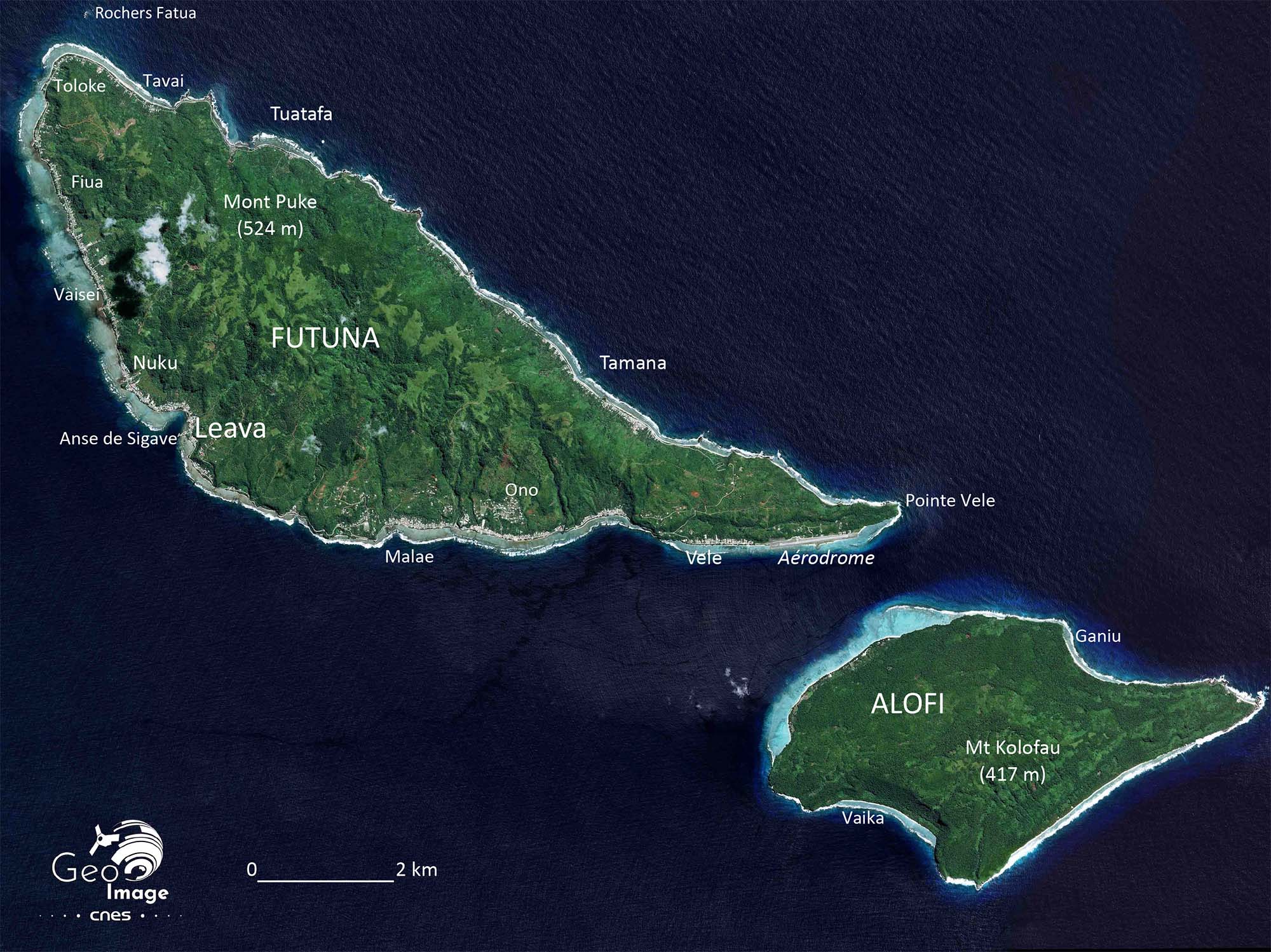 Futuna, comme le montre l’image, est un ensemble montagneux bordé par un récif frangeant plus ou moins large. Futuna avec 45 km² est la plus grande des deux îles. Elle atteint 15 km dans sa plus grande longueur, 4,5 km dans sa plus grande largeur et culmine à 524 mètres au mont Puke. Le relief est plus marqué au Nord-Ouest qu’au Sud où le mont Mamati atteint 102 mètres. On distingue au Sud-Est de Futuna l’aérodrome de Vele. Au centre de l’île, se localise la baie de Leava, seule baie et seul mouillage pour les navires qui approvisionnent l’île à raison d’une à deux rotations par mois. A l’opposé, la mise en valeur des périphéries est essentiellement agricole.