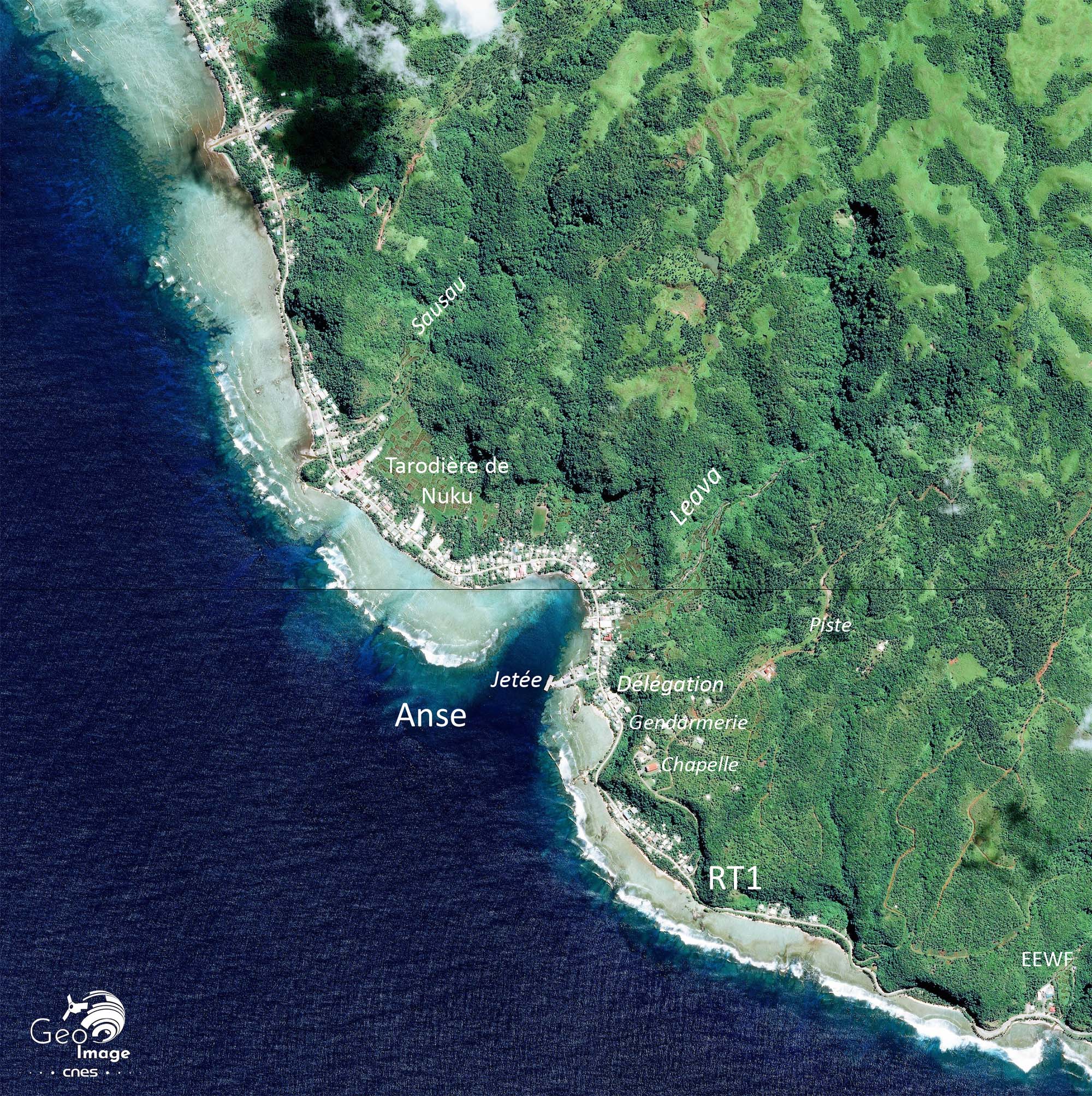 Sur l’image, on distingue bien la baie de Leava, unique mouillage de l’île situé à l’Ouest de Futuna. C’est d’ailleurs dans cette baie qu’ont débarqué en 1616 les découvreurs européens de Futuna, Schouten et Lemaire. Avec son port, elle constitue un lieu d’ouverture sur le reste de l’Océanie. Deux bateaux approvisionnent avec leurs conteneurs l’île tous les mois.