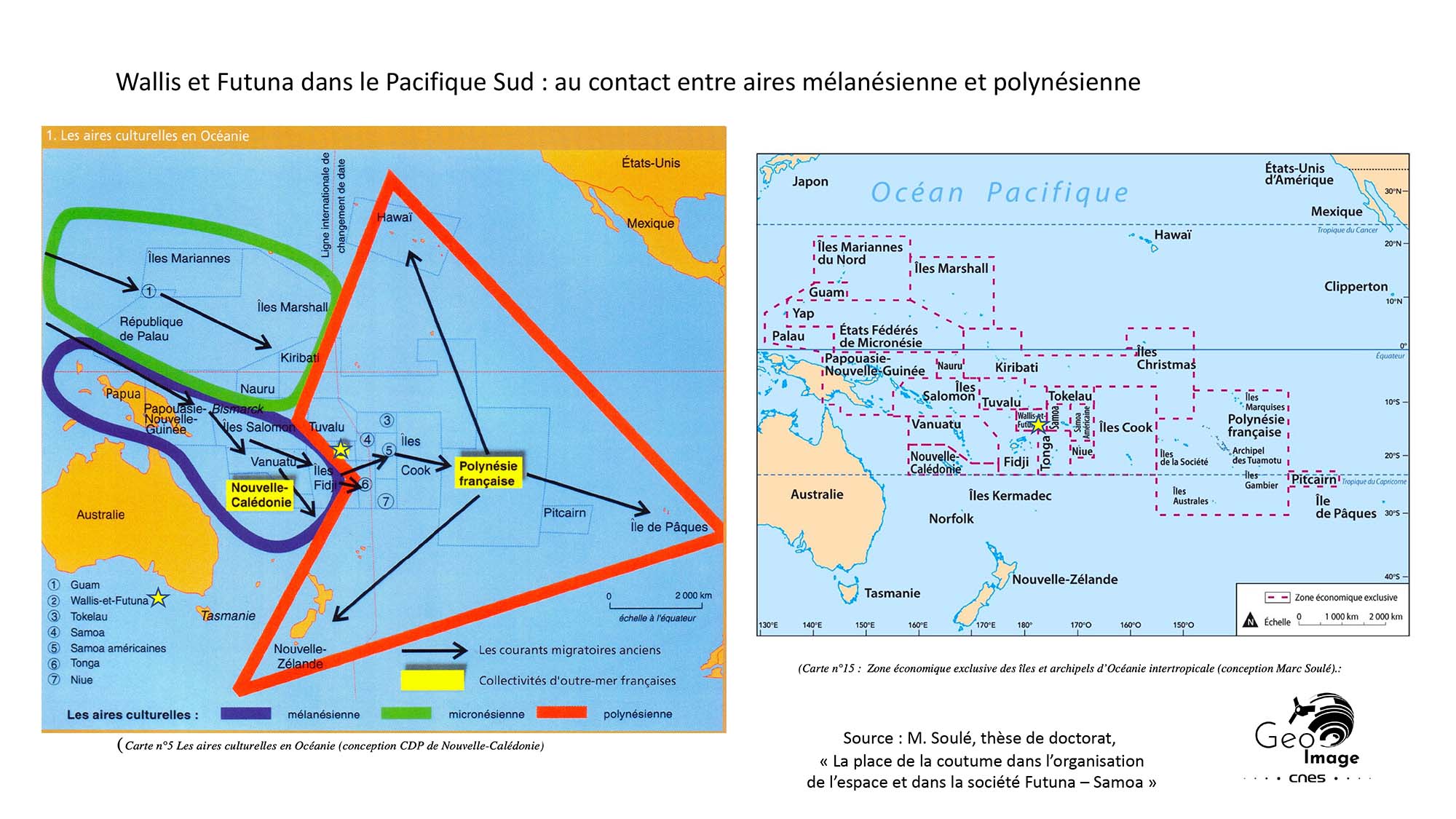 Dans le pacifique Sud, Wallis et Futuna se trouvent au contact de deux aires culturelles : la Mélanésie, monde de hautes terres aux faibles densités (Fidji, Nouvelle-Calédonie, Vanuatu, Papousie-Nouvelle Guinée), à l’ouest et le monde polynésien à l’est (Samoa, Tonga, Niue, îles Cook, Polynésie française...).