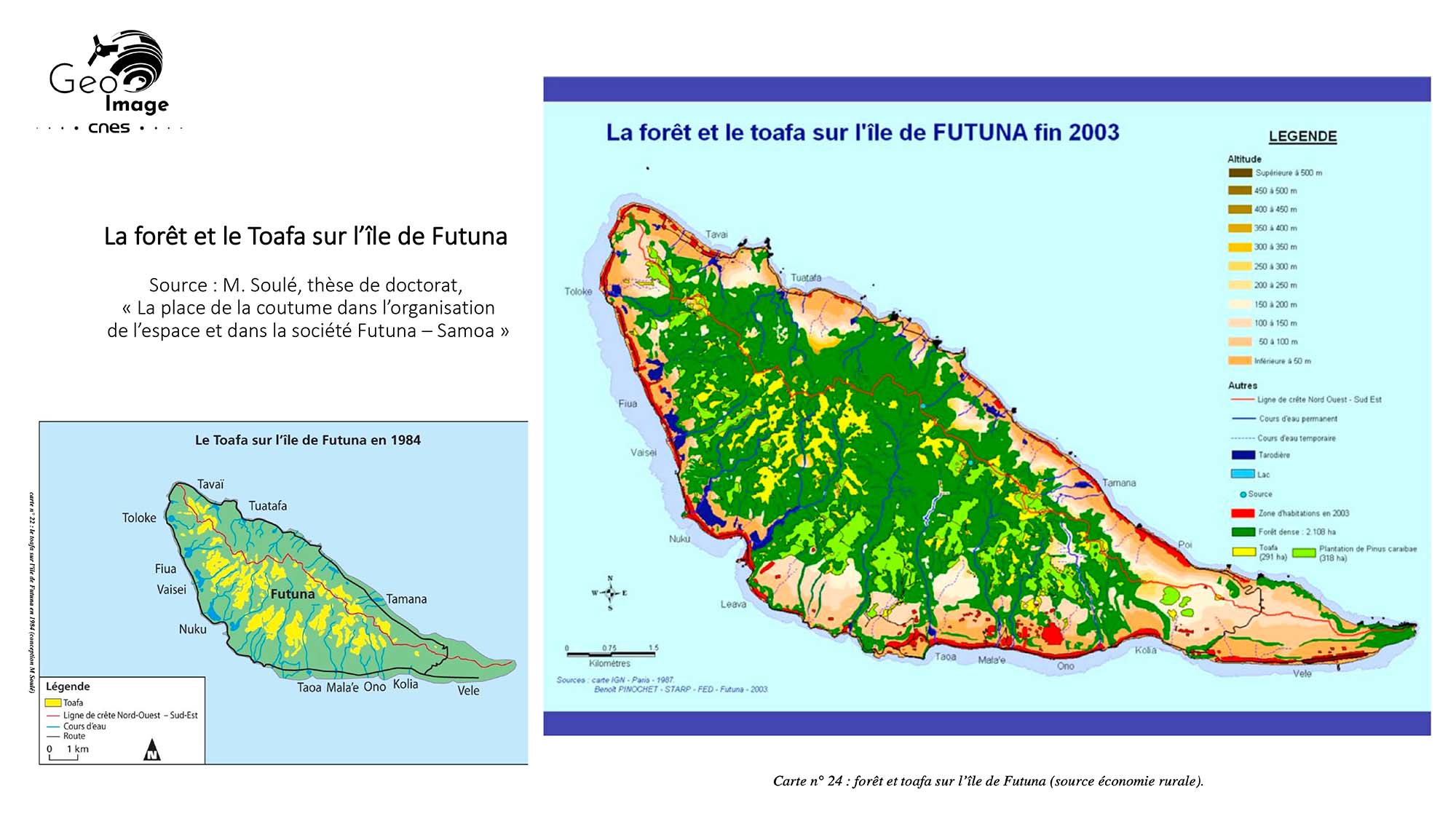 Au cœur de l’océan Pacifique au contact des aires mélanésienne et polynésiennes, les îles Horn - composée de Futuna et Alofi - appartiennent à la collectivité d’Outre-Mer de Wallis et Futuna. Située à plus de 16 000 km de la France métropolitaine, elle est comprise entre Tuvalu au nord, les Fidji au sud-ouest et les Samoa à l’est. Ce statut territorial spécifique permet à Futuna le maintien de deux royaumes coutumiers polynésiens aux fortes spécificités. Face à des contraintes fortes (isolement, côte récifale, cyclones, séismes), l’organisation de l’espace juxtapose plusieurs clés de lecture : pôle de Leava/ couronne villageoise, intérieurs/littoraux, Futuna/Alofi non peuplée...