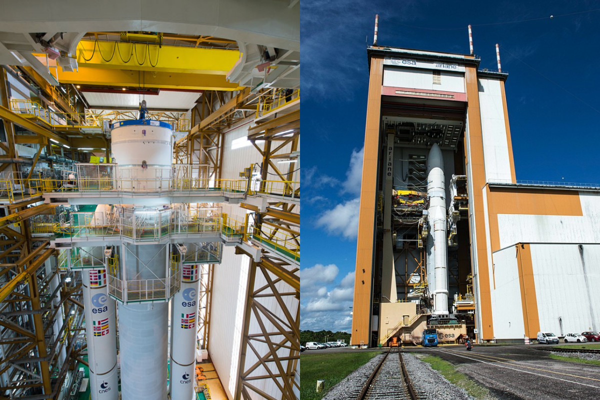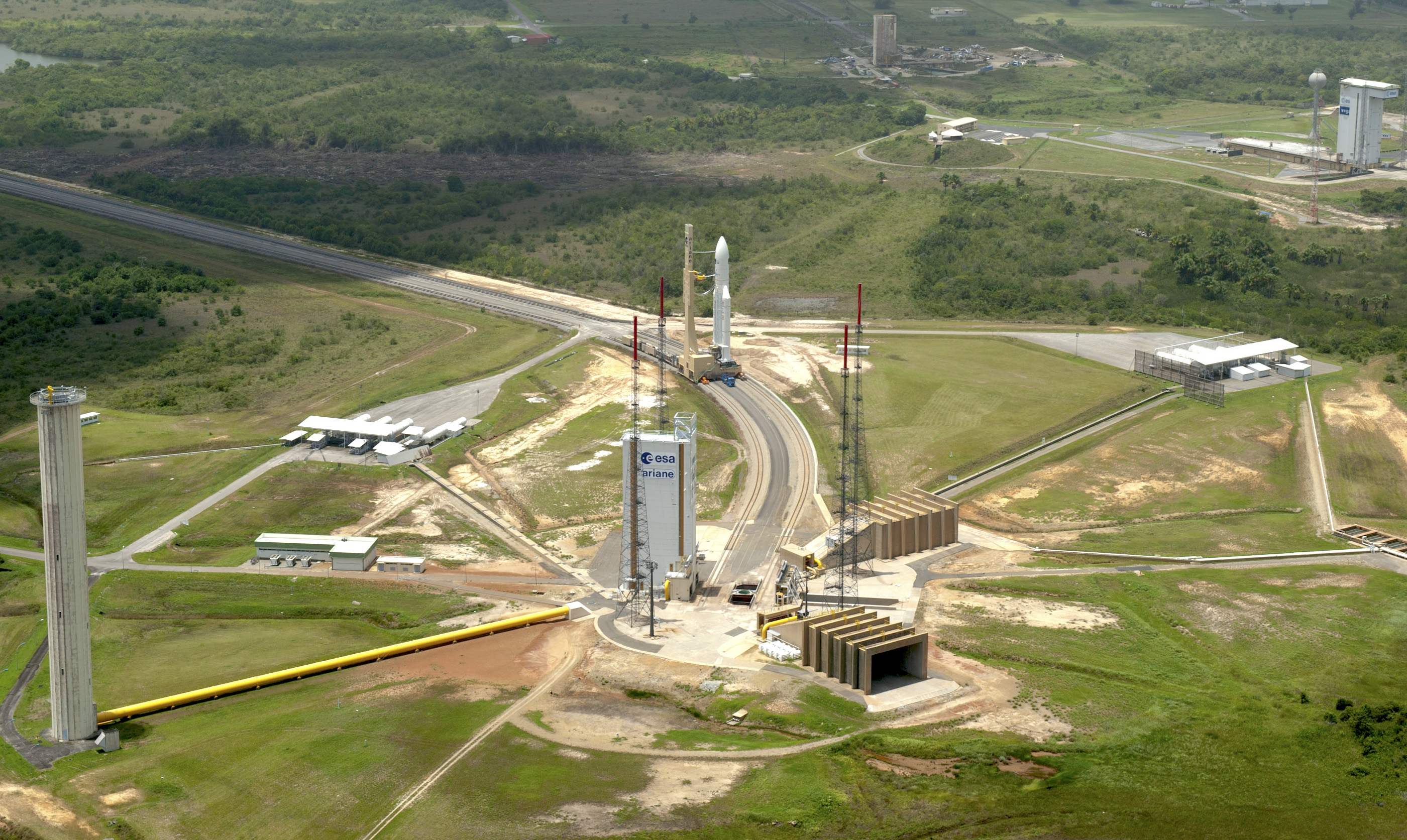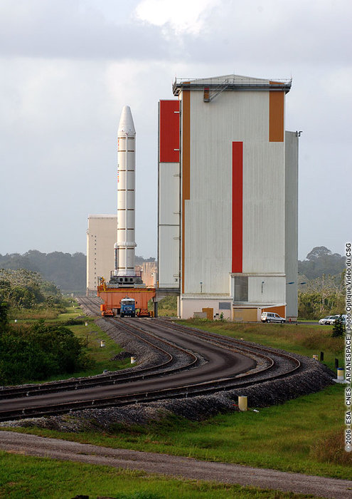 - Bâtiment d’Assemblage Final (BAF, visite virtuelle) : c’est dans ce bâtiment climatisé de 90 mètres de haut qu’avait lieu l’intégration de la charge utile. La coiffe contenant les satellites était posée au sommet du lanceur, qui après environ une semaine de préparations et vérifications était prêt pour rejoindre son pas de tir. Le remplissage de l'hélium avait lieu 22 heures avant le lancement. Mais le remplissage des ergols cryogéniques avait lieu au dernier moment au pas de tir, en raison de leur température qui doit être maintenue à -183°C pour le dioxygène liquide, et -253°C pour l’hydrogène liquide.