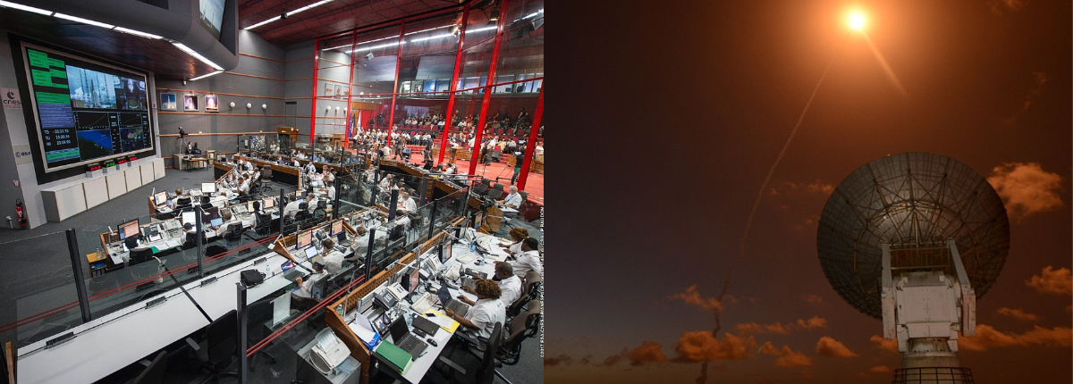 - stations de localisation et de télémesure : après le lancement, les stations dites « en aval » prenaient le relais au-dessus de l’Atlantique et de l’Afrique pour transmettre au CSG les informations envoyées par Ariane 5. La station Galliot de Kourou (visite virtuelle), sur la corne sud de la Montagne des Pères était la première sur sa trajectoire, aussi bien vers l’est que vers le nord.