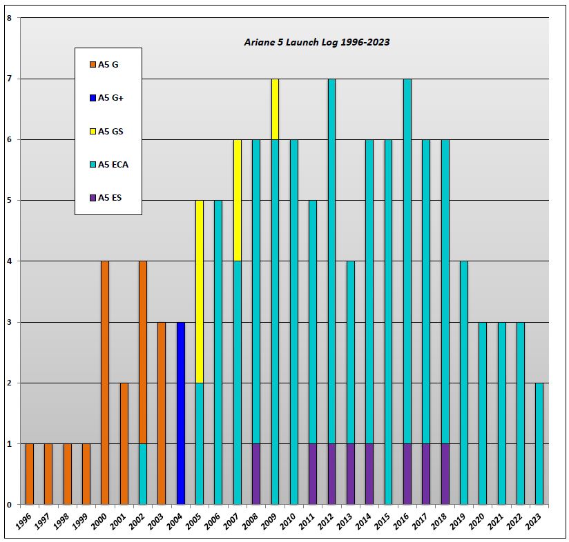 - ECA : commercialisée entre 2002 et 2023, elle bénéficiait par rapport à Ariane 5G d’une amélioration de ses deux étages. Avec 84 lancements à son actif en décembre 2023, Ariane 5 ECA était la dernière et unique version commercialisée depuis la fin d’Ariane 4 en 2003 et d’Ariane 5 ES en juillet 2018.