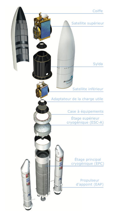 Structure porteuse : lorsque plusieurs satellites étaient installés au sommet d’Ariane 5, plusieurs structures porteuses étaient disponibles pour les maintenir en place jusqu’à leur orbite.