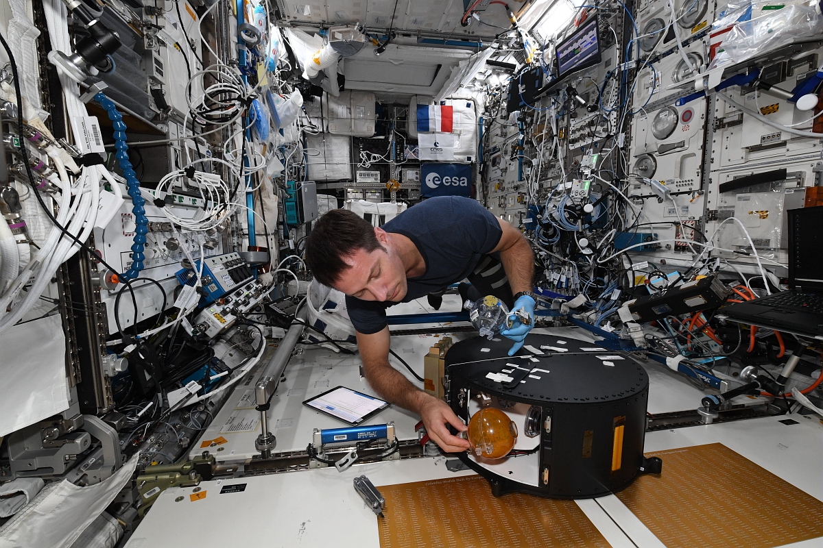 Les sphères sont remplies d’un liquide : de l’eau (pour les expériences liées à l’étude des turbulences d’onde), ou un liquide dont les propriétés se rapprochent de celles des ergols utilisés pour les satellites.