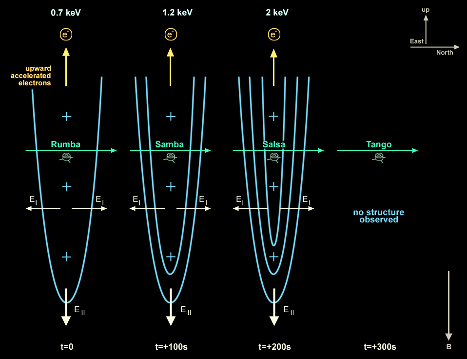 Jusqu’ici, les satellites utilisés pour étudier ces phénomènes n’étaient envoyés qu’un par un. Cela permettait de « cartographier » l’espace, mais pas de suivre les phénomènes rapides et turbulents. Pour aller plus loin, l’agence spatiale européenne (ESA) a lancé en 2000 le projet Cluster : quatre satellites identiques volant en formation tétraédrique.